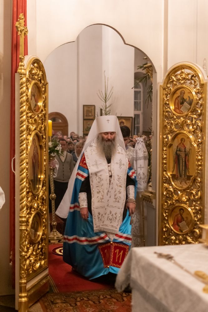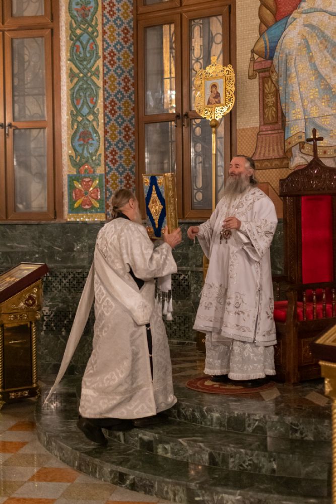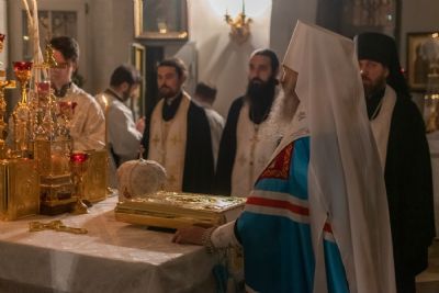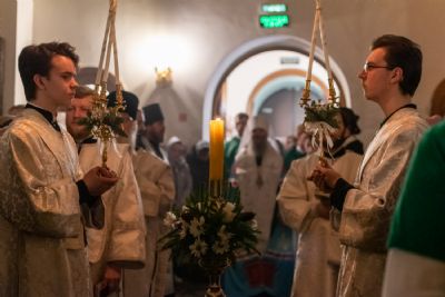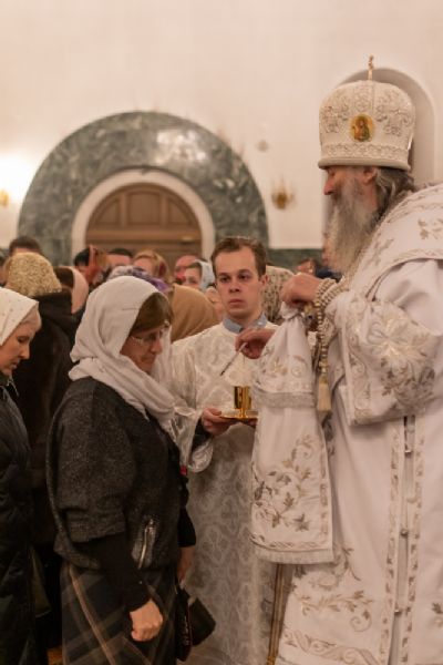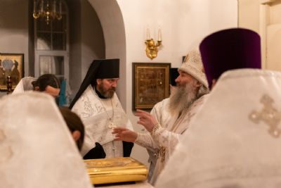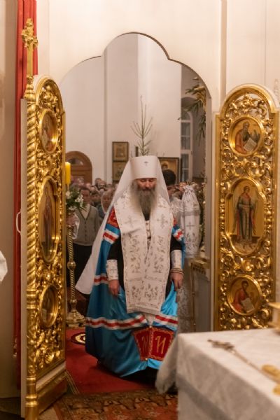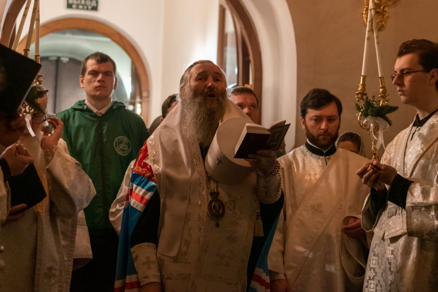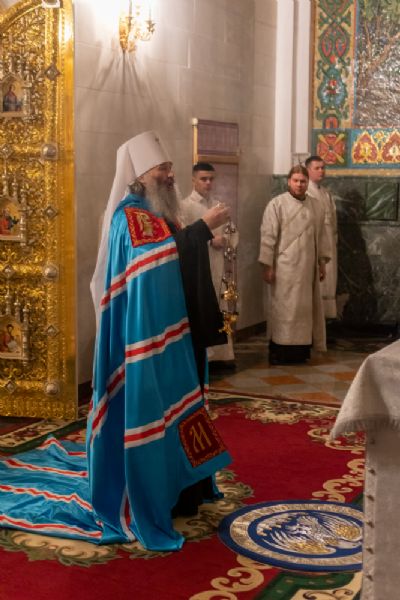 Богослужение началось торжественной встречей архиерея. В честь праздника освящали хлеба, пшеницу, вино и елей. В начале чтения праздничного канона помазание святым елеем в центре храма совершал митрополит Иоанн.