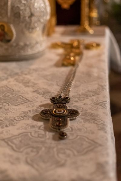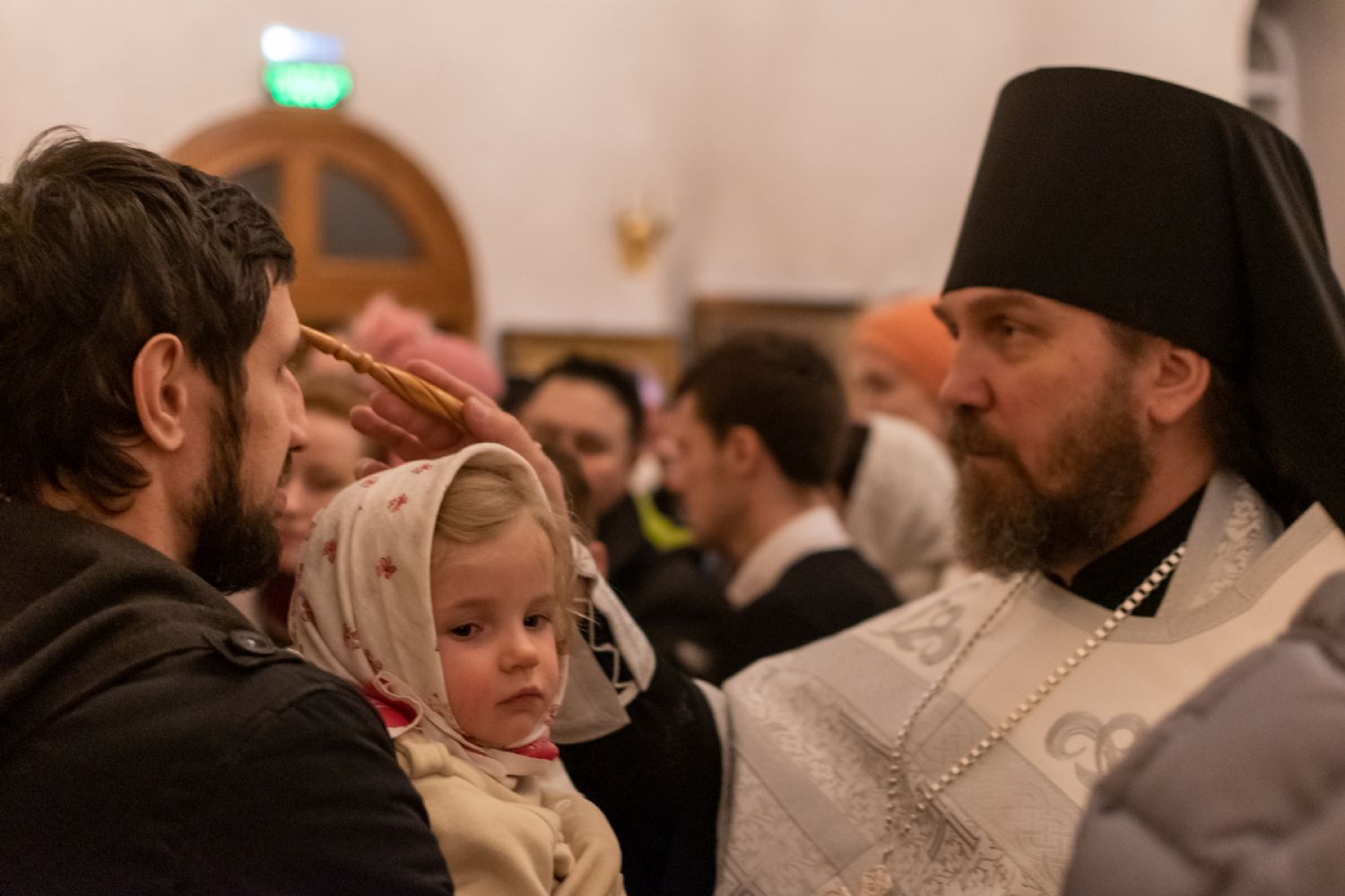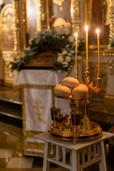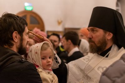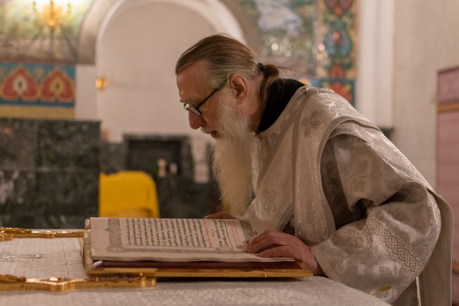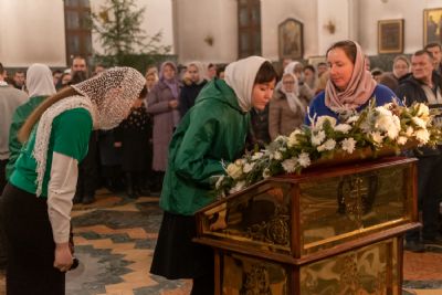 Богослужение началось торжественной встречей архиерея. В честь праздника освящали хлеба, пшеницу, вино и елей. В начале чтения праздничного канона помазание святым елеем в центре храма совершал митрополит Иоанн.