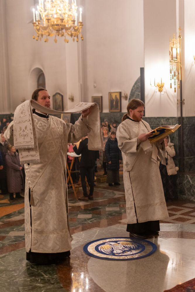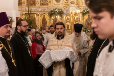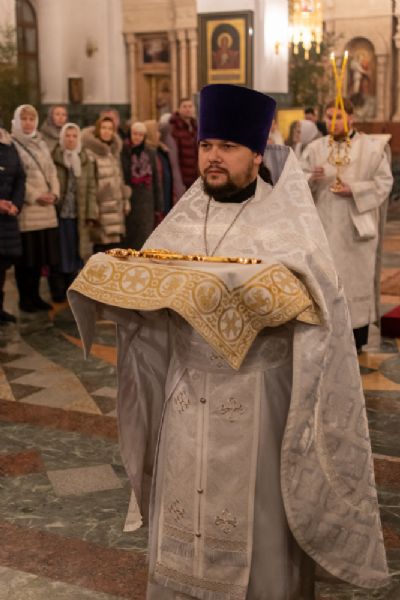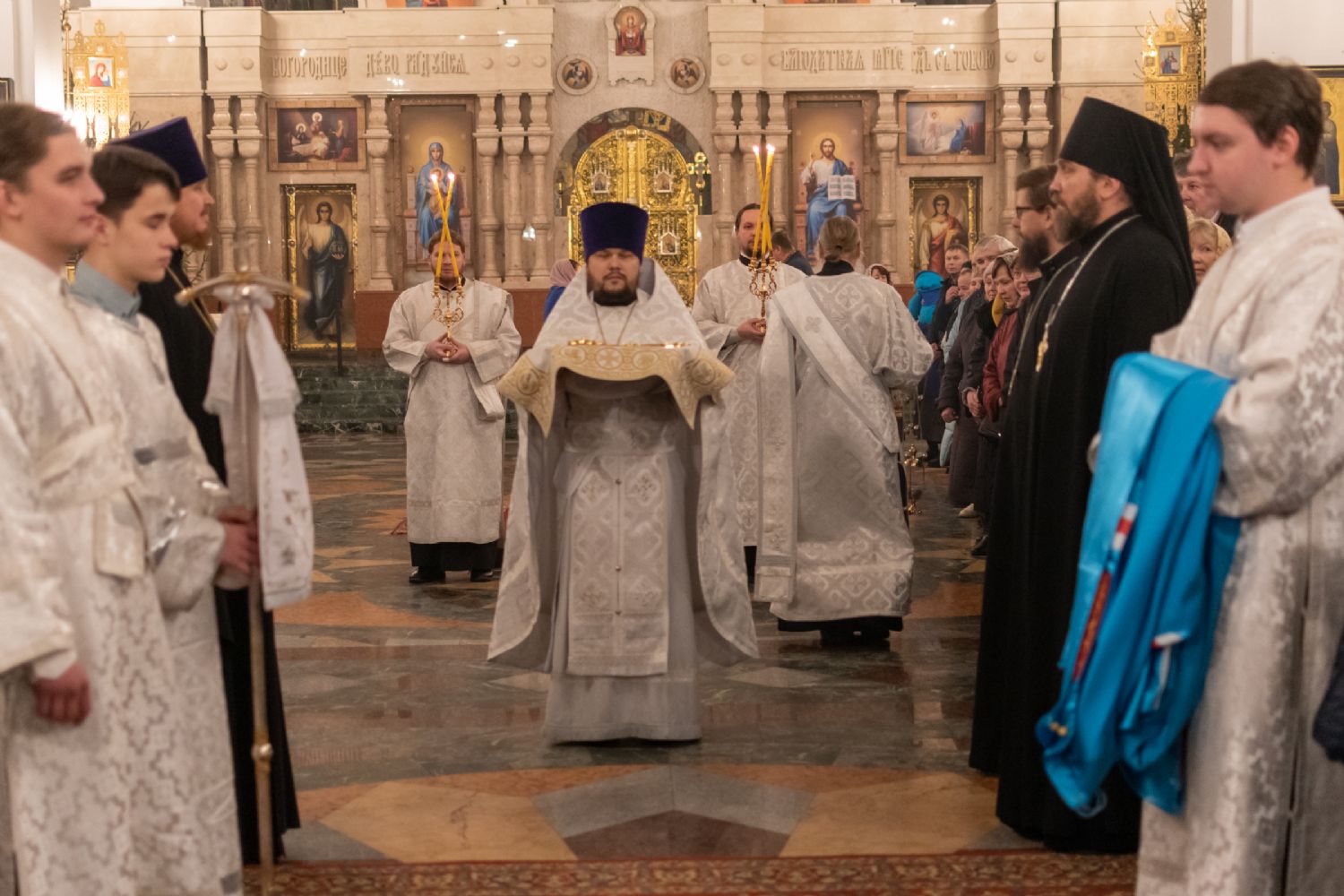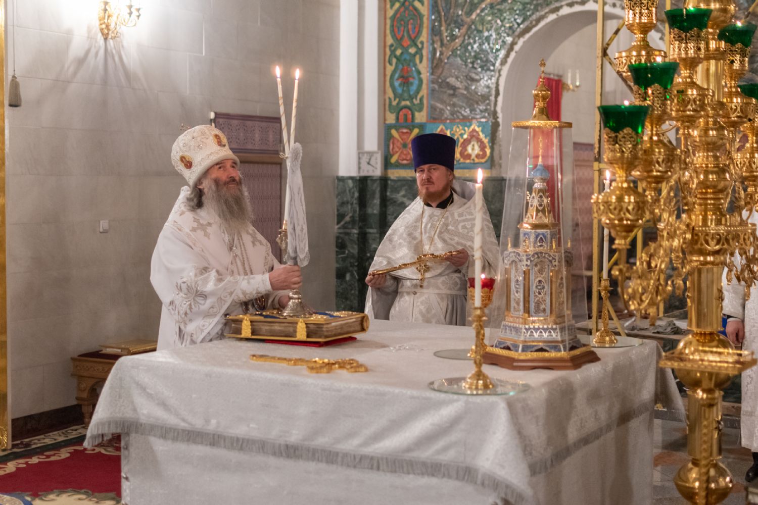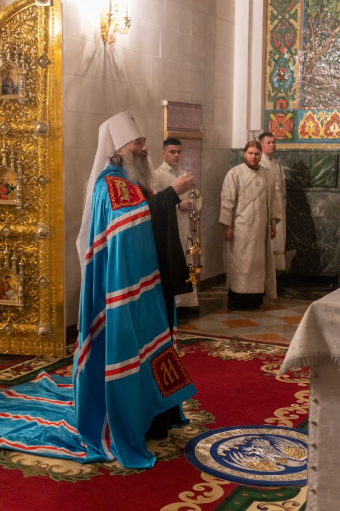 Владыке сослужили секретарь Йошкар-Олинского епархиального управления иеромонах Серафим (Пасанаев), ключарь собора протоиерей Сергий Поглазов, клирики собора иереи Никифор Захаров, Евгений Самойлов. диаконы Андрей Дружинин, Игорь Коваль и клирик храма Рождества Пресвятой Богородицы с. Семеновка протодиакон Михаил Козловский. Песнопения исполняли младшая и старшая группы детско-юношеского хора "Благовест". За Богослужением помогали православные добровольцы. Богослужение началось торжественной встречей Владыки.