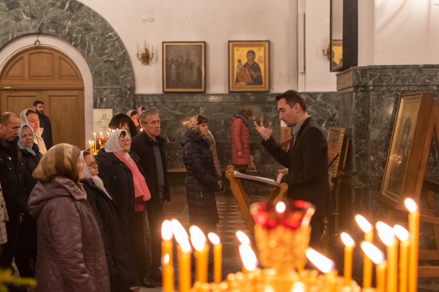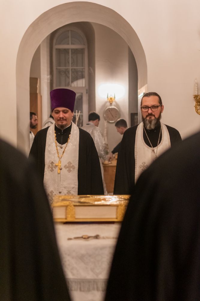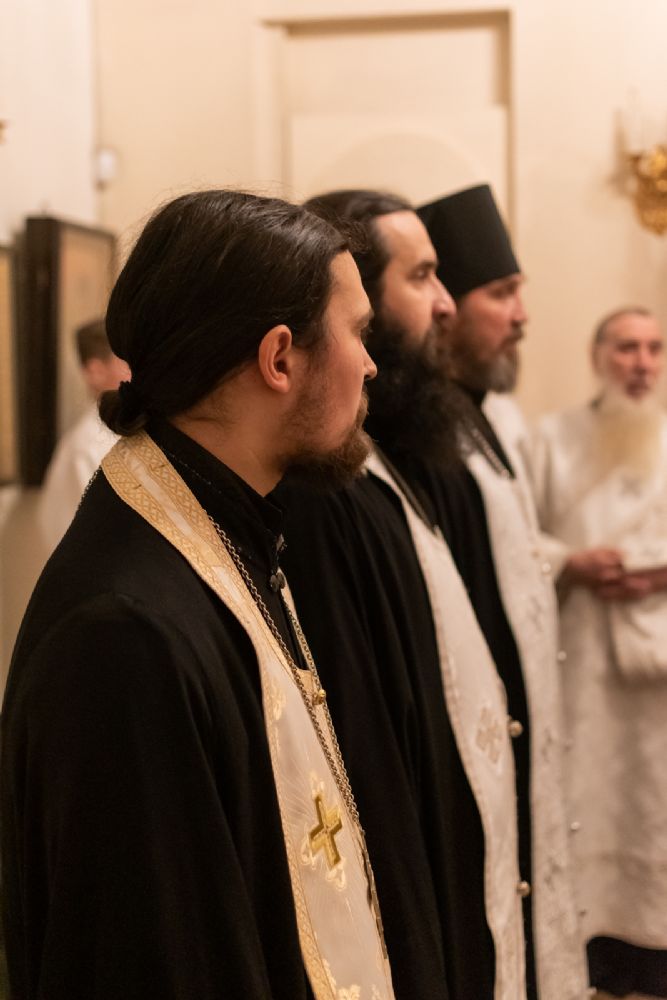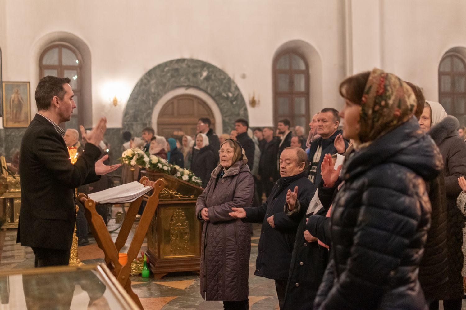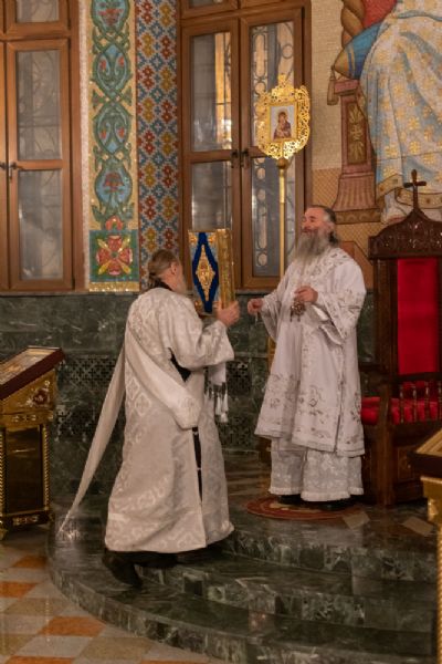Владыке сослужили секретарь Йошкар-Олинского епархиального управления иеромонах Серафим (Пасанаев), ключарь собора протоиерей Сергий Поглазов, клирики собора иереи Никифор Захаров, Евгений Самойлов. диаконы Андрей Дружинин, Игорь Коваль и клирик храма Рождества Пресвятой Богородицы с. Семеновка протодиакон Михаил Козловский. Песнопения исполняли младшая и старшая группы детско-юношеского хора "Благовест". За Богослужением помогали православные добровольцы. Богослужение началось торжественной встречей Владыки.