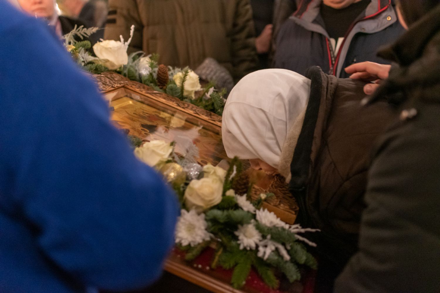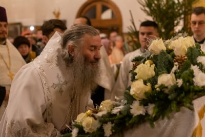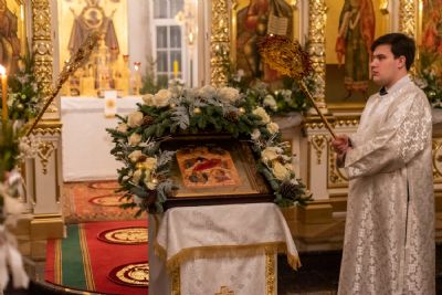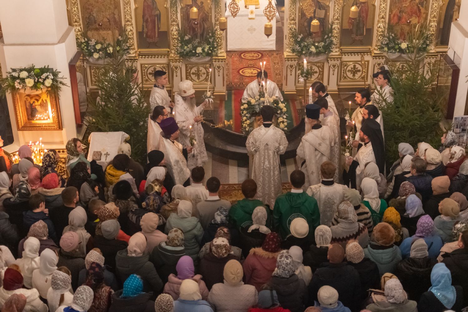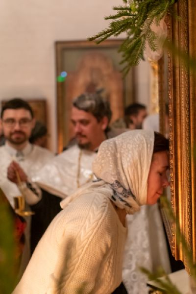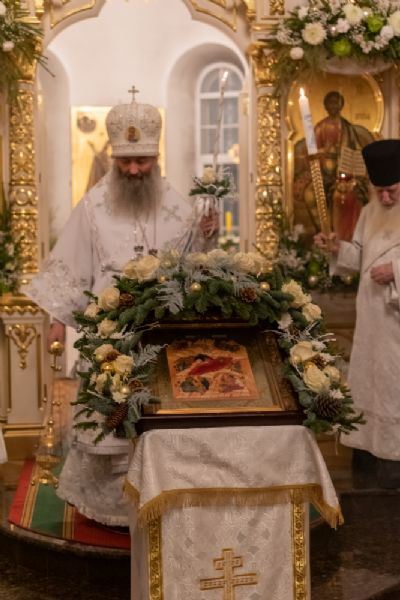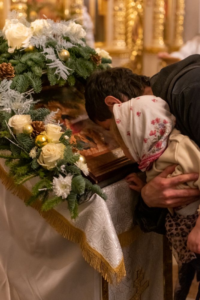 После Литургии священство совершило славление праздника перед иконой Рождества Христова в центре храма.