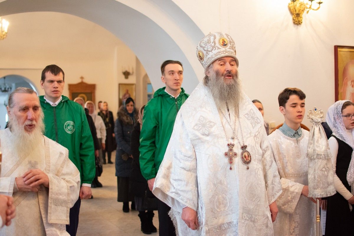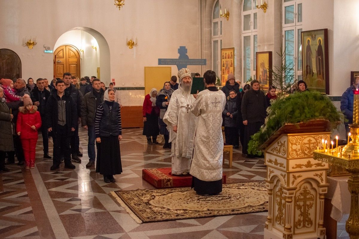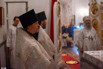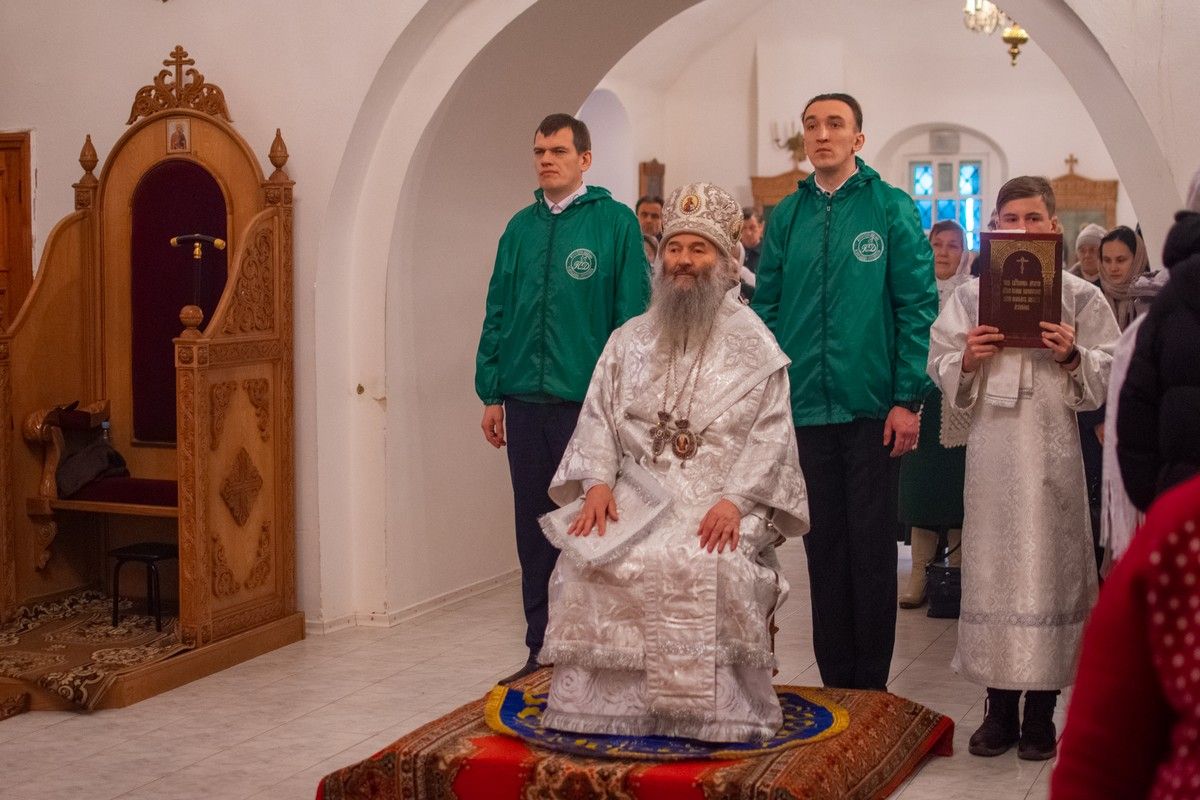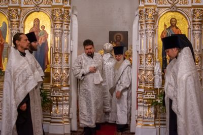 Владыке сослужили секретарь Йошкар-Олинского епархиального управления иеромонах Серафим (Пасанаев), настоятель собора иерей Алексий Кирюшкин, клирики собора иереи Леонид Вылекжанин, Андрей Кочаков, диакон Алексий Кузнецов и клирик храма Рождества Пресвятой Богородицы с. Семеновка протодиакон Михаил Козловский. Песнопения исполняли хор собора.