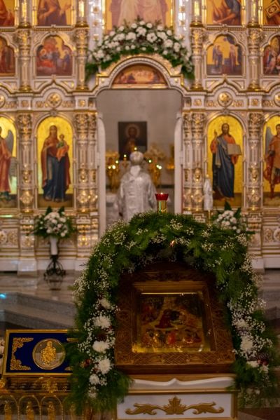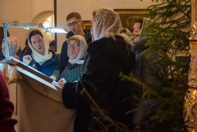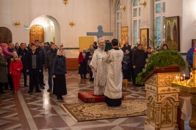 Богослужение началось торжественной встречей Владыки и облачением в центре храма. Перед отпустом Литургии было совершено славление празднику Рождества Христова в центре храма перед праздничной иконой.