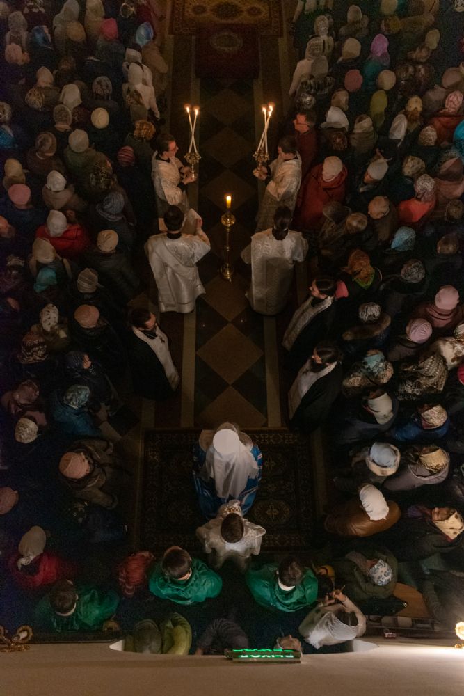 Всенощное бдение, состоящее из Великого повечерия и утрени, началось торжественной встречей Архипастыря.