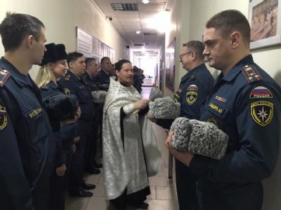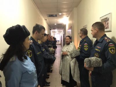 Иерей Димитрий совершил освящение воды, во время которого присутствовал личный состав главного управления МЧС. После водосвятия он окропил святой водой присутствующих, служебные помещения пожарных частей и технику.