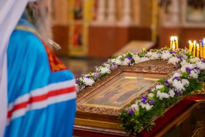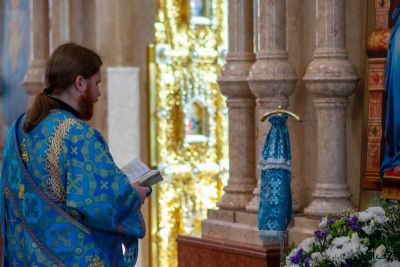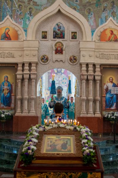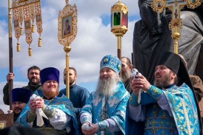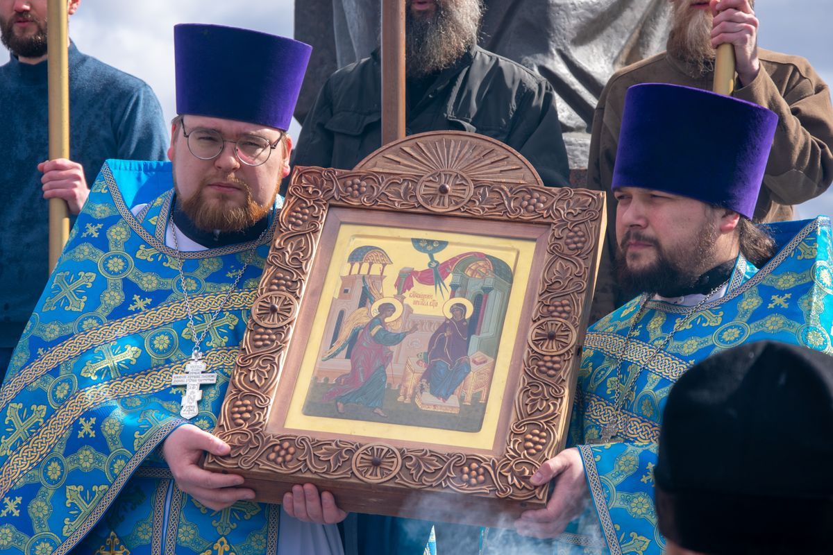 По традиции, сложившейся за последние годы, священство и миряне подошли к скульптурной композиции «Пресвятая Богородица с Младенцем Христом». Здесь православные вознесли совместную молитву Покровительнице нашего края. Владыка благословил всех молящихся, осенив праздничной иконой на четыре стороны, а иеромонах Серафим окропил молящихся святой водой.