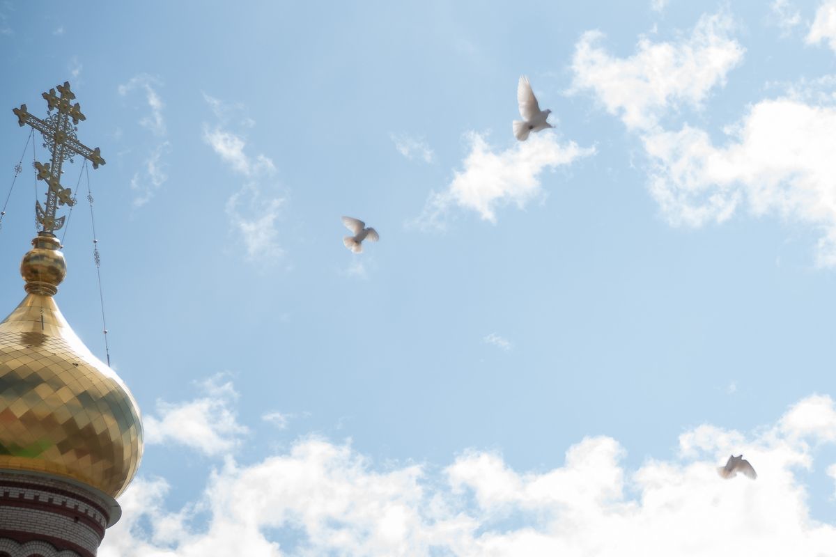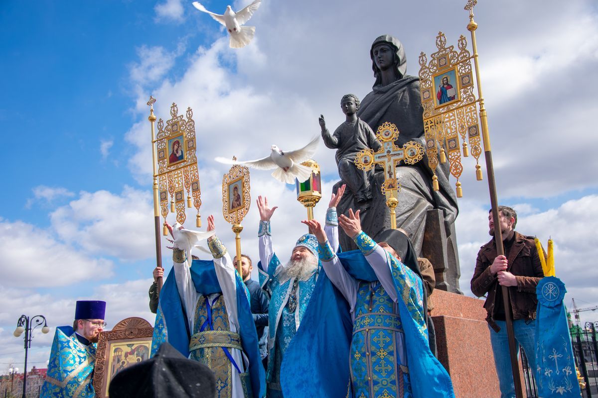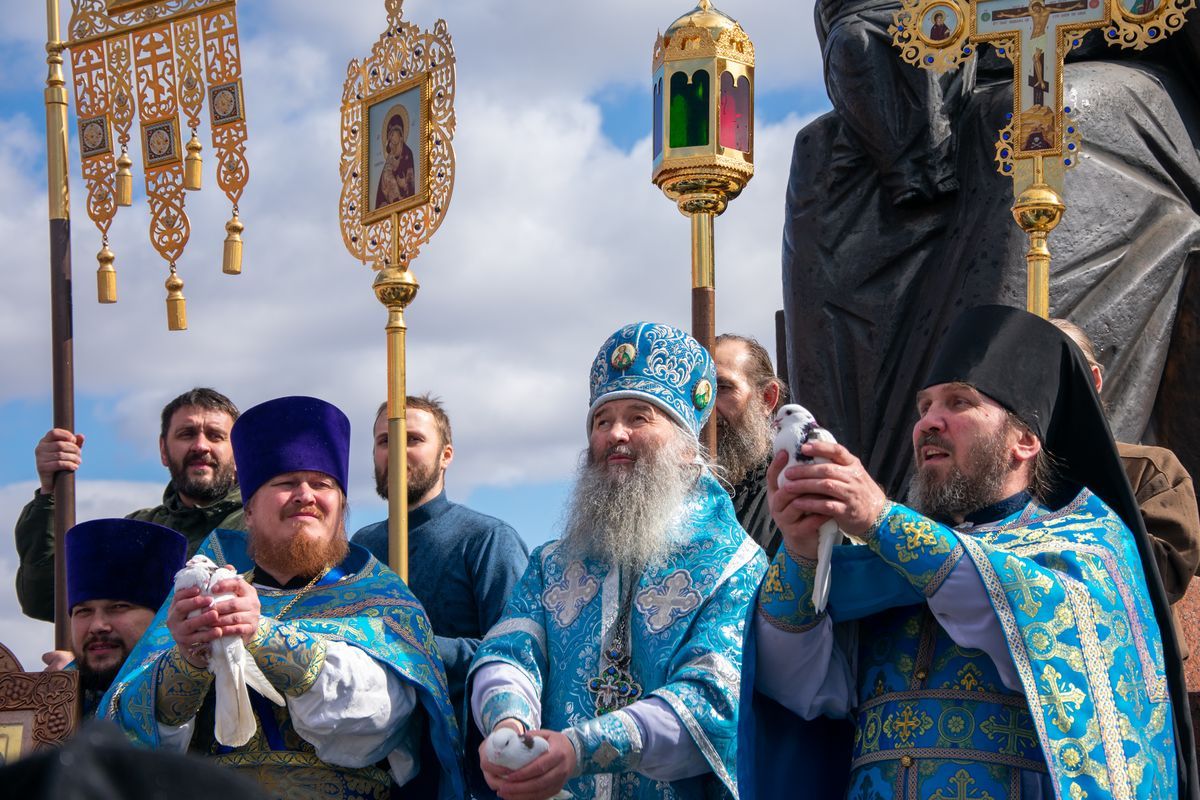 Там же у памятника под пение молитвы «Архангельский глас» митрополит Иоанн, иеромонах Серафим и протоиерей Сергий выпустили в небо белых голубей.