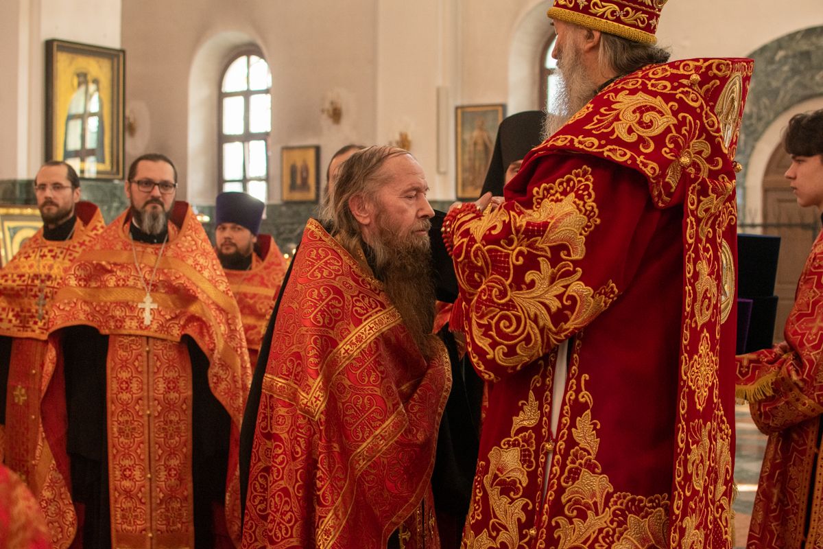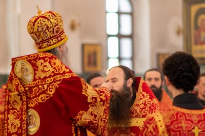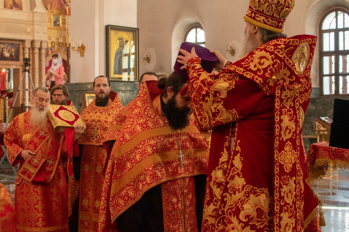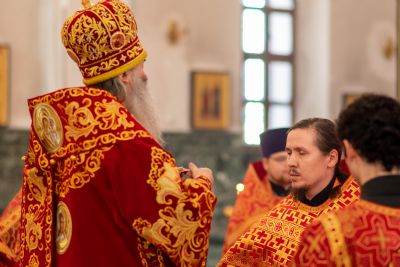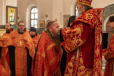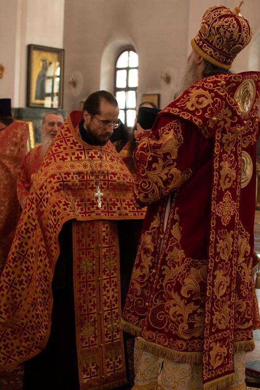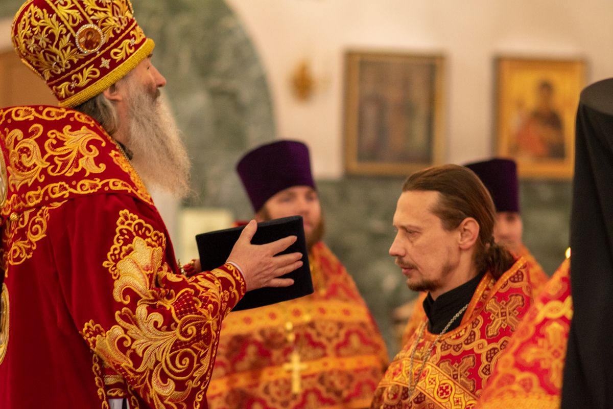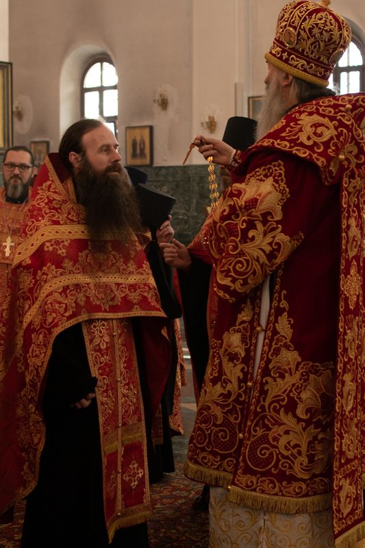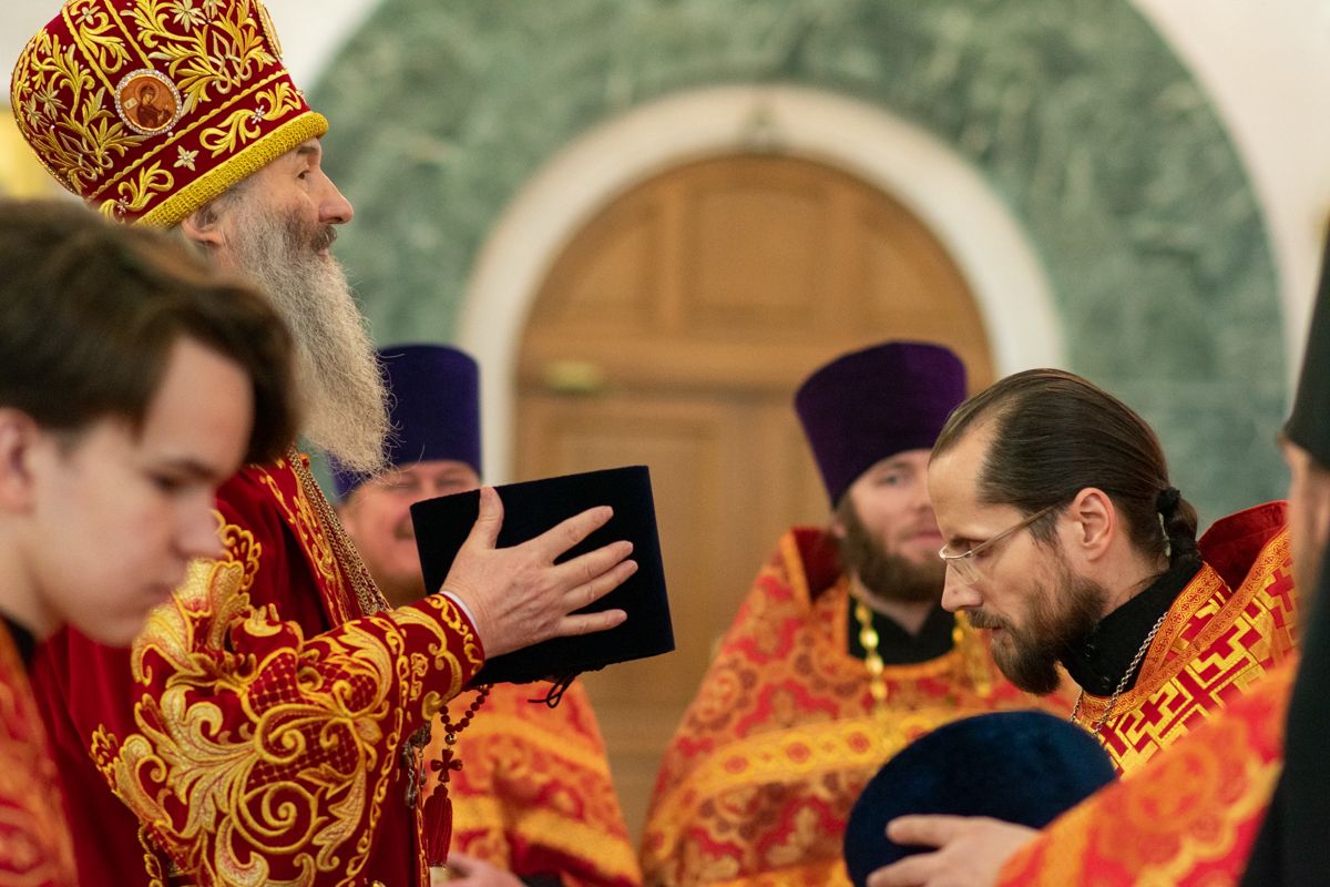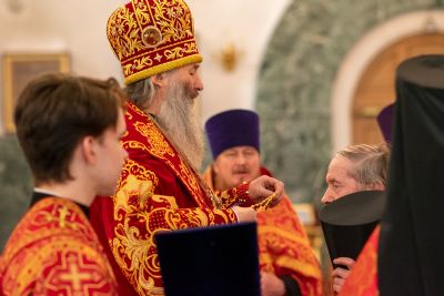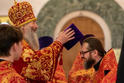 На входе с Евангелием Владыка вручил клирикам епархии богослужебно-иерархические награды: право ношения золотого наперстного креста настоятелю Воскресенского собора иерею Алексею Кирюшкину, настоятелю храма Иверской иконы Божией Матери г. Йошкар-Ола иерею Михаилу Горицкому, клирику храма Рождества Пресвятой Богородицы с. Семеновка иерею Сергию Асланову, старшему священнику Богородице-Сергиевого монастыря священноиноку Паисию (Киселеву); право ношения камилавки клирикам храма Рождества Христова г. Йошкар-Ола иереям Никите Смирнову, Димитрию Дьякову, клирику храма Рождества Пресвятой Богородицы с. Семеновка иерею Григорию Михалеву и клирику Воскресенского собора иерею Андрею Кочакову.