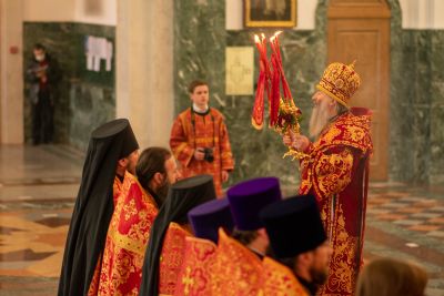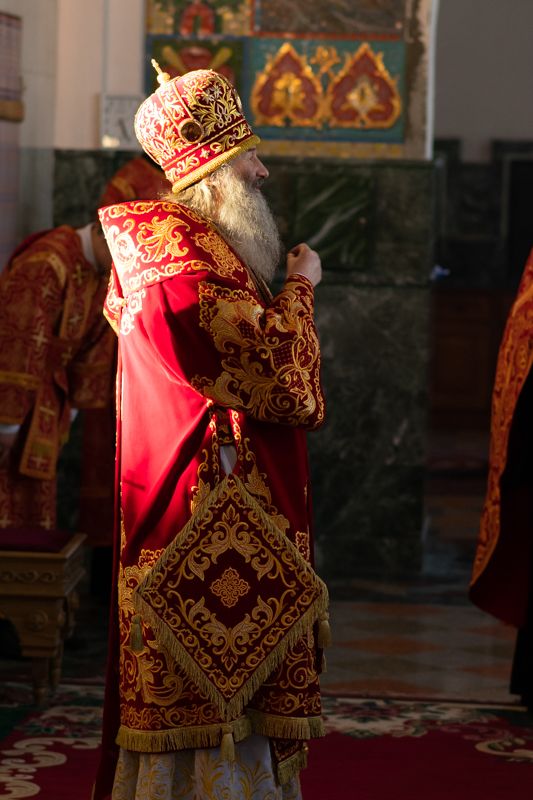 Богослужение началось торжественной встречей с облачением архиерея в центре собора.