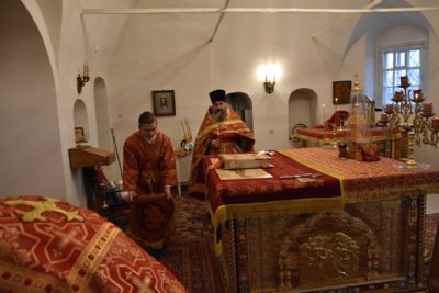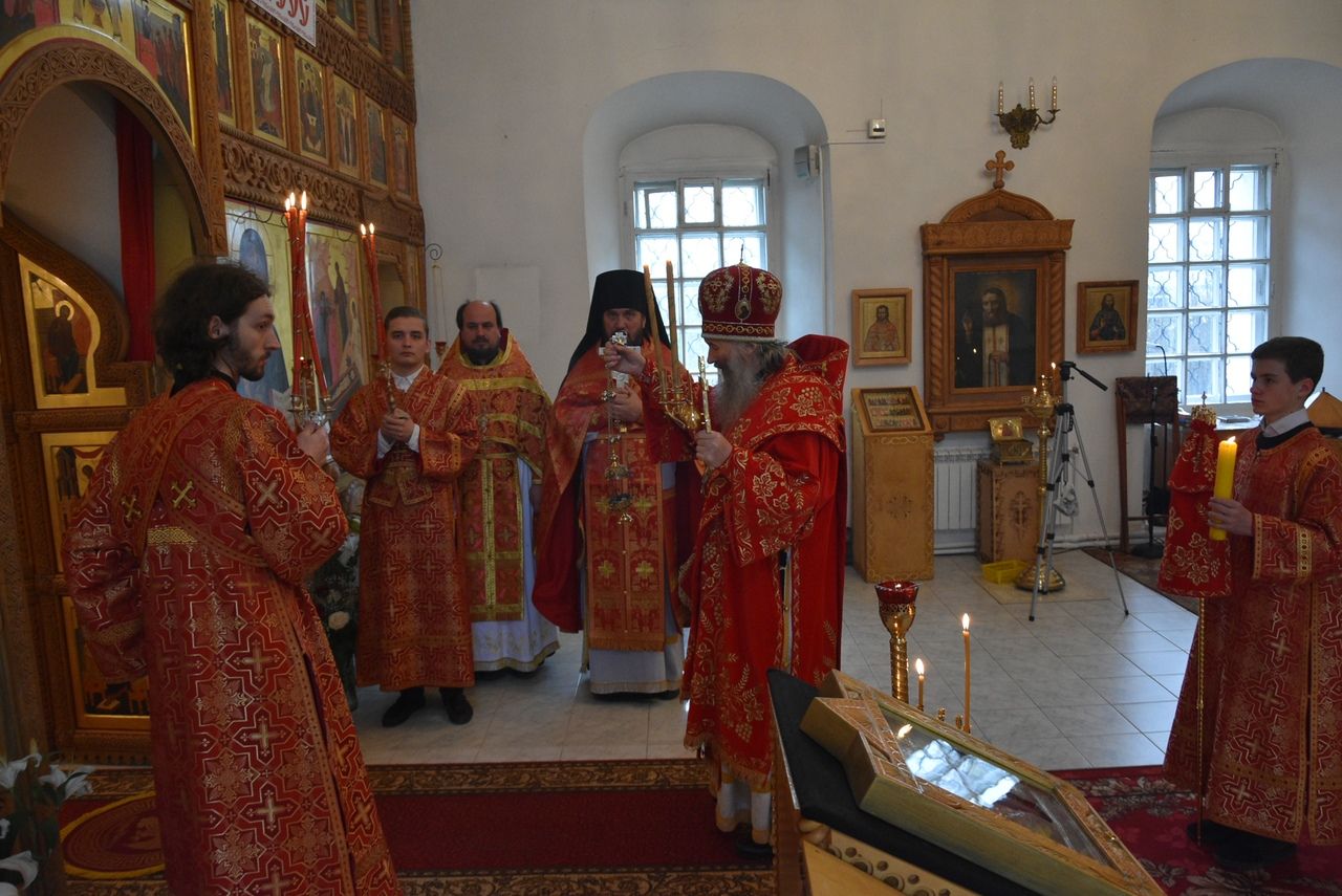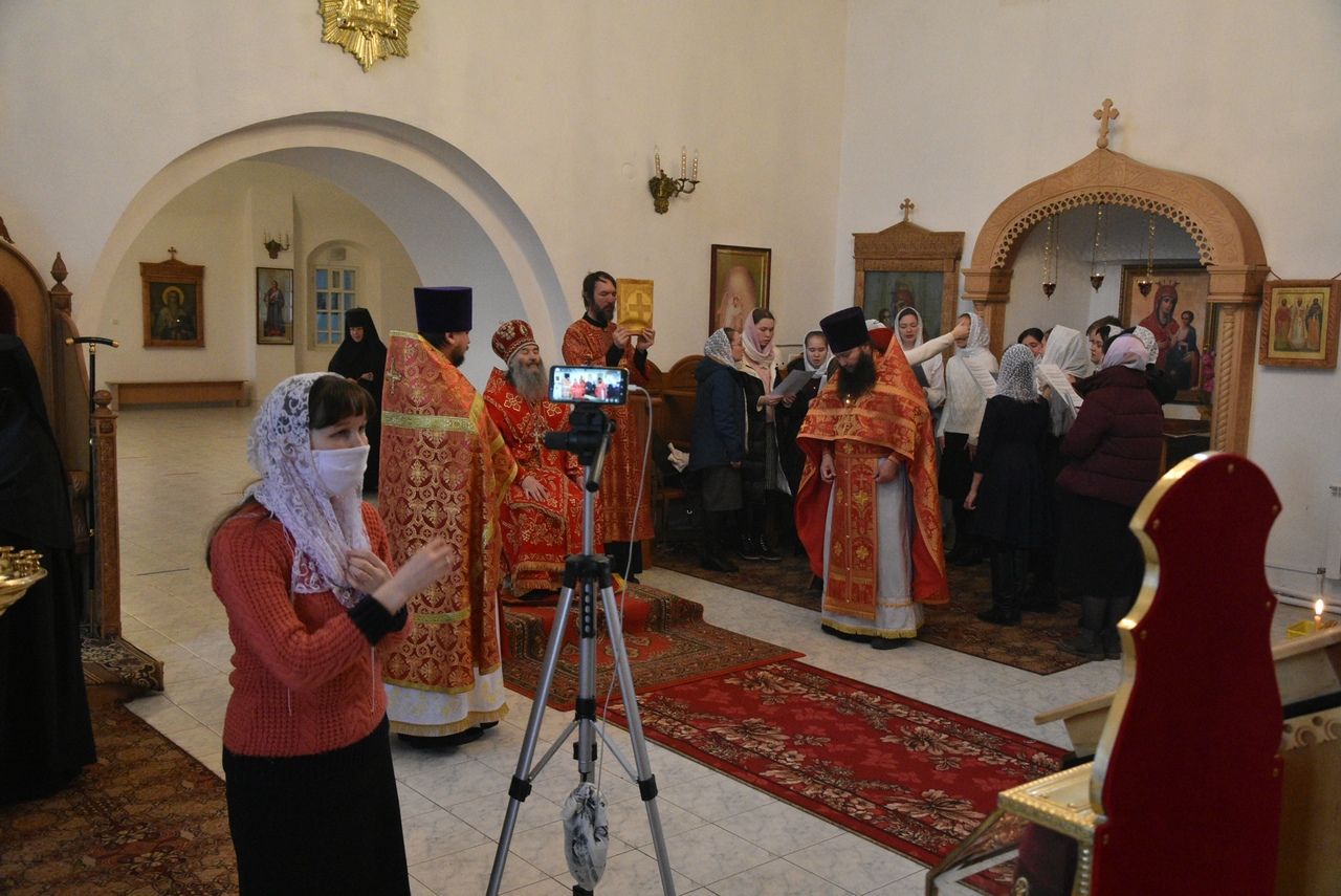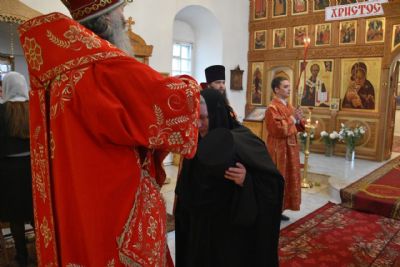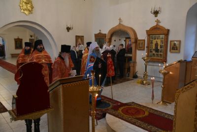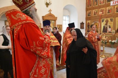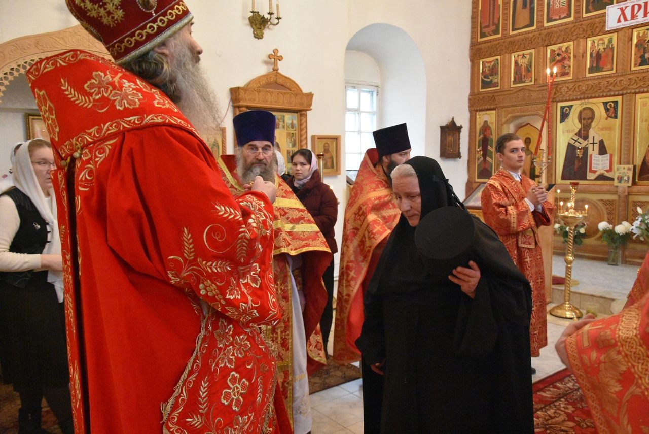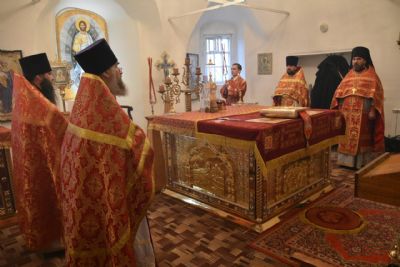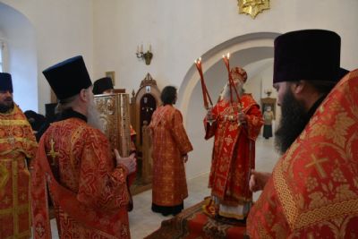 Владыке сослужили секретарь Йошкар-Олинского епархиального управления иеромонах Серафим (Пасанаев), клирик монастыря иерей Михаил Лежнин, настоятель храма Всех святых в земле Российской просиявших п. Советский протоиерей Николай Ярошевич, настоятель храма Сретения Господня с. Кучки протоиерей Алексей Вязов и клирик храма Рождества Пресвятой Богородицы с. Семеновка протодиакон Михаил Козловский.