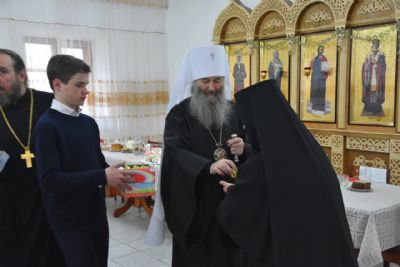 После трапезы митрополит Иоанн поздравил игумению и сестер обители с праздником Пасхи и подарил сладкие подарки.