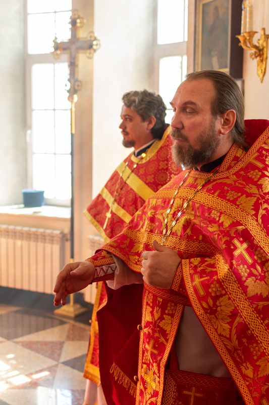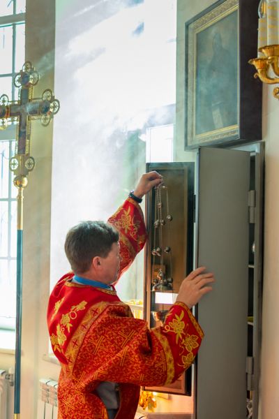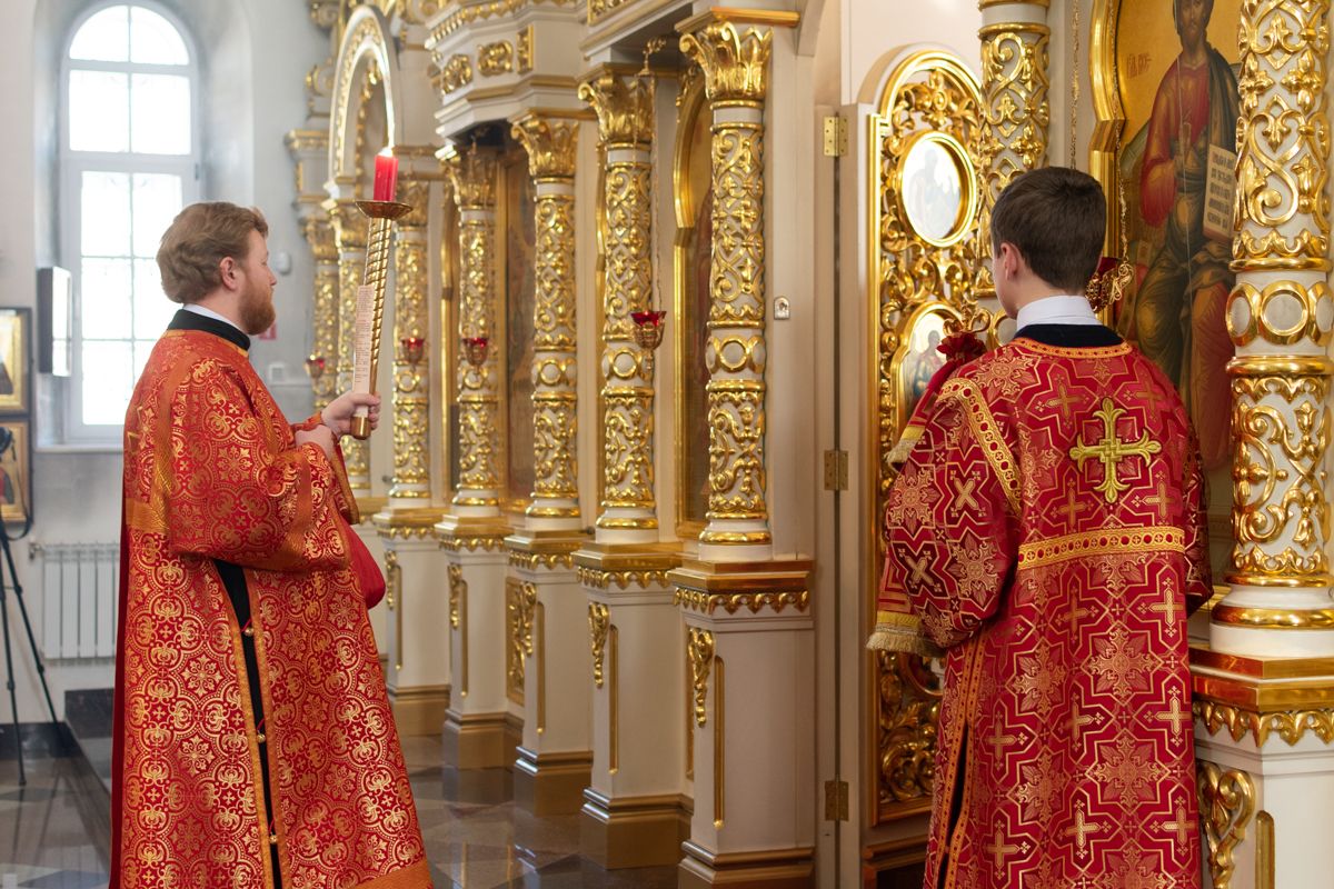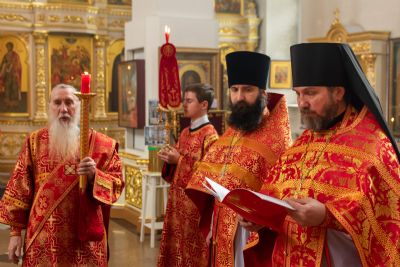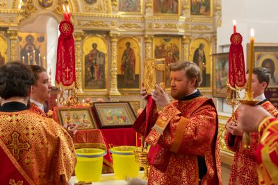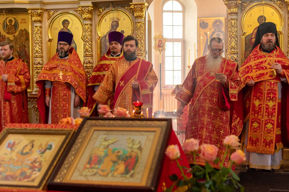 Его Высокопреосвященству сослужили секретарь Йошкар-Олинского епархиального управления иеромонах Серафим (Пасанаев), настоятель храма иерей Александр Лоскутов, клирики храма иереи Никита Смирнов, Димитрий Дьяков, Евгений Симаков, диаконы Артемий Бобоч, Вячеслав Булычев и клирик храма Рождества Пресвятой Богородицы с. Семеновка протодиакон Михаил Козловский. Песнопения исполнял хор храма под управлением регента Наталии Поповой.