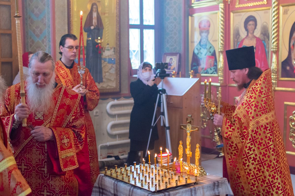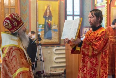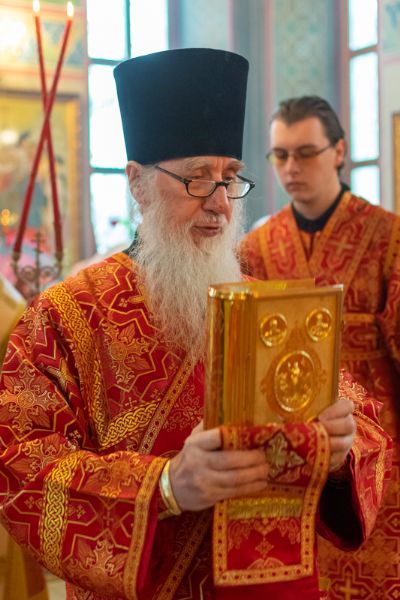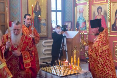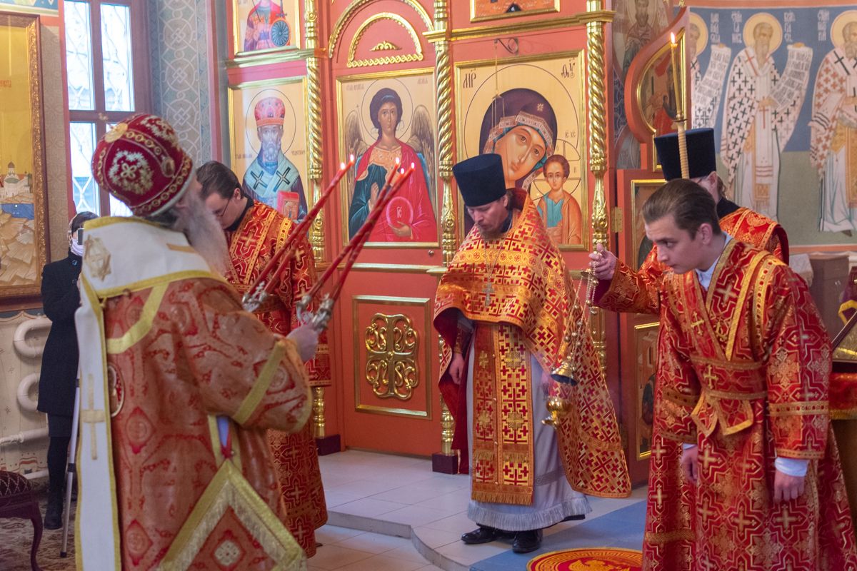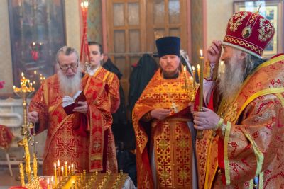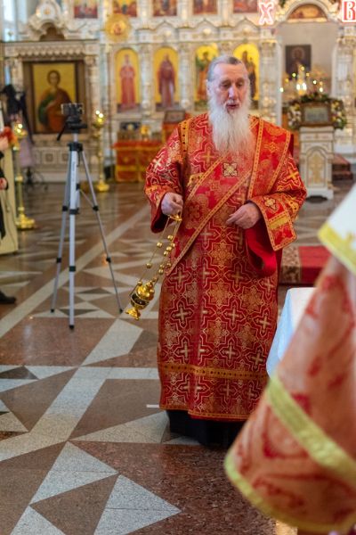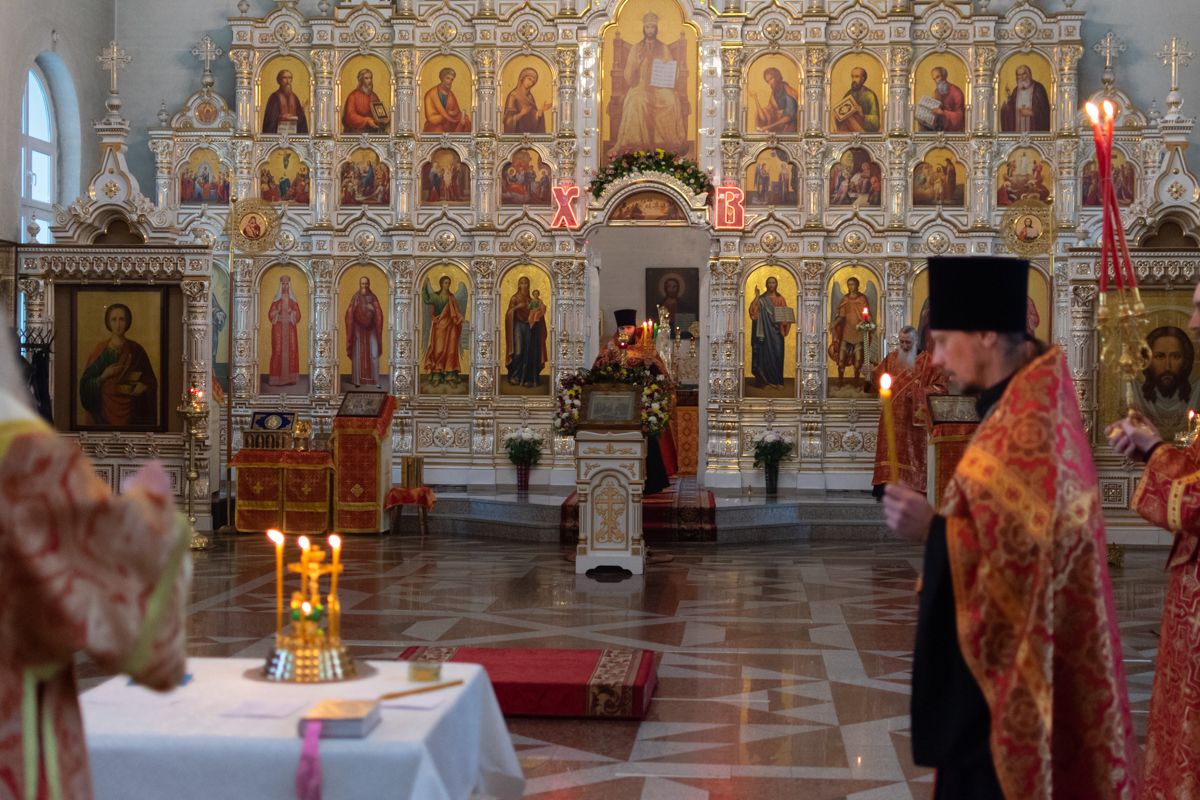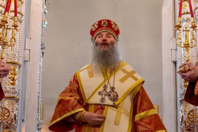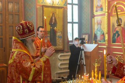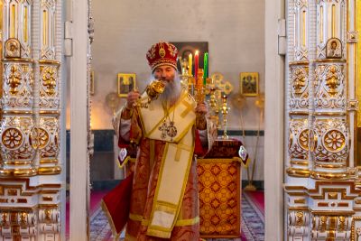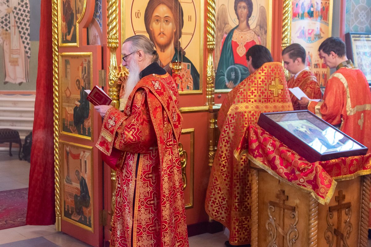 Владыке сослужили настоятель храма иерей Алексий Кирюшкин, клирики храма иереи Леонид Вылекжанин, Андрей Кочаков, диакон Алексей Кузнецов и клирик храма Рождества Пресвятой Богородицы с. Семеновка протодиакон Михаил Козловский. Песнопения исполнял хор собора.