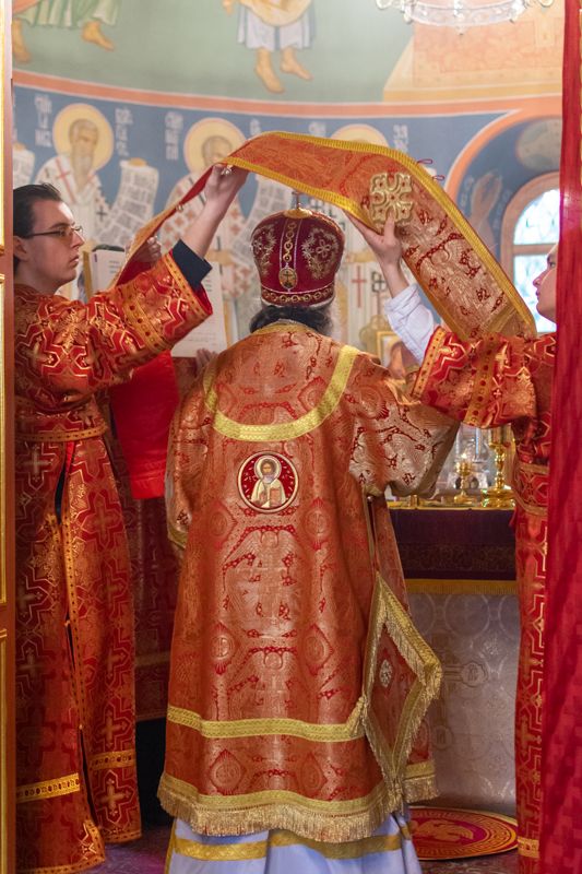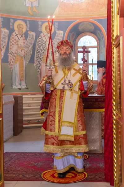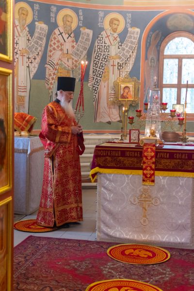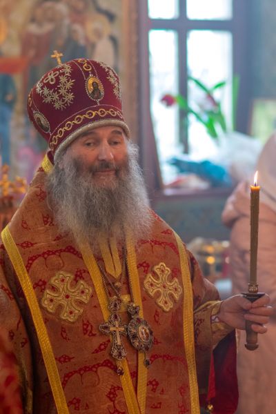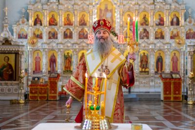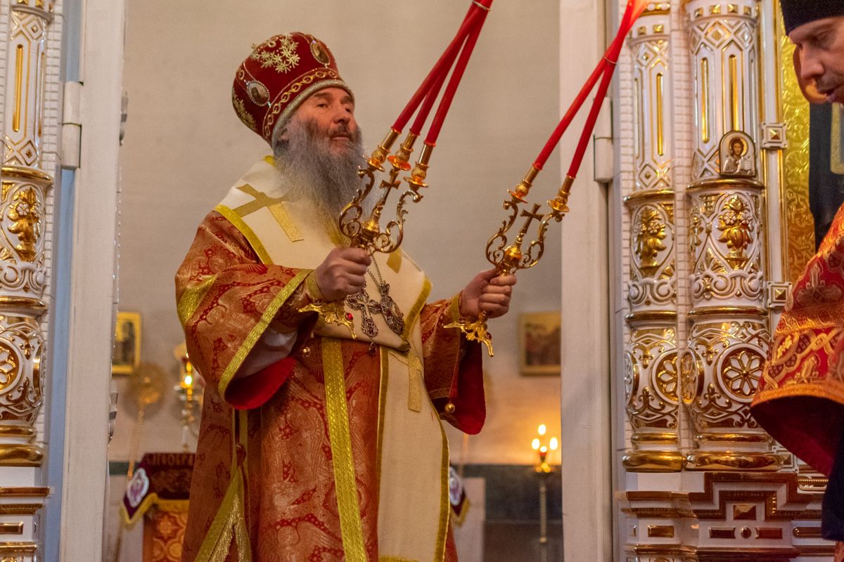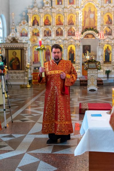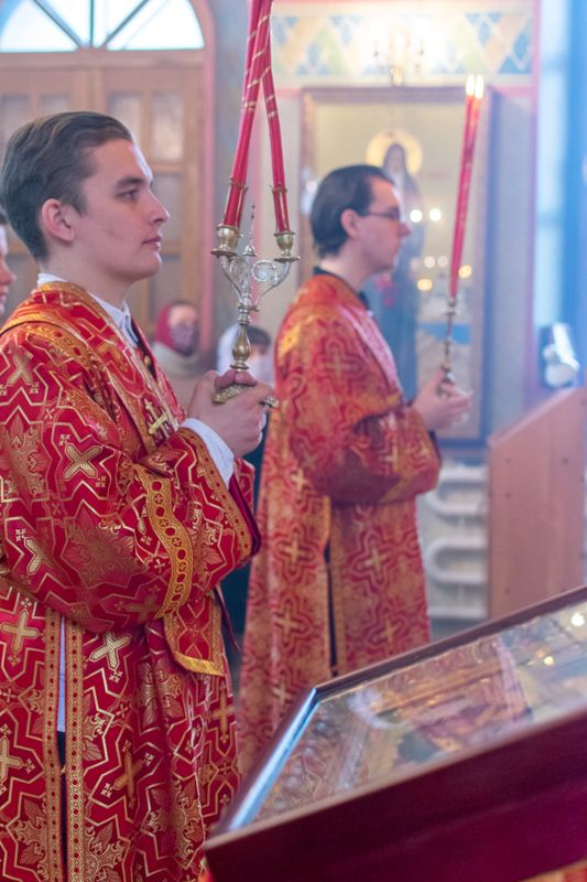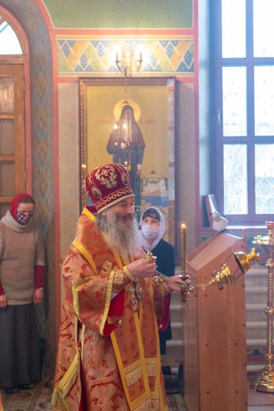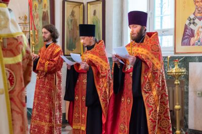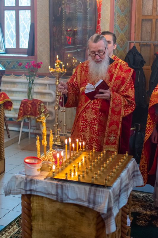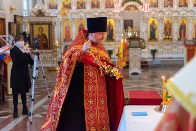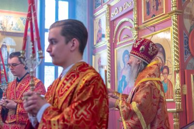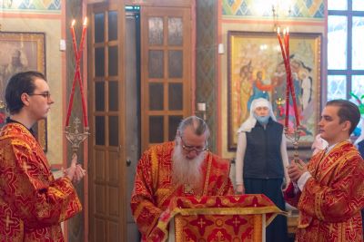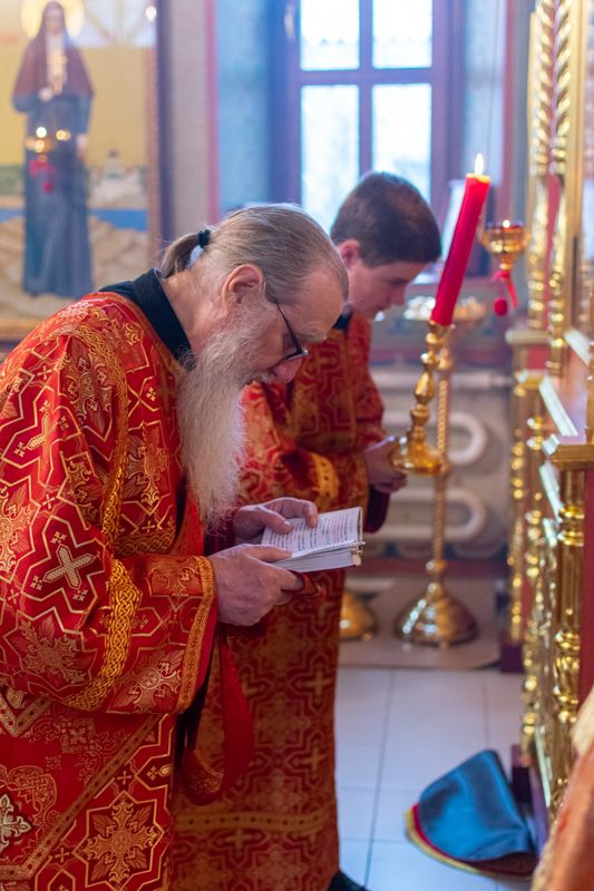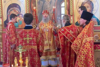 Владыке сослужили настоятель храма иерей Алексий Кирюшкин, клирики храма иереи Леонид Вылекжанин, Андрей Кочаков, диакон Алексей Кузнецов и клирик храма Рождества Пресвятой Богородицы с. Семеновка протодиакон Михаил Козловский. Песнопения исполнял хор собора.