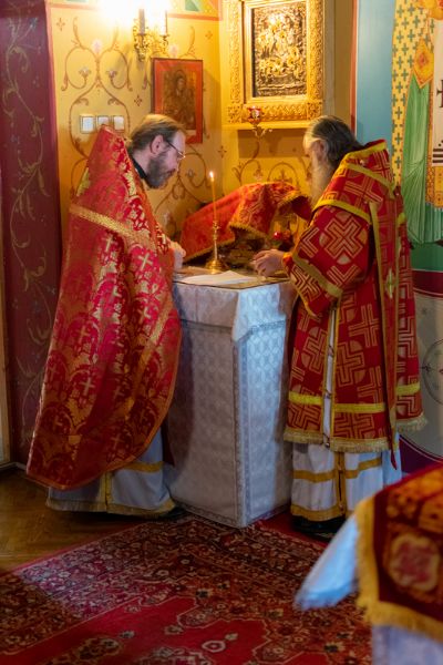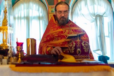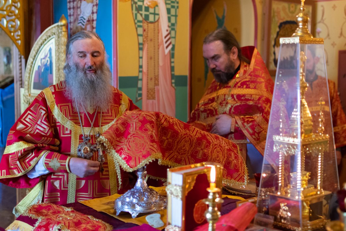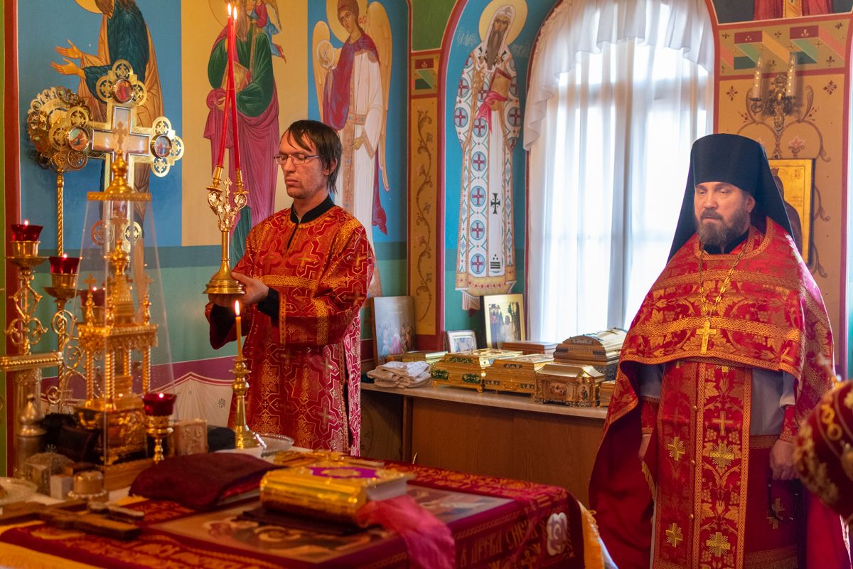 Владыке сослужили секретарь Епархиального управления иеромонах Серафим (Пасанаев) и клирик храма Рождества Пресвятой Богородицы с. Семеновка протодиакон Михаил Козловский. Богослужебные песнопения исполнял хор под руководством регента Татьяны Черновой.