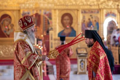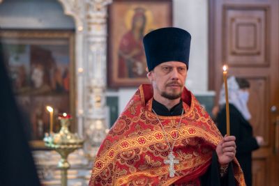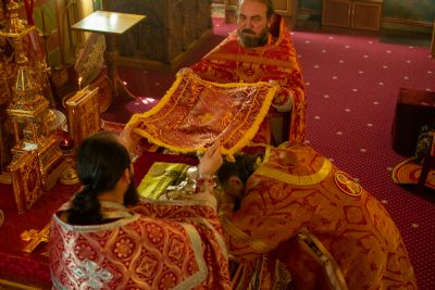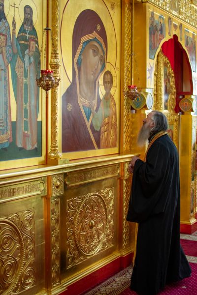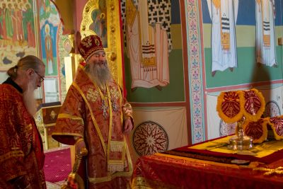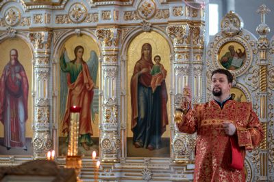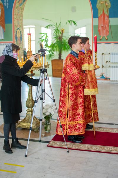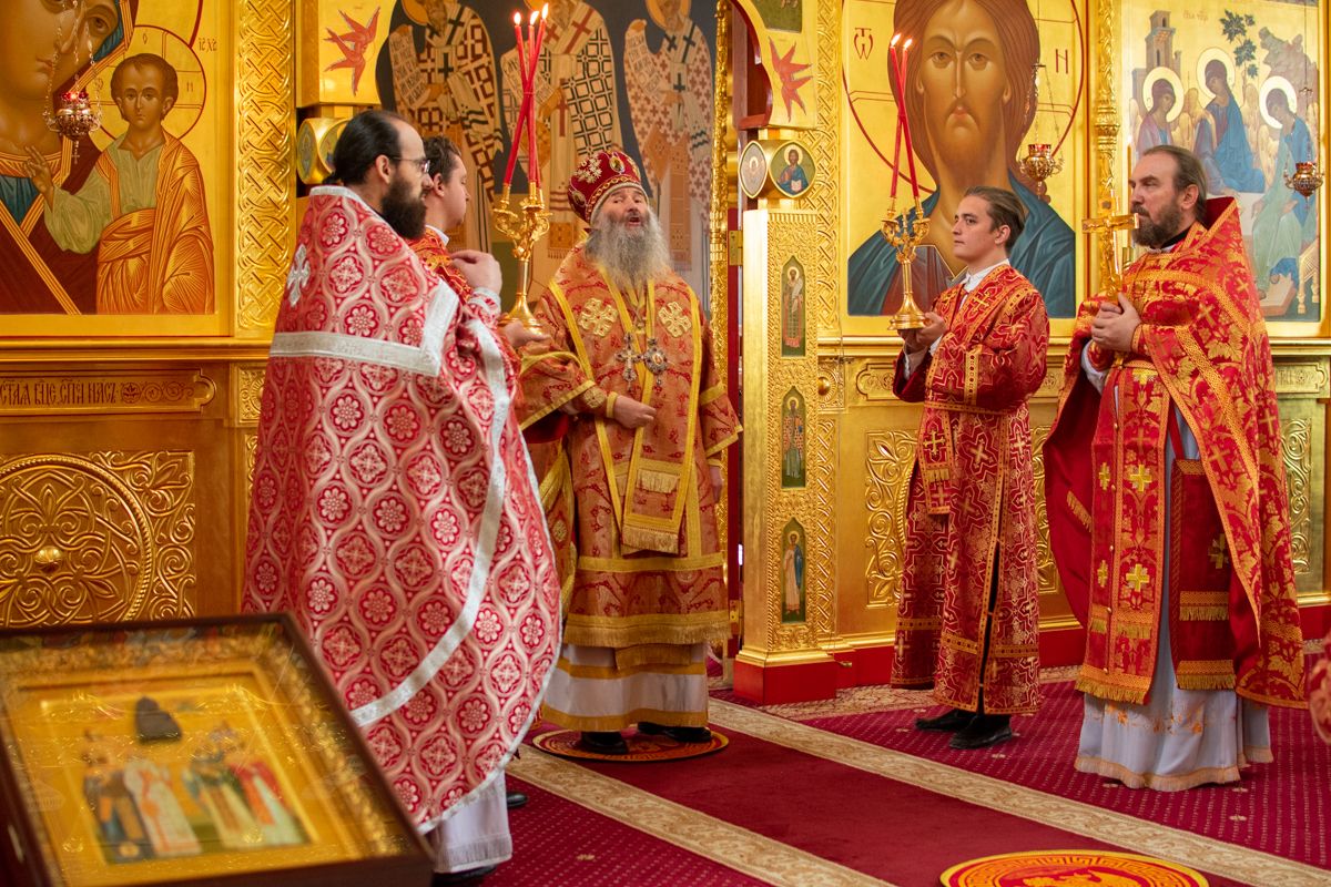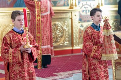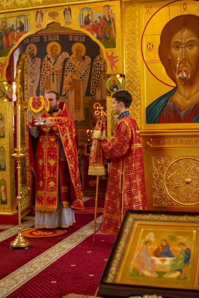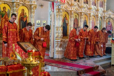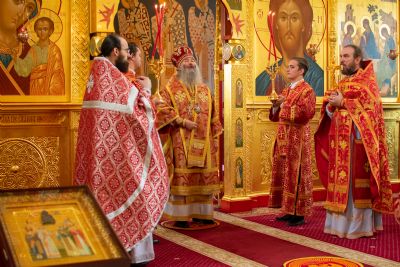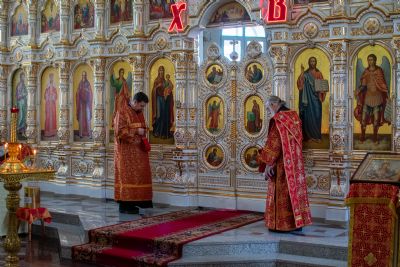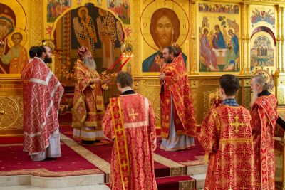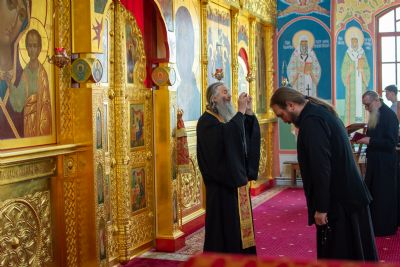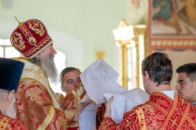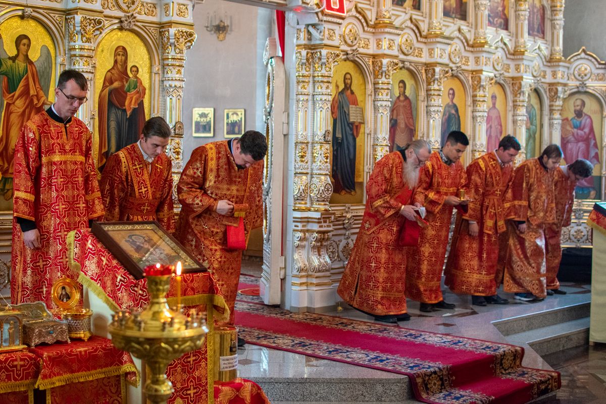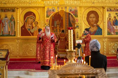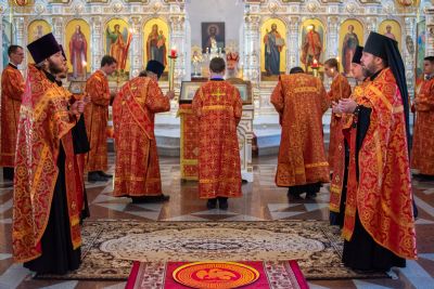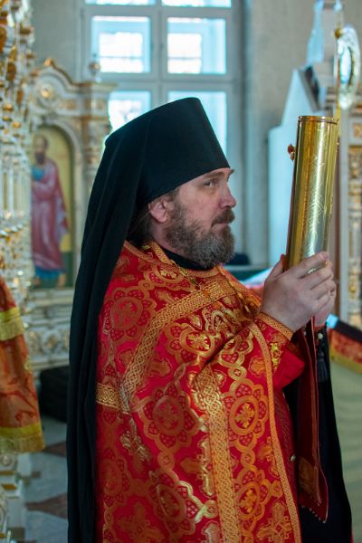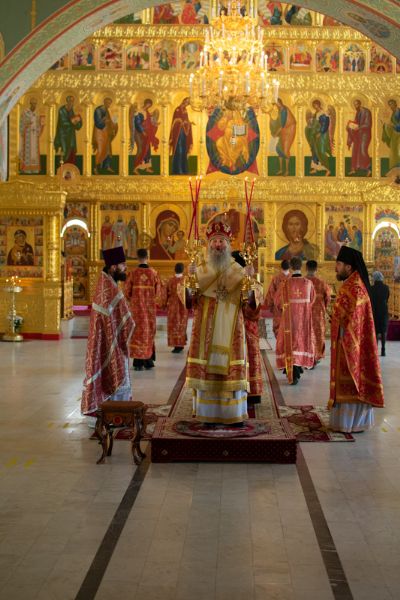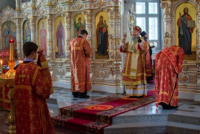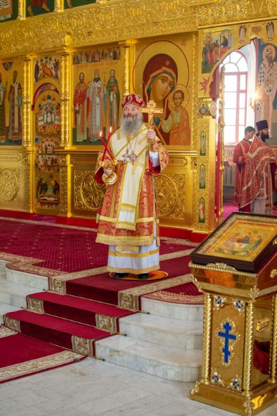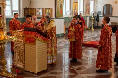 Его Высокопреосвященству сослужили секретарь Епархиального управления иеромонах Серафим (Пасанаев), клирики Вознесенского собора иерей Иоанн Кристев, диакон Владимир Лихачев и клирик храма Рождества Пресвятой Богородицы с. Семеновка протодиакон Михаил Козловский. Песнопения исполнял хор храма под управлением регента Анны Ярошевич.