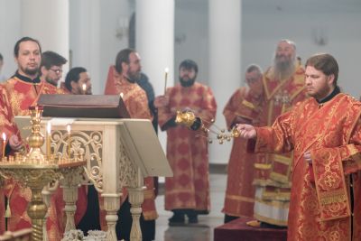 Его Высокопреосвященству сослужили секретарь Йошкар-Олинского епархиального управления иеромонах Серафим (Пасанаев), ключарь собора протоиерей Сергий Поглазов, клирики собора иереи Никифор Захаров, Артемий Промович, Евгений Самойлов, диаконы Андрей Дружинин, Игорь Коваль и клирик храма Рождества Пресвятой Богородицы с. Семеновка протодиакон Михаил Козловский. Богослужебные песнопения исполнял хор под руководством регента Татьяны Черновой.