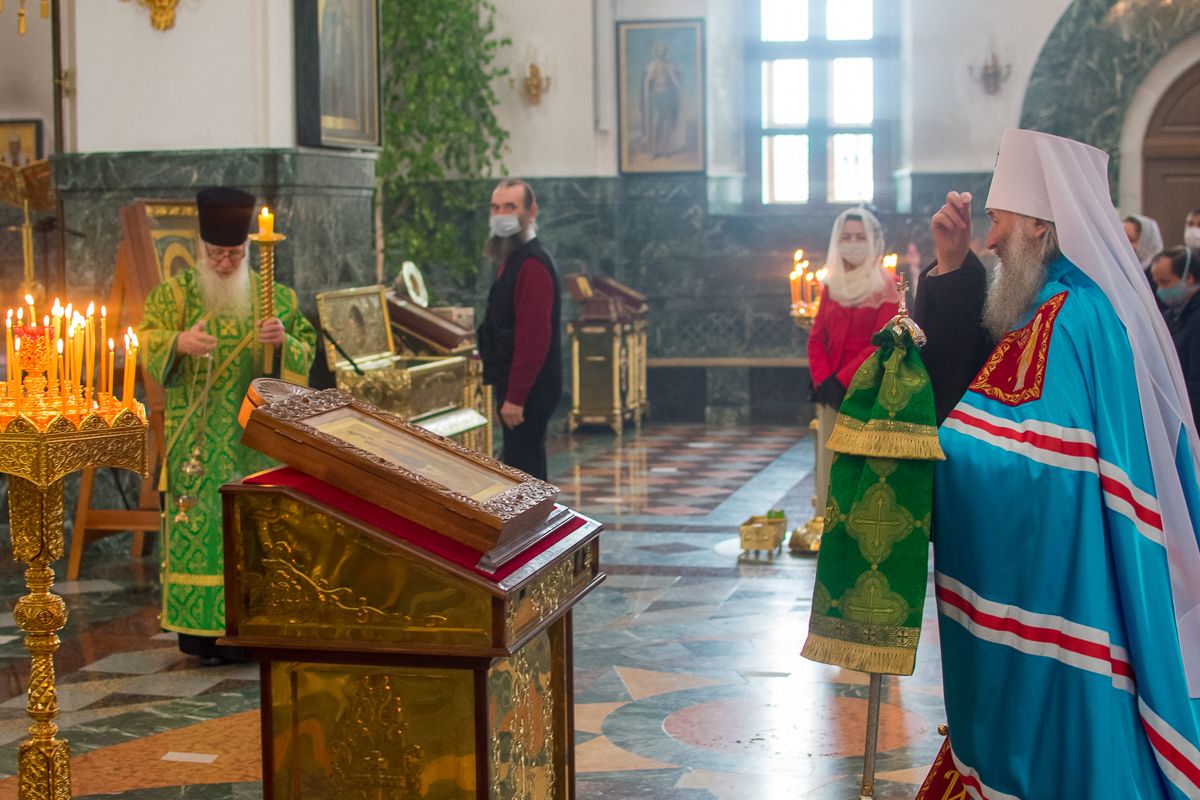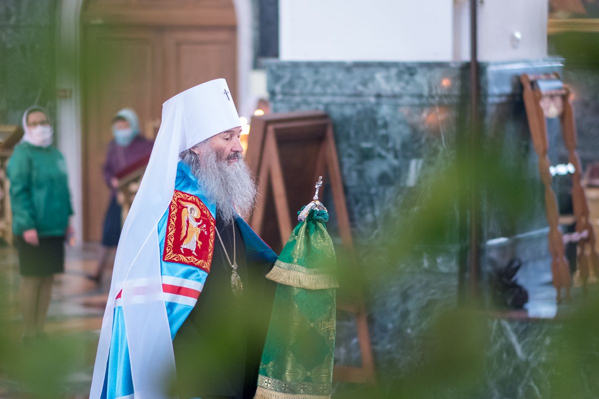 Литургия началась с торжественной встречи Владыки и облачения в центре храма. За богослужением возносились особые прошения о единении Православной Церкви, мире в Украине и прекращении вредоносного поветрия.
