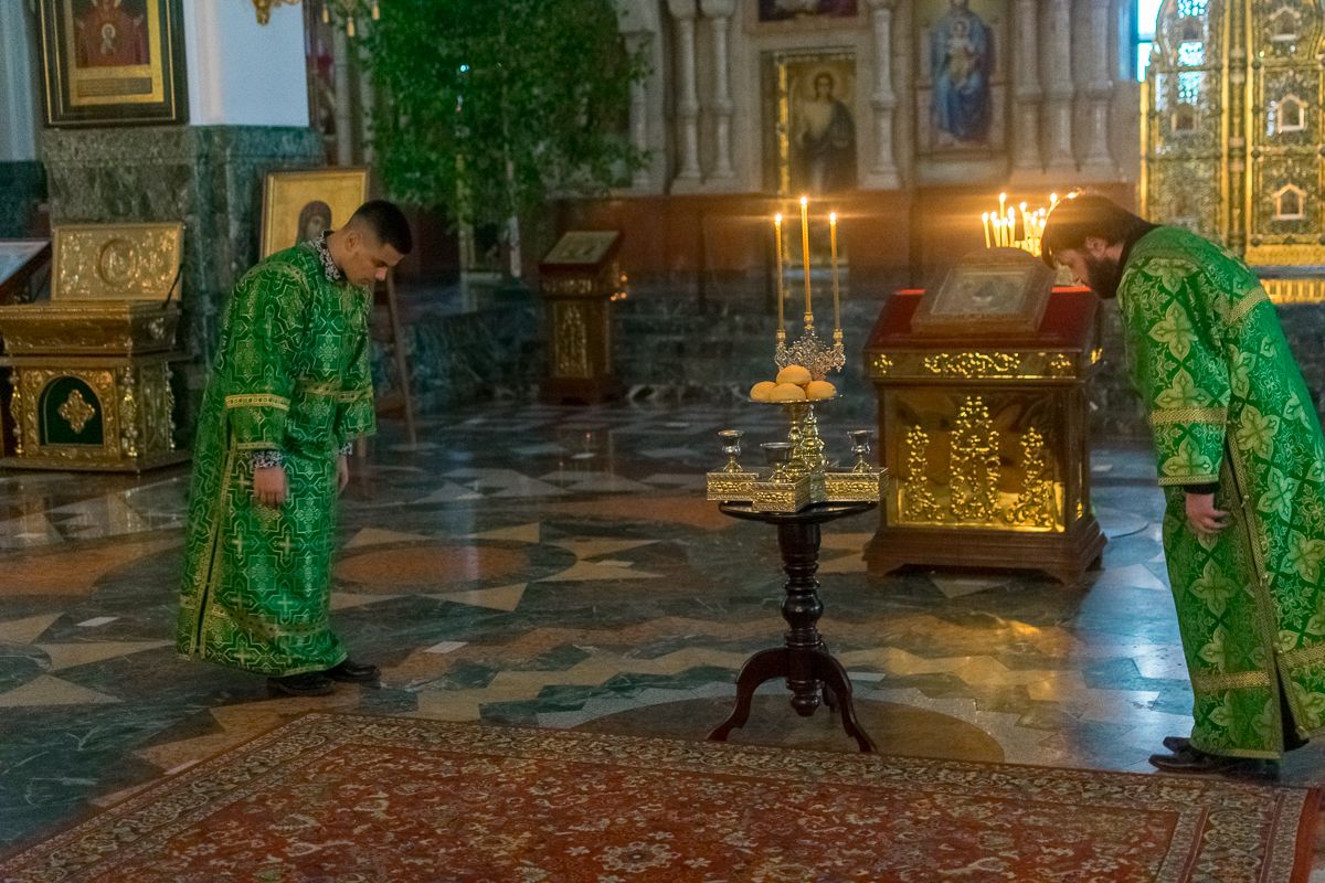 На вечерне читались ветхозаветные паремии, прообразовавшие праздник Пятидесятницы. В честь праздника на литии освящались хлеб, вино, елей и пшеница.