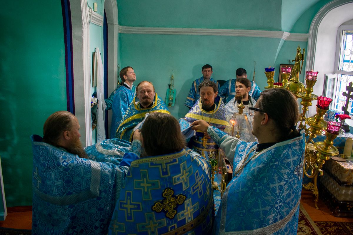Владыке сослужили настоятель храма иерей Алексей Васюткин, настоятель Троицкого храма с. Емелево протоиерей Александр Алешев, настоятель Троицкого храма с. Троицкий Посад протоиерей Виктор Соловьев, настоятель храма Рождества Христова с. Пайгусово иерей Сергий Князев, настоятель Свято-Духовского храма села Усола иерей Александр Малинов, настоятель храма Вознесения Господня с. Пертнуры иерей Евгений Шатров, настоятель храма Рождества Христова с. Еласы иерей Александр Сиситкин, клирик храма Рождества Пресвятой Богородицы с. Семеновка протодиакон Михаил Козловский и клирик Вознесенского собора г. Йошкар-Олы диакон Владимир Лихачев.