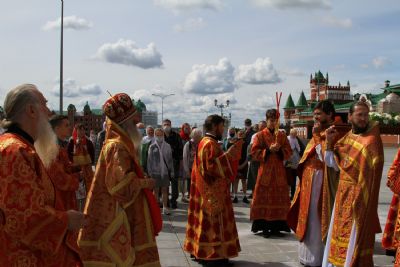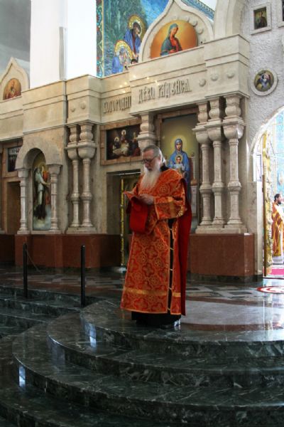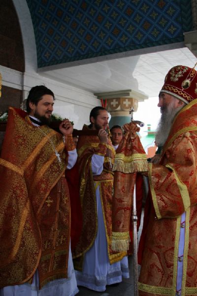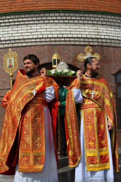 После Литургии прошел крестный ход с мощами священномученика Сергия вокруг храма, затем Владыка обратился к собравшимся с проповедью о священномученике Сергии, пресвитере Марийском.