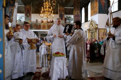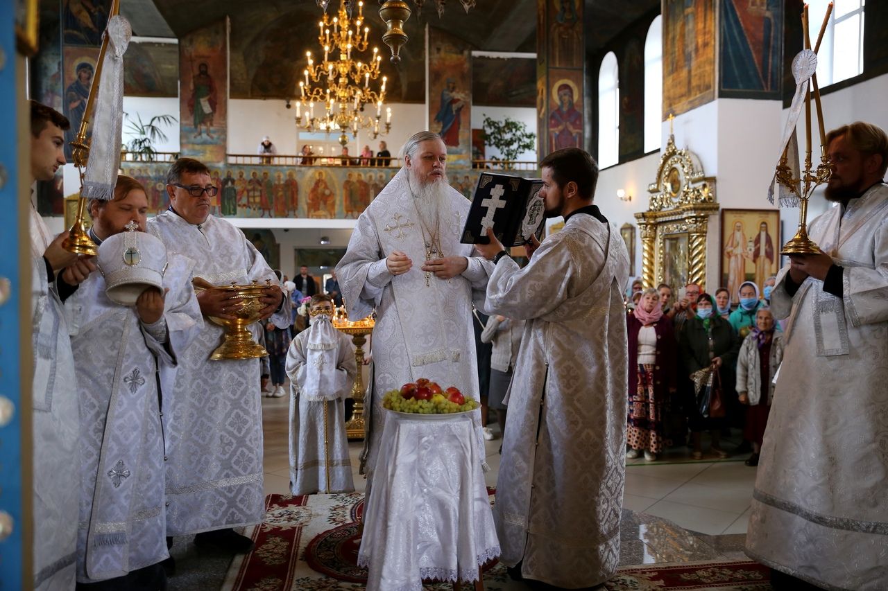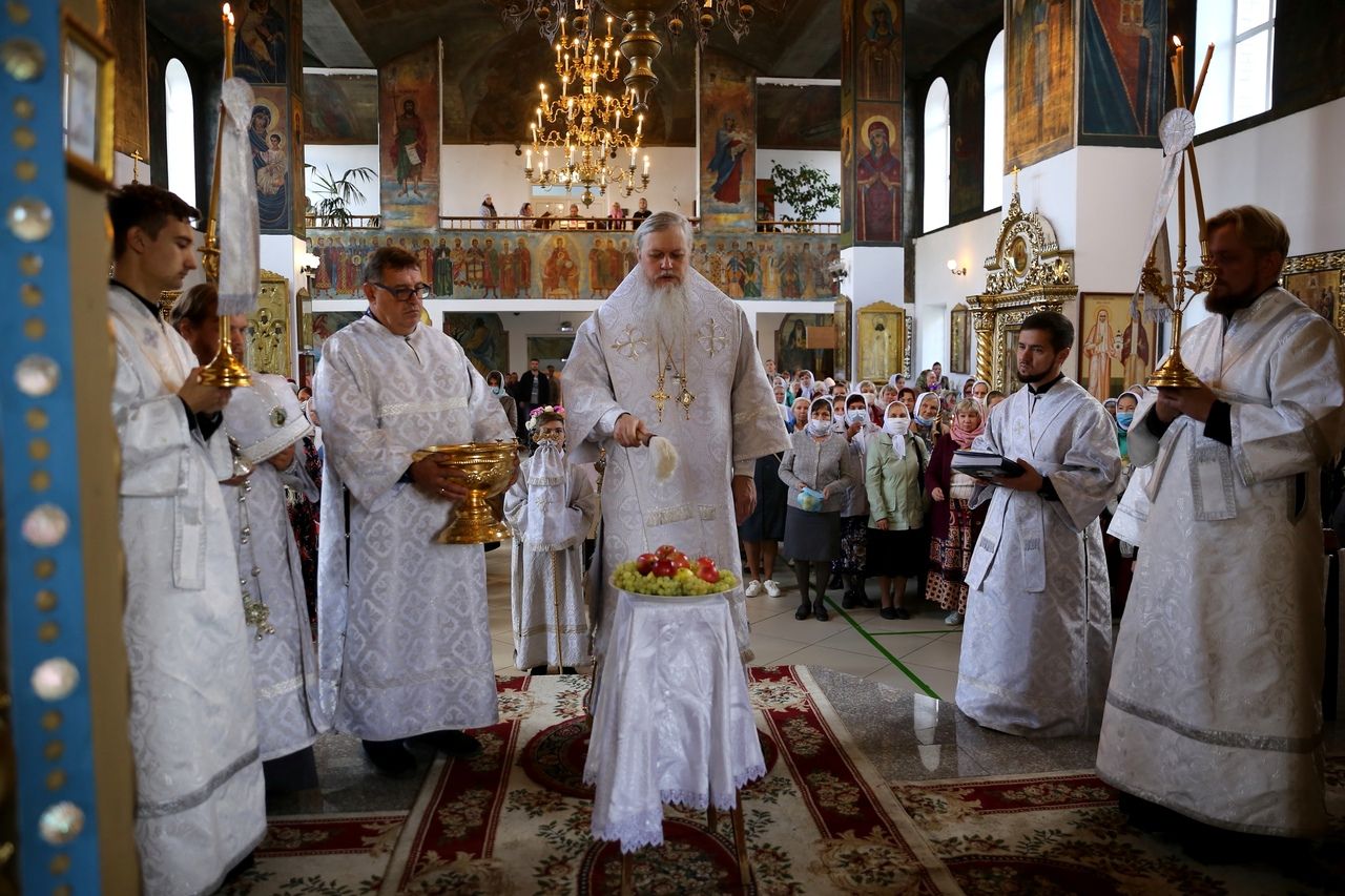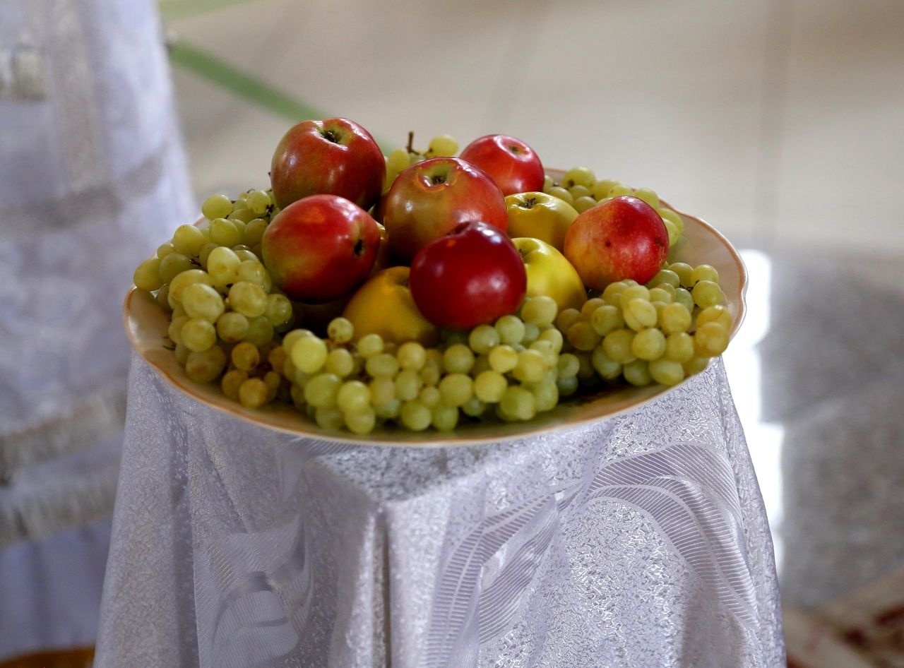 В завершение богослужения епископ Феофан совершил чин освящения плодов нового урожая. Яблоки, груши, виноград, принесенные прихожанами в знак благодарности Господу, были окроплены святой водой.