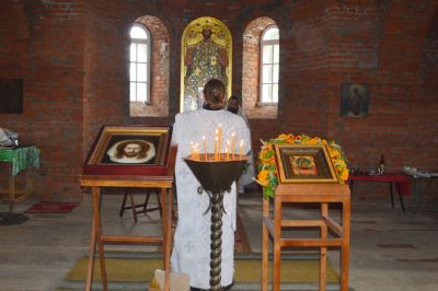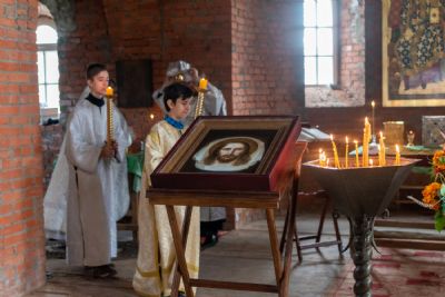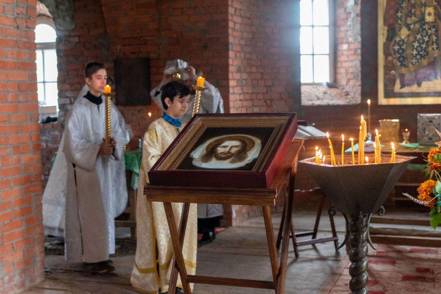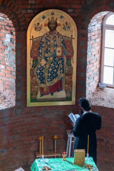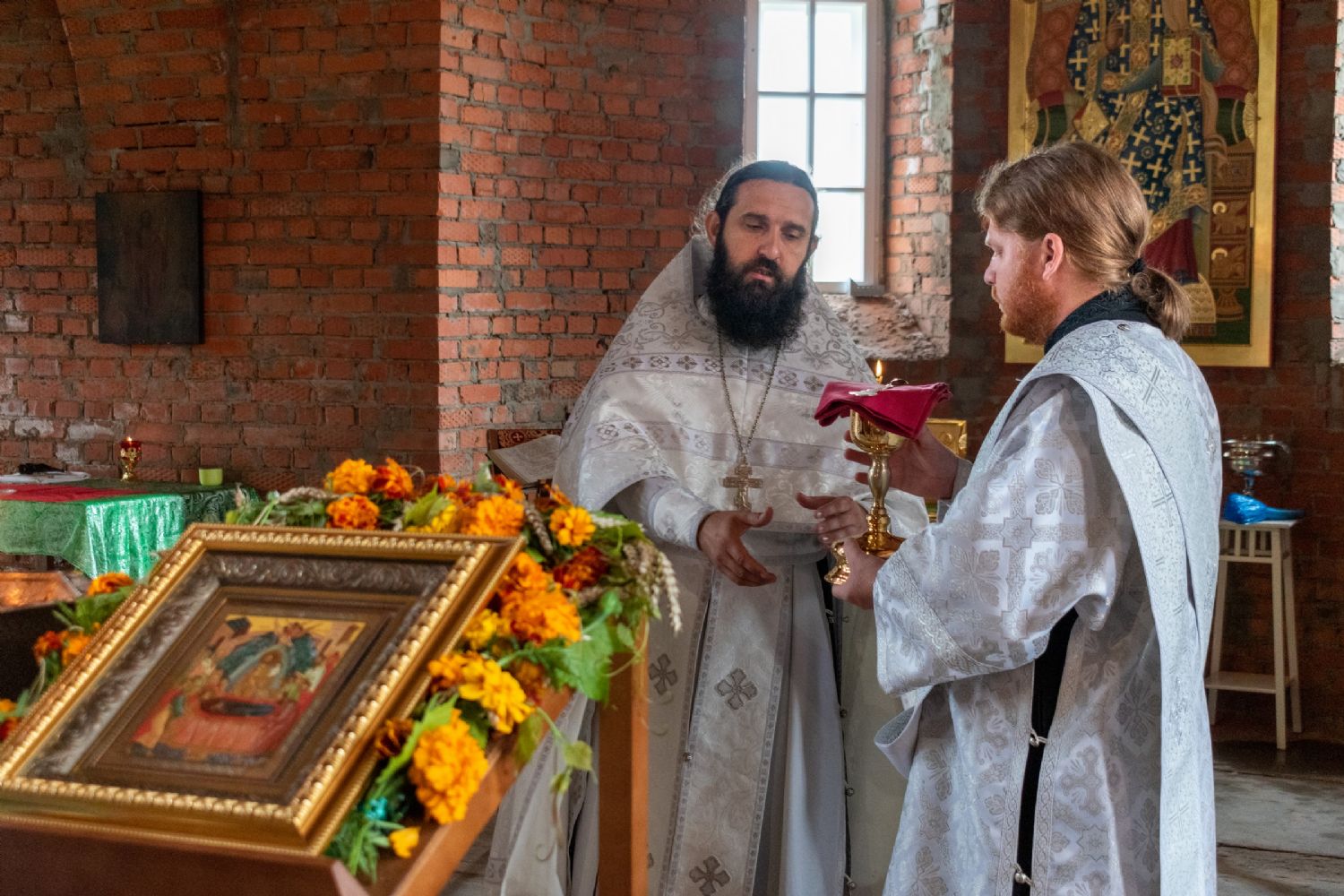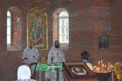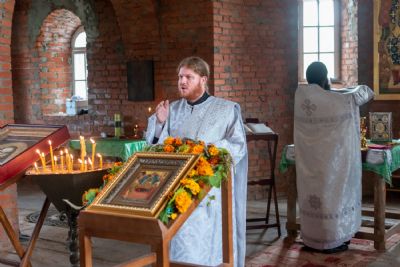 На стенах храма висели старинные, еще не отреставрированные иконы Пресвятой Богородицы, Николая Чудотворца, Иоанна Богослова, Серафима Саровского. А в алтаре была установлена икона Спаса на Престоле, написанная для храма.