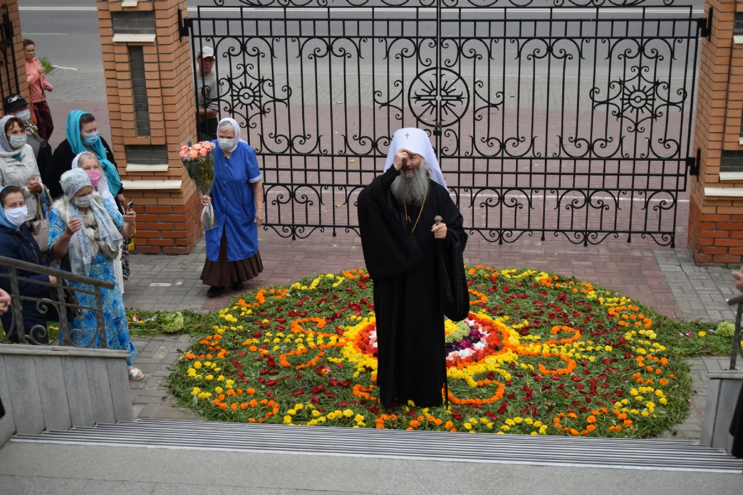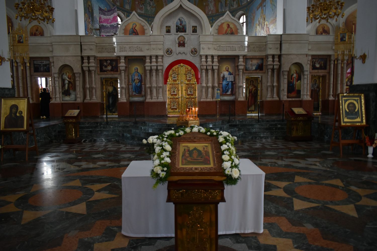 После великого славословия при пении «Трисвятого» Плащаница с изображением Пресвятой Богородицы была обнесена крестным ходом вокруг собора и вновь положена на середину храма, где и будет пребывать до отдания праздника Успения.