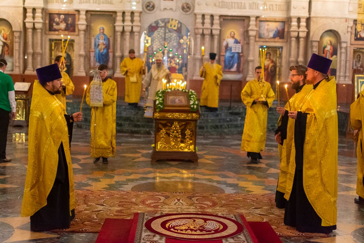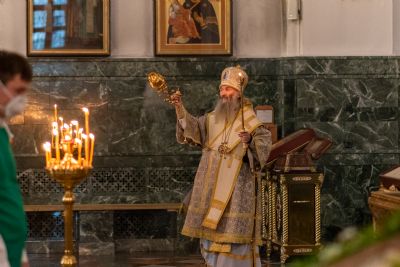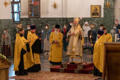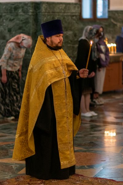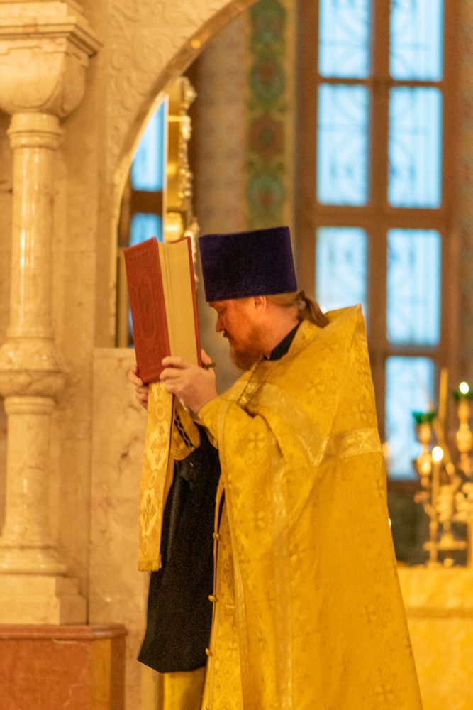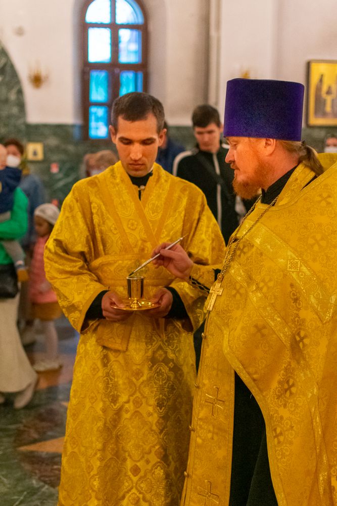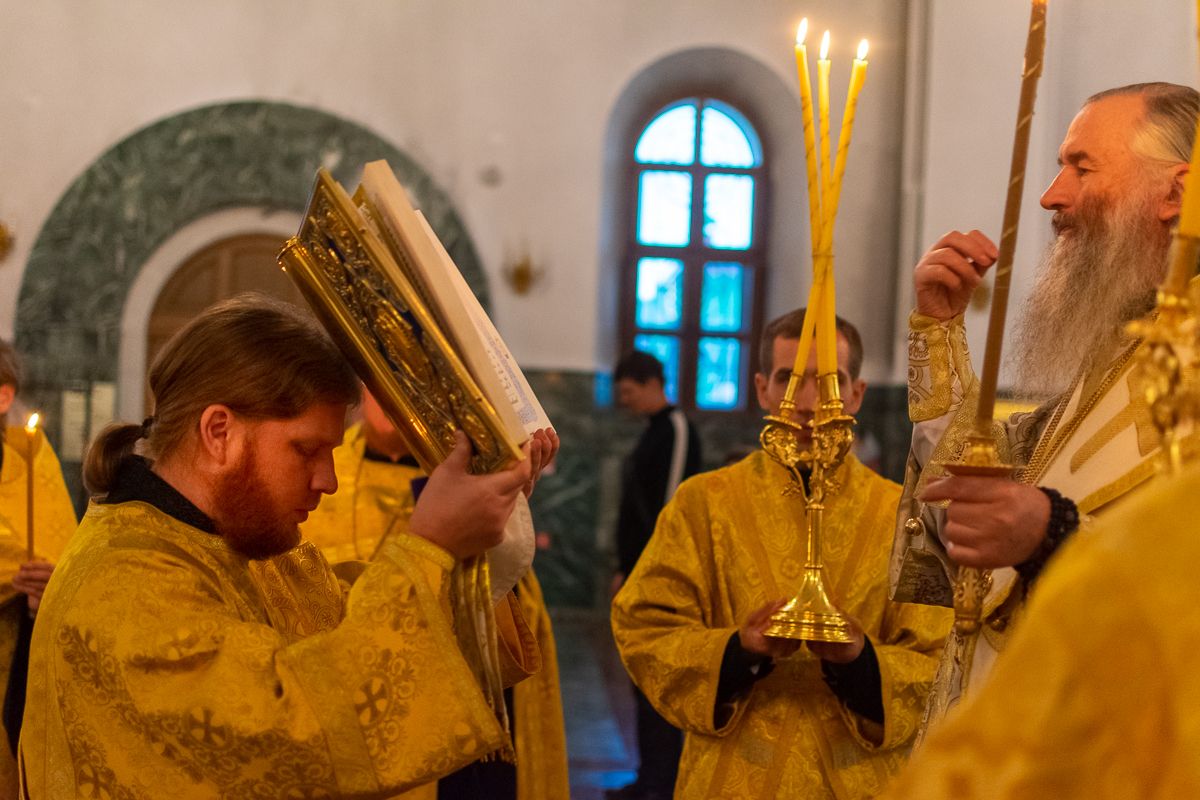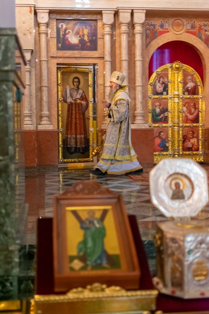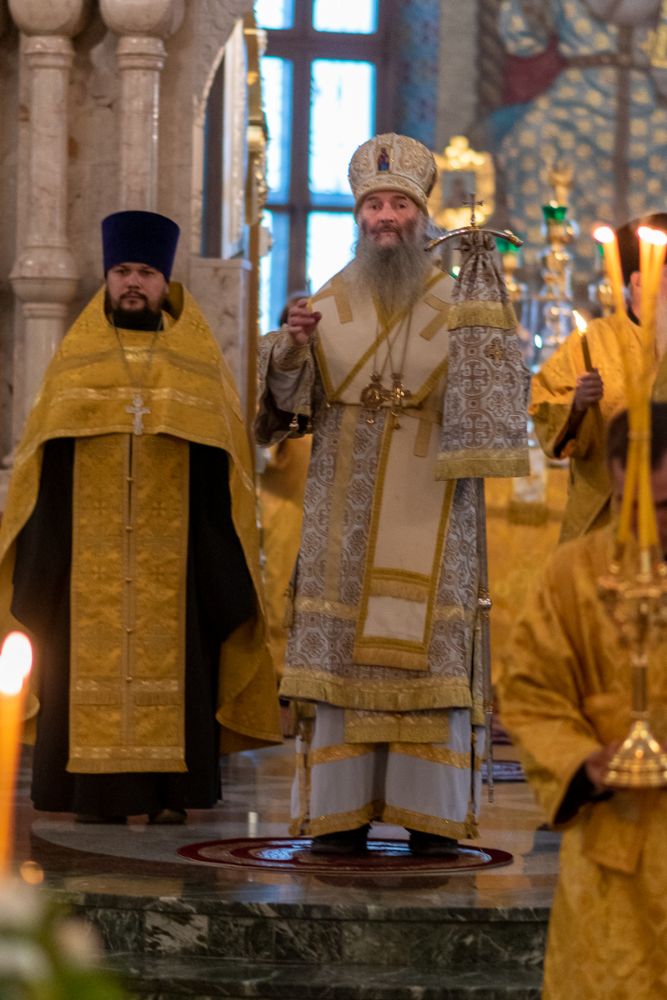 Архипастырю сослужили ключарь собора протоиерей Сергий Поглазов, клирики собора иереи Никифор Захаров, Евгений Самойлов, диаконы Андрей Дружинин, Игорь Коваль и клирик храма Рождества Пресвятой Богородицы протодиакон Михаил Козловский. Пел хор под руководством регента Надежды Поздеевой. За богослужением помогали Православные добровольцы.