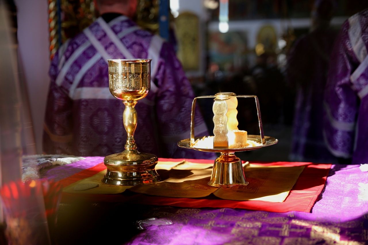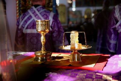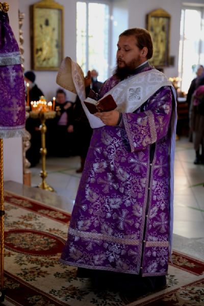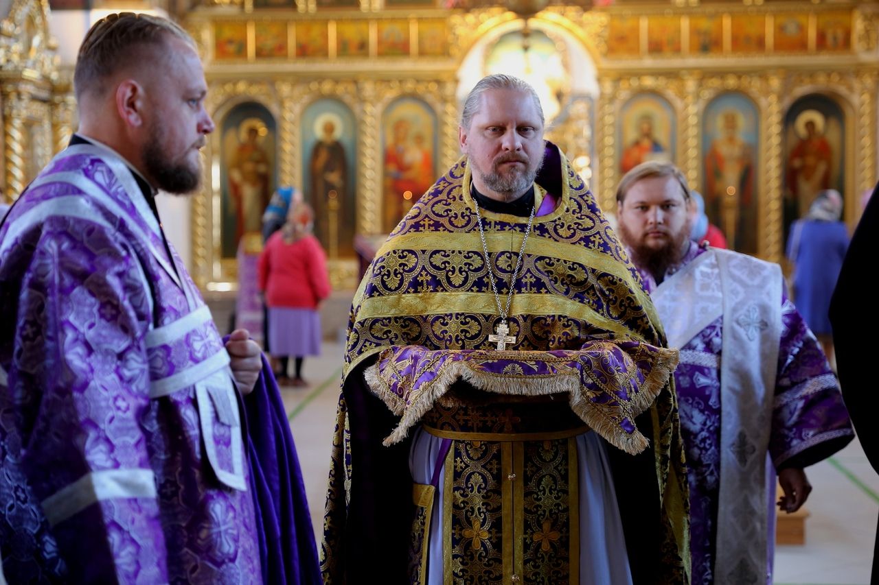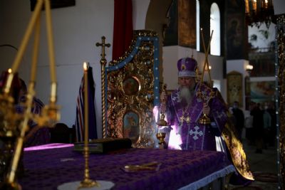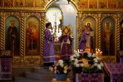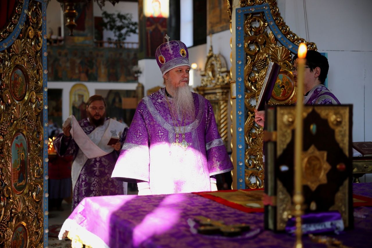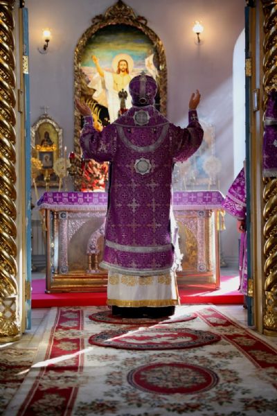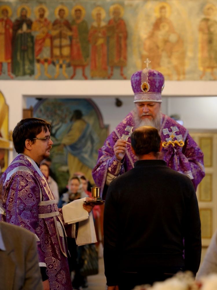 По окончании Литургии епископ Феофан со священством занесли Крест с середины храма в алтарь, на святой престол.