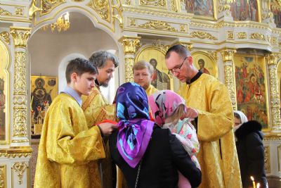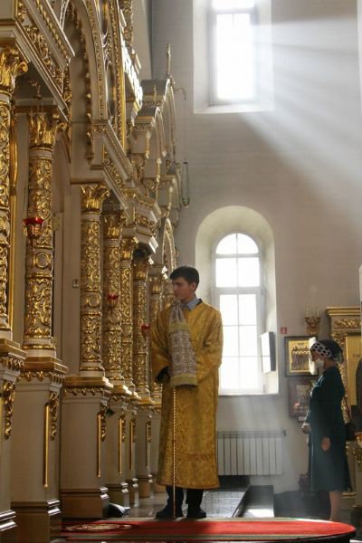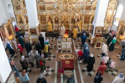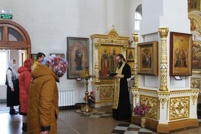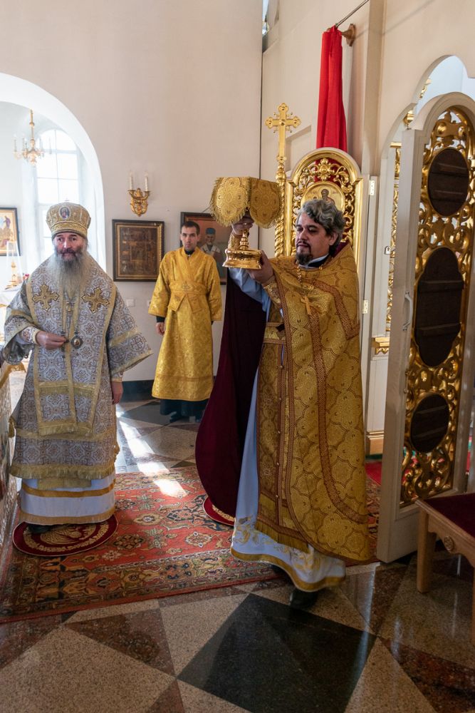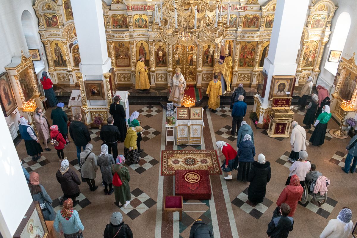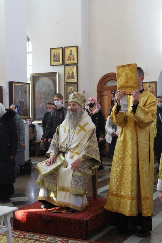За Литургией Его Высокопреосвященству сослужили настоятель храма иерей Александр Лоскутов, клирик храма диакон Вячеслав Булычев и клирик Благовещенского кафедрального собора диакон Игорь Коваль. Песнопения исполнял хор храма под управлением регента Любови Торощиной.