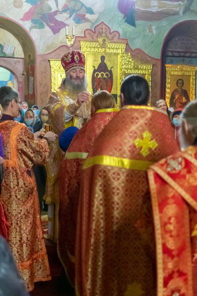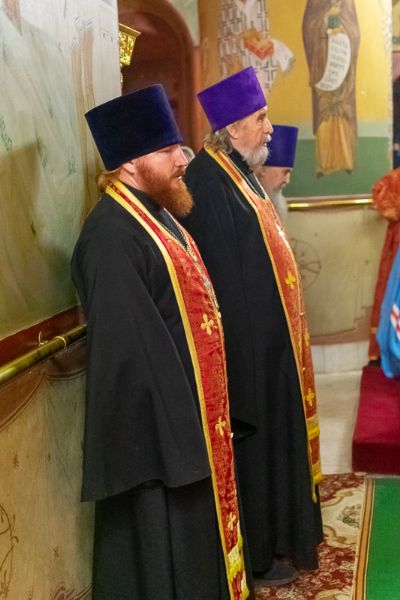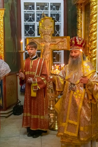 Владыке сослужили секретарь Йошкар-Олинского епархиального управления иеромонах Серафим (Пасанаев), настоятель собора протоиерей Евгений Кутырев, клирики собора и клирик храма Рождества Пресвятой Богородицы с. Семеновка протодиакон Михаил Козловский.