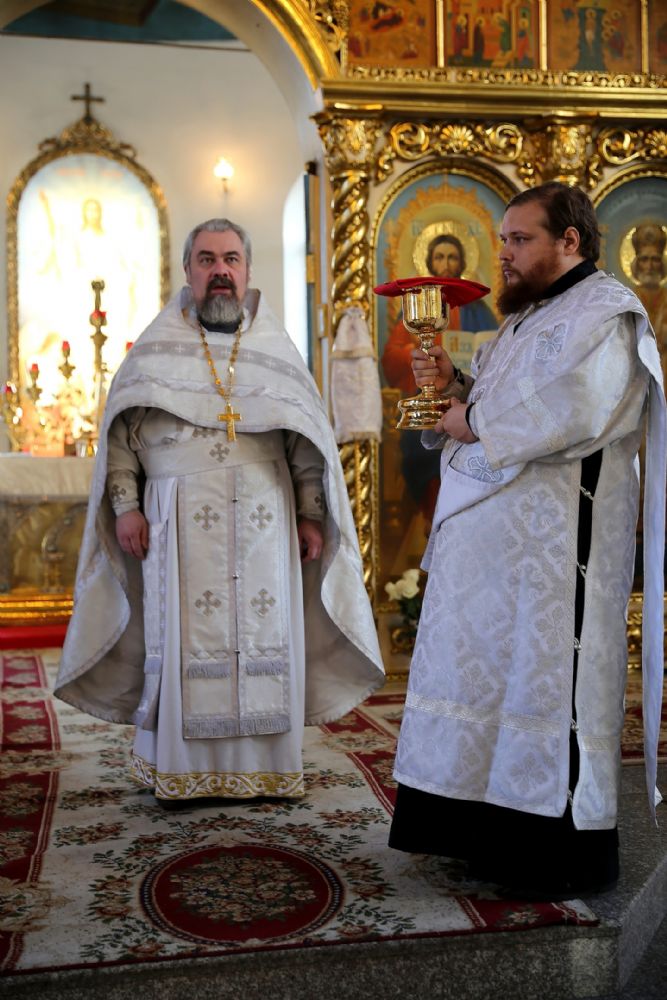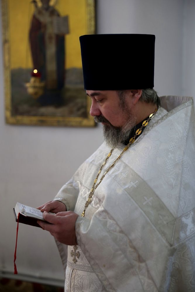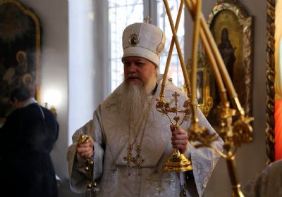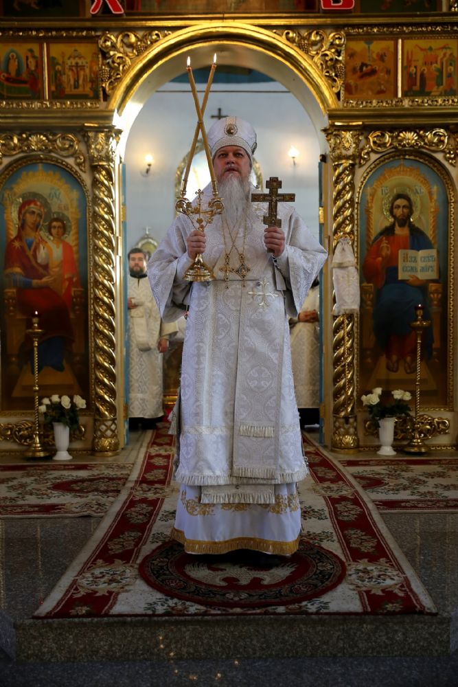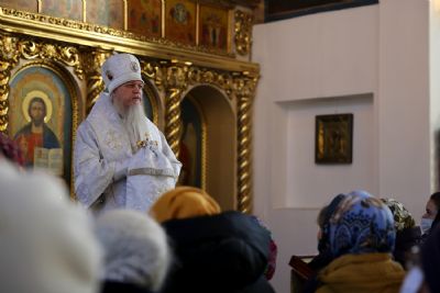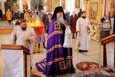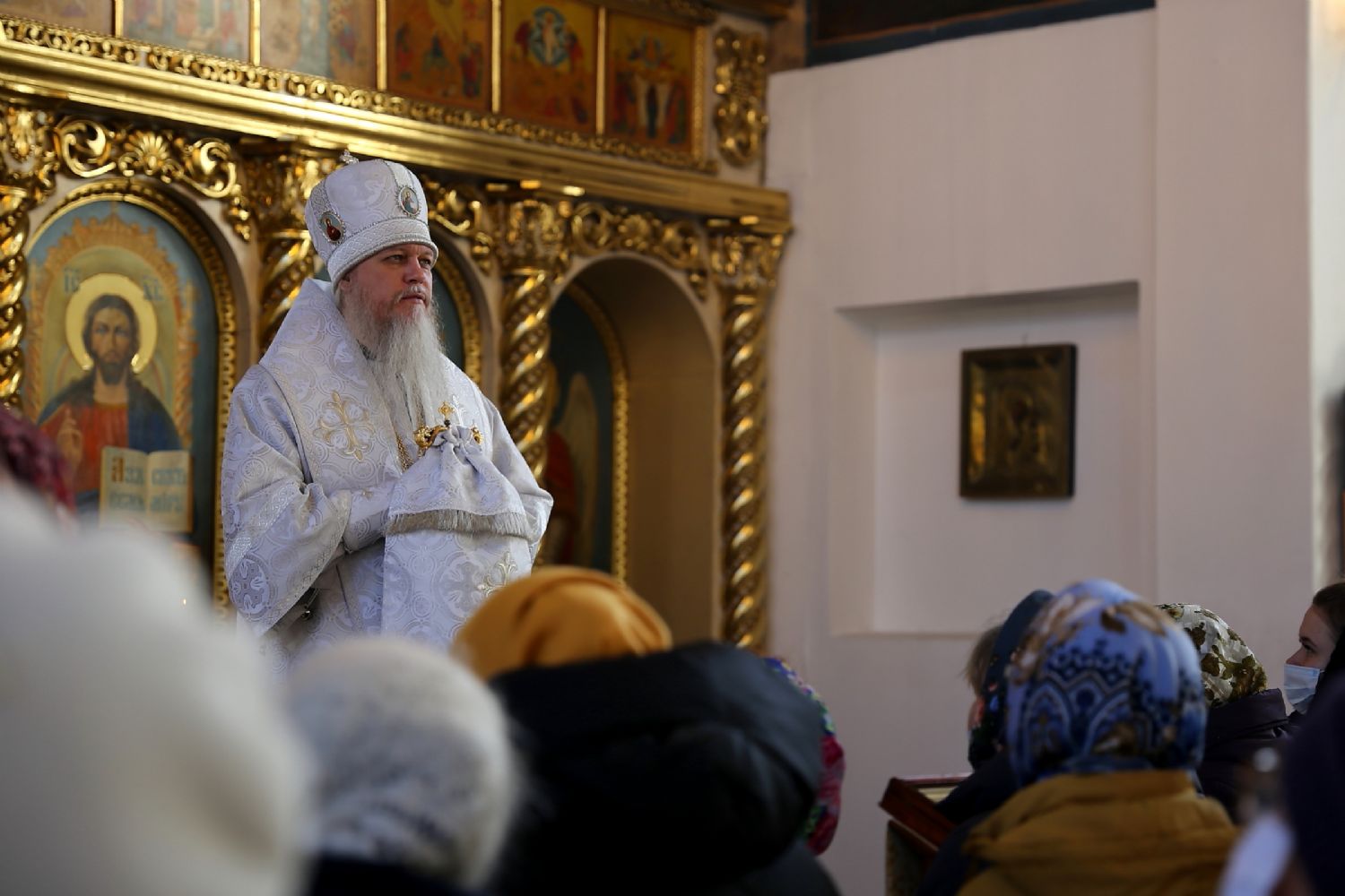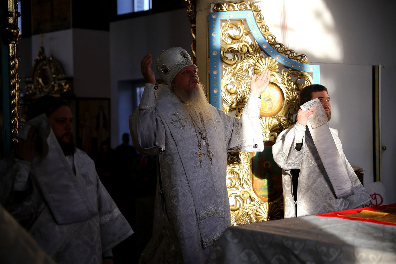 Владыке сослужили клирики собора: протоиерей Виталий Михеев, диакон Иоанн Захаров, диакон Андрей Легостаев. За богослужением пел соборный хор.