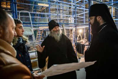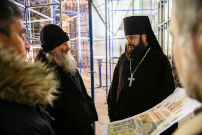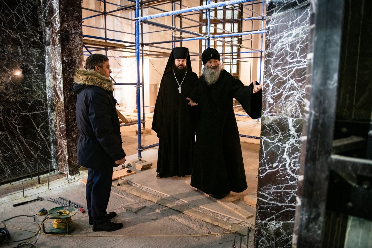 Наместник монастыря игумен Марк (Виленский) и главный инженер Казанской епархии Михаил Федотов ознакомили Его Высокопреосвященство с работами по устройству иконостасов Казанского собора. Во встрече принял участие подрядчик по живописному оформлению храма Вячеслав Пахомов.