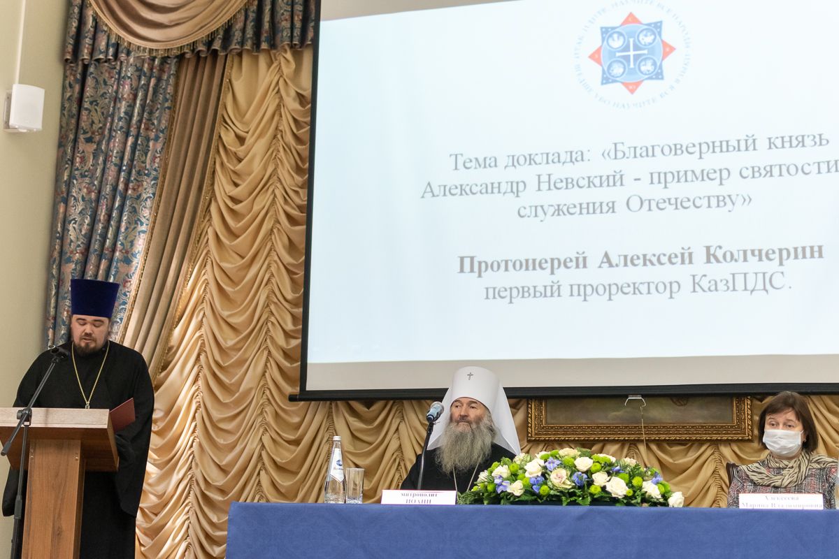 Далее были зачитаны приветствия от председателя Синодального ОРОиК епископа Бронницкого Евгения, Министра образования РТ Ильсура Хадиуллина и Министра культуры РТ Ирады Аюповой и прозвучали пленарные доклады: «Имя России: Александр Невский» (доктор исторических наук, профессор Светлана Никонова); «Благоверный князь Александр Невский — пример святости и служения Отечеству» (первый проректор Казанской духовной семинарии протоиерей Алексий Колчерин).