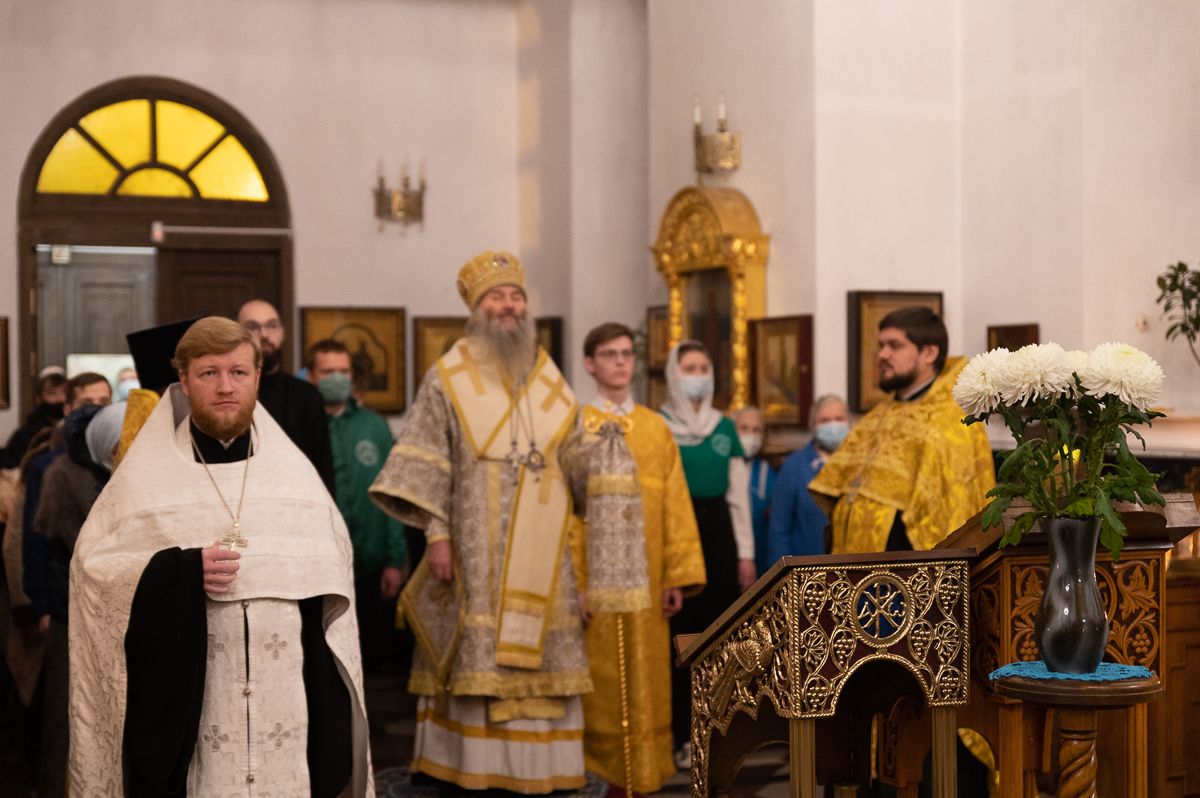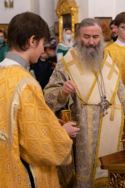 Его Высокопреосвященству сослужили клирики храма иерей Алексий Михеев, иерей Никита Иванов, иерей Вячеслав Булычев, диакон Александр Мельников и клирик храма Рождества Пресвятой Богородицы с. Семеновка протодиакон Михаил Козловский.