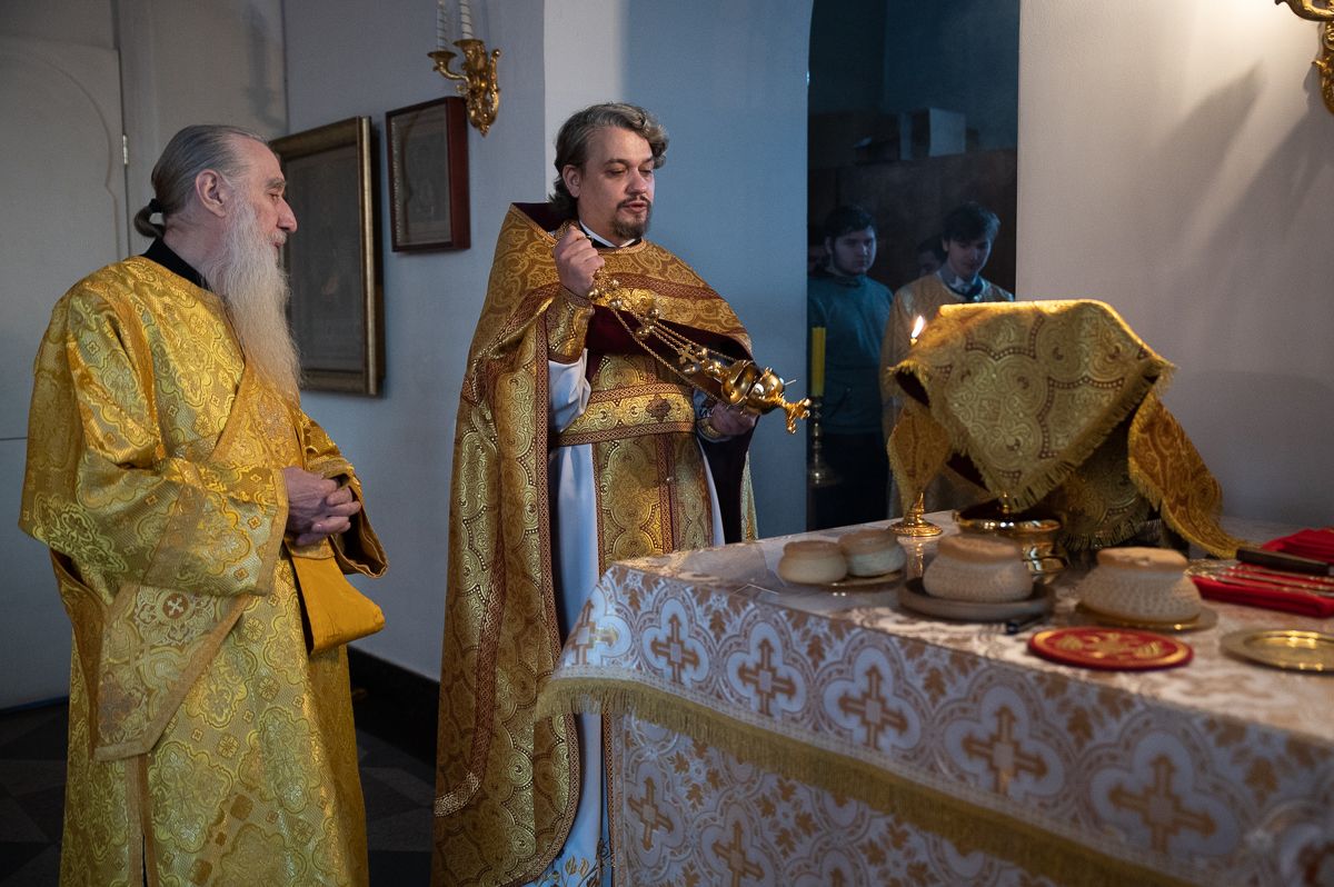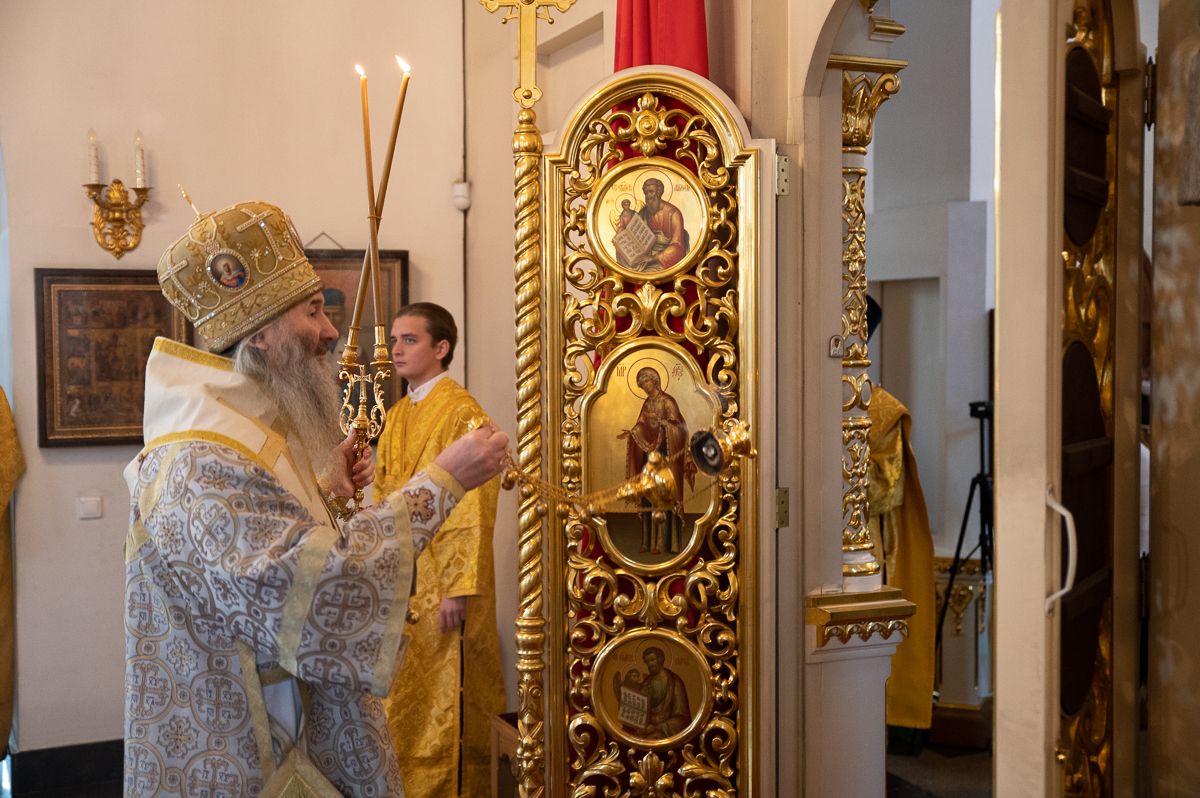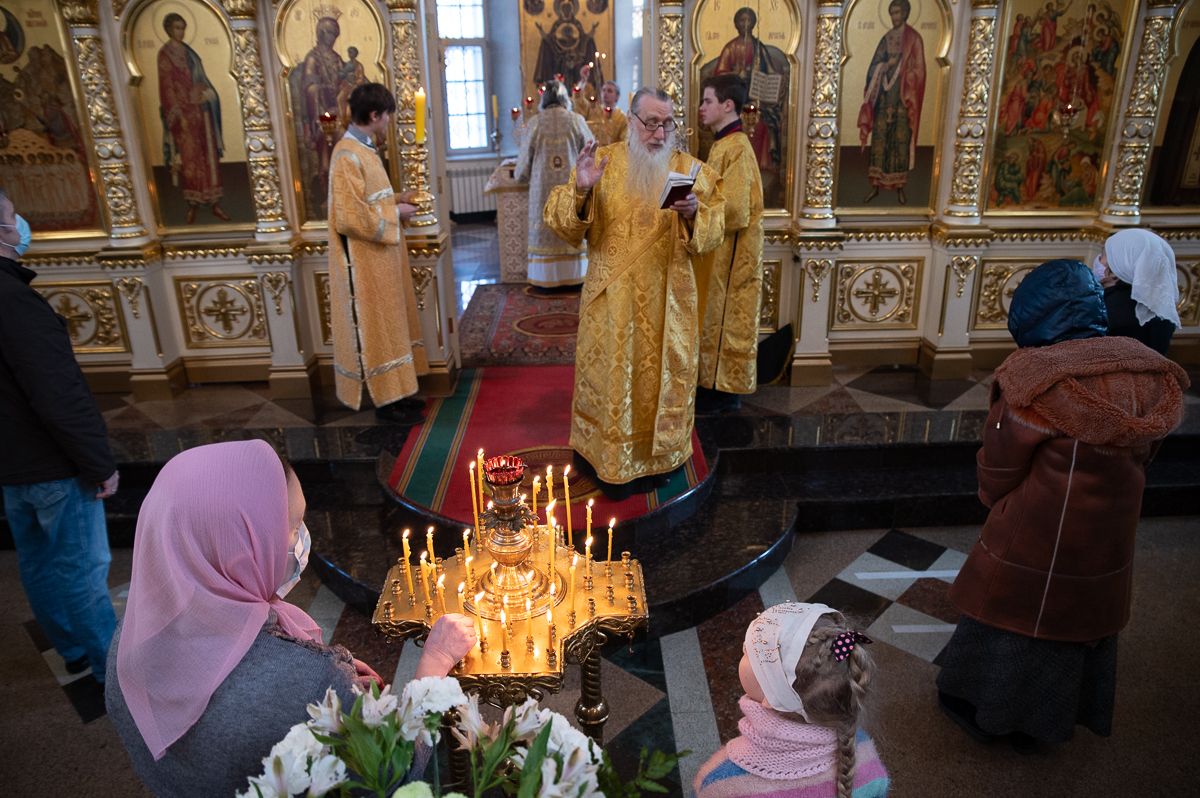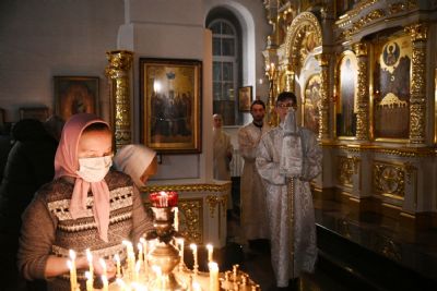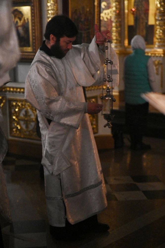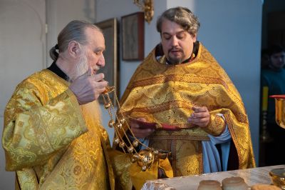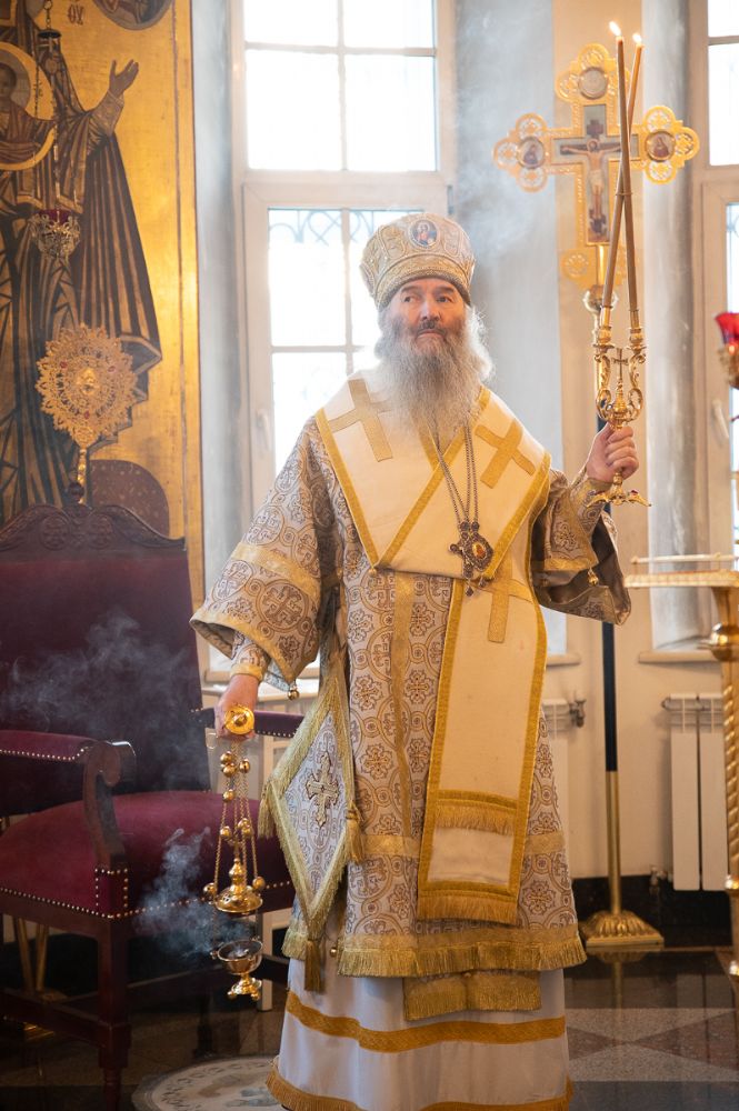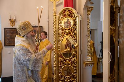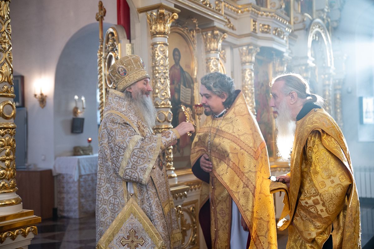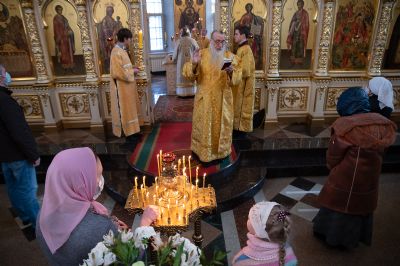 Его Высокопреосвященству сослужили настоятель храма иерей Александр Лоскутов и клирик храма Рождества Пресвятой Богородицы протодиакон Михаил Козловский. Песнопения исполнял хор храма под управлением регента Любови Торощиной.