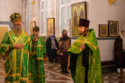 За Литургией Его Высокопреосвященству сослужили секретарь Йошкар-Олинского епархиального управления иеромонах Серафим (Пасанаев), клирик Успенского храма иерей Никита Иванов и клирик храма Рождества Богородицы с. Семёновка протодиакон Михаил Козловский. Песнопения исполнял детско-юношеский хор «Благовест» под руководством регента Татьяны Черновой.