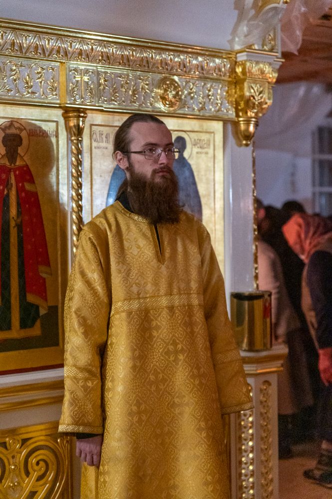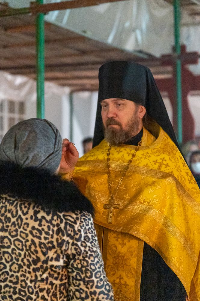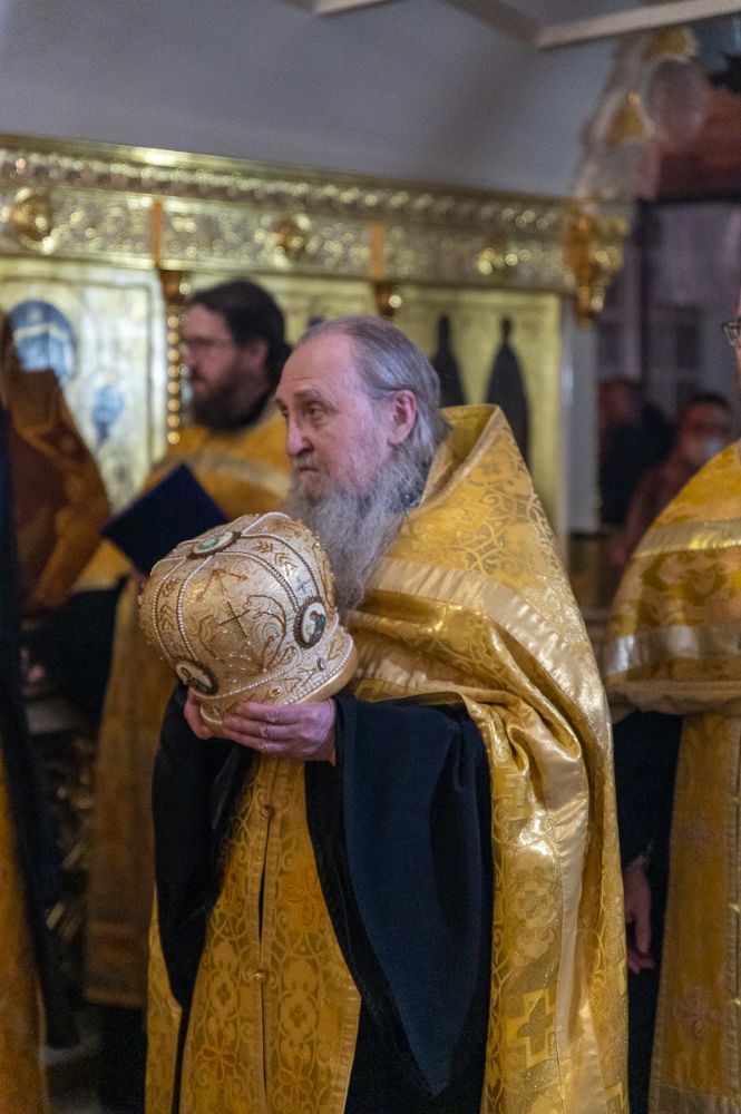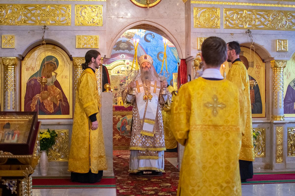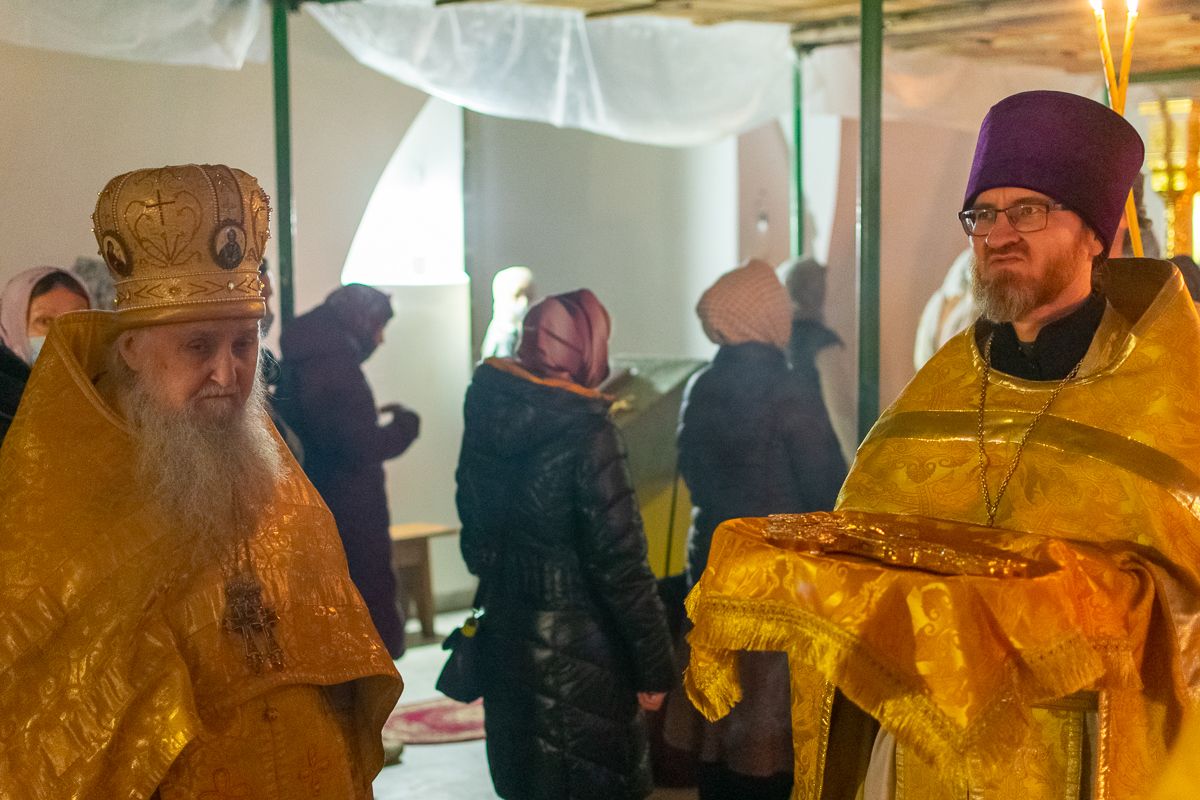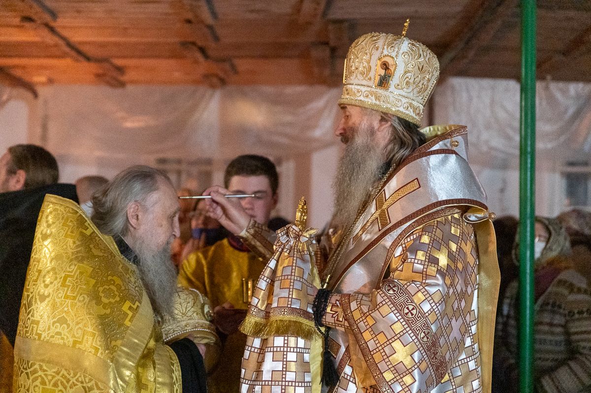Его Высокопреосвященству сослужили секретарь Йошкар-Олинского епархиального управления иеромонах Серафим (Пасанаев), настоятель Вознесенского собора г. Йошкар-Олы протоиерей Евгений Кутырев, клирики собора иереи Владимир Глебов, Александр Деревяшкин, диакон Сергий Метелев и клирик храма Рождества Пресвятой Богородицы с. Семеновка протодиакон Михаил Козловский. Песнопения исполнял хор храма под руководством регента Анны Ярошевич.