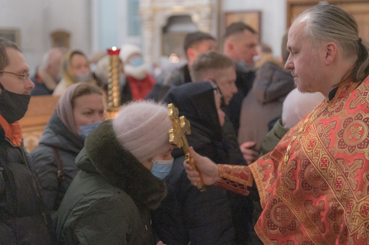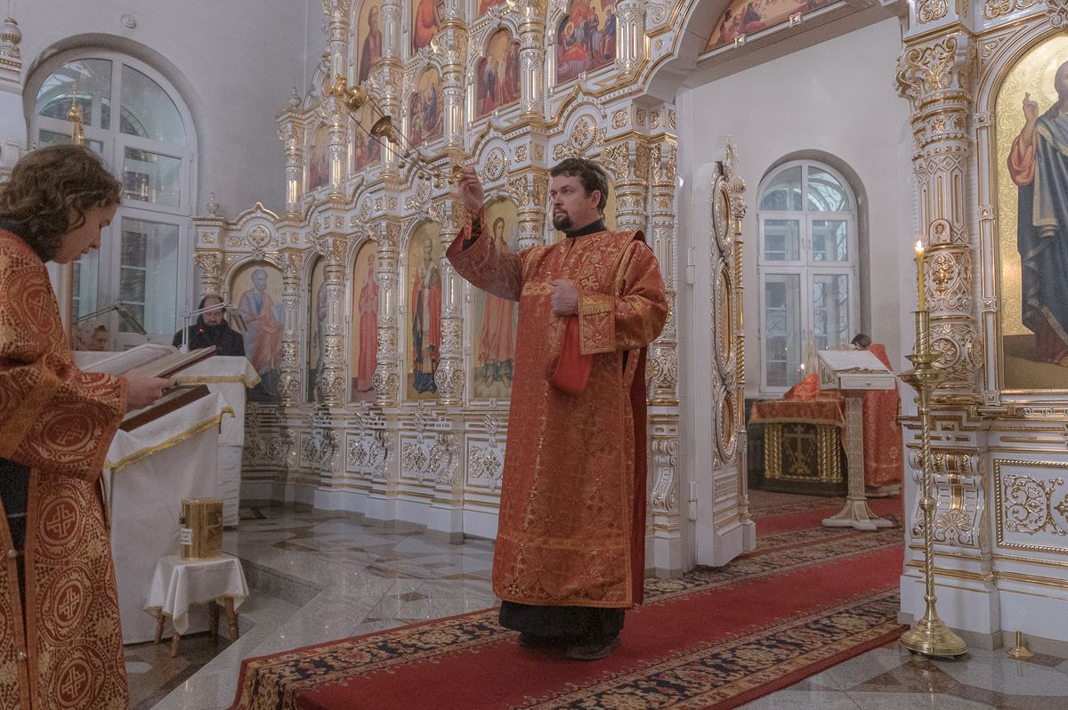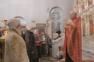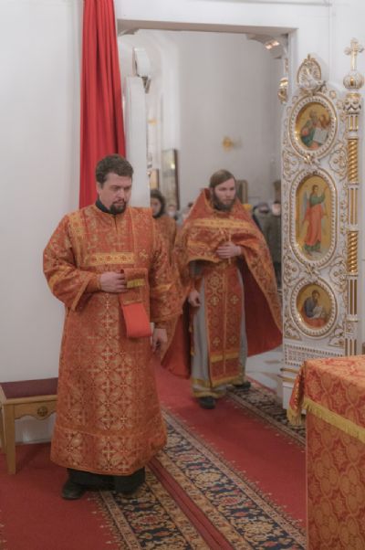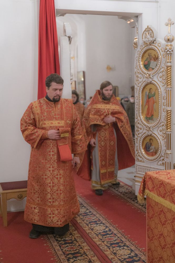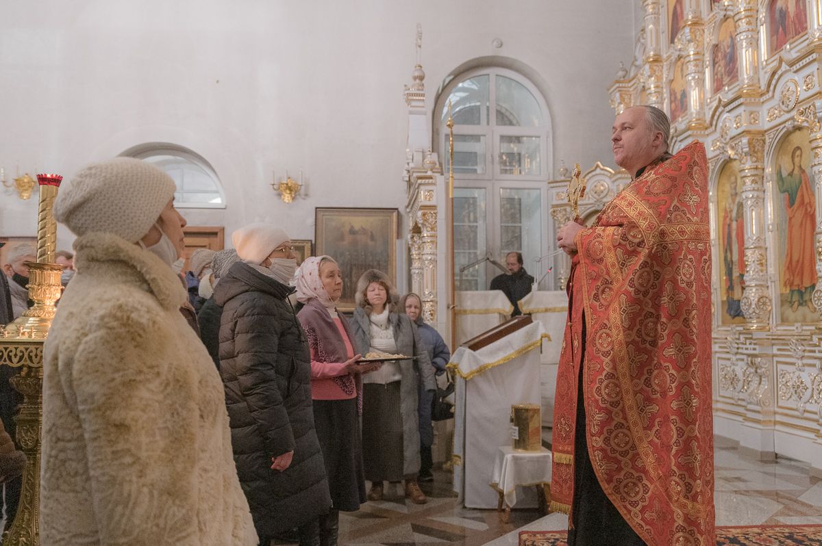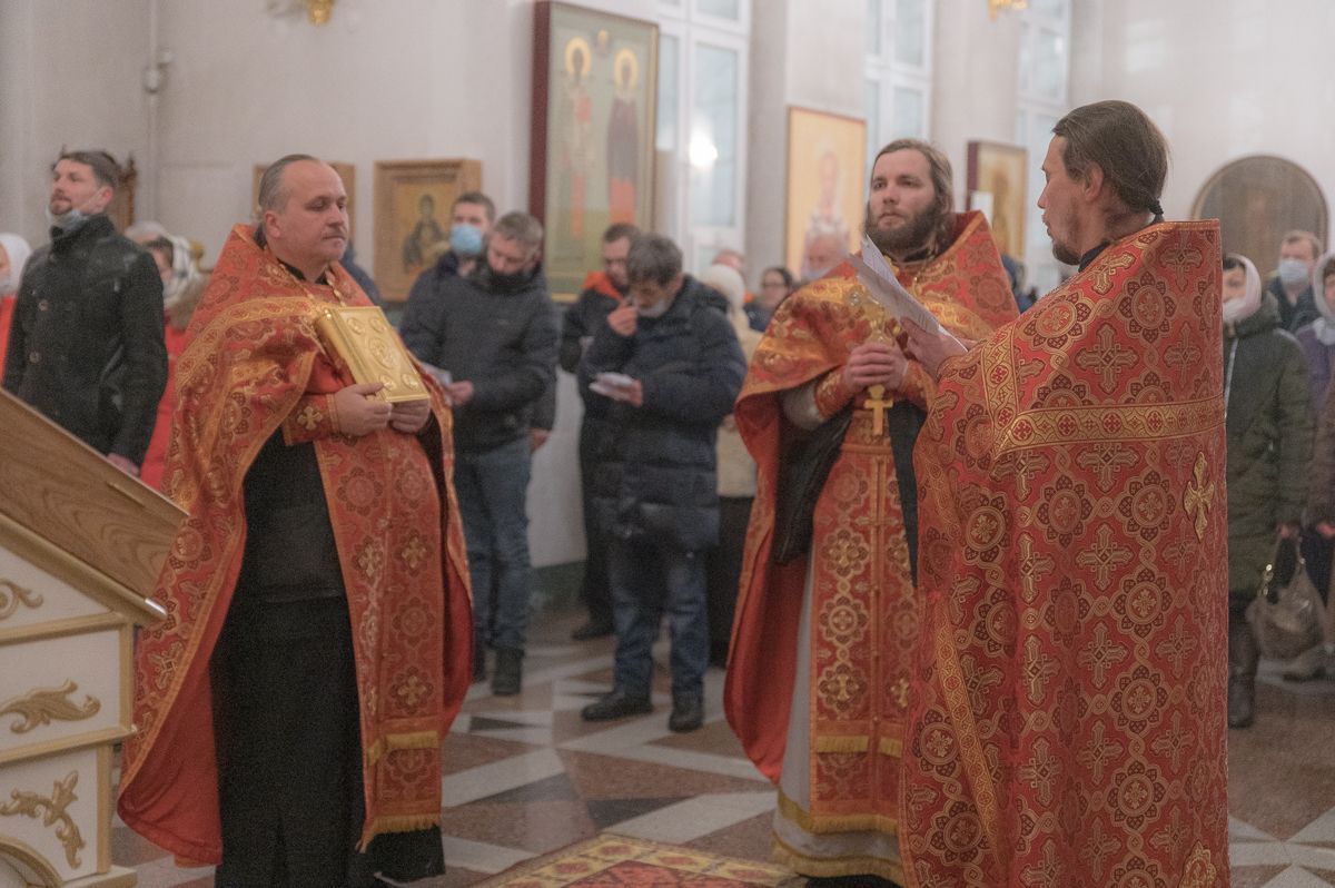 Богослужение возглавил настоятель собора иерей Алексей Кирюшкин в сослужении духовенства собора. Песнопения исполнял хор под руководством регента Алисы Вылегжаниной.