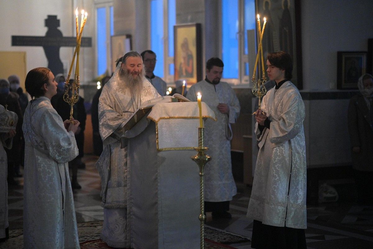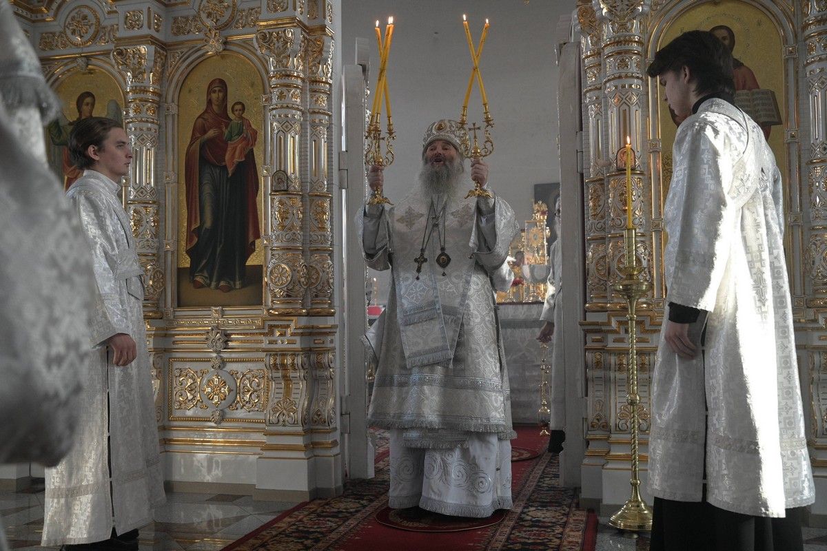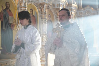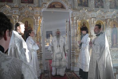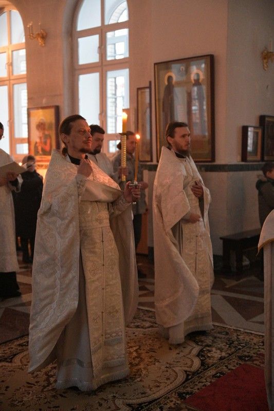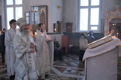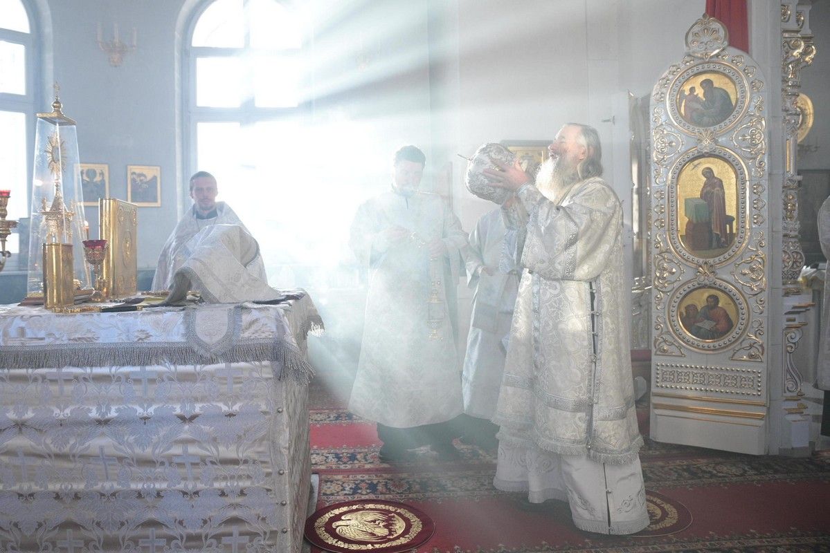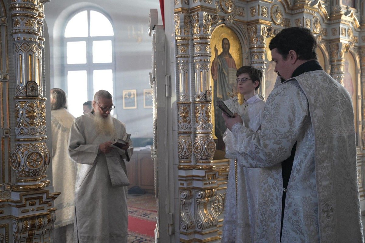 Владыке сослужили клирики собора иерей Андрей Кочаков, иерей Димитрий Лукьянов, диакон Алексий Кузнецов и клирик храма Рождества Пресвятой Богородицы с. Семеновка протодиакон Михаил Козловский. Песнопения исполнял хор собора под управлением регента Алисы Вылегжаниной.