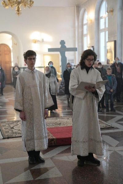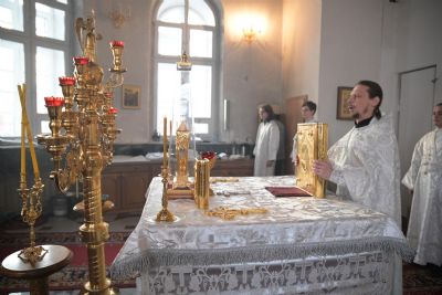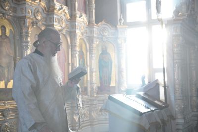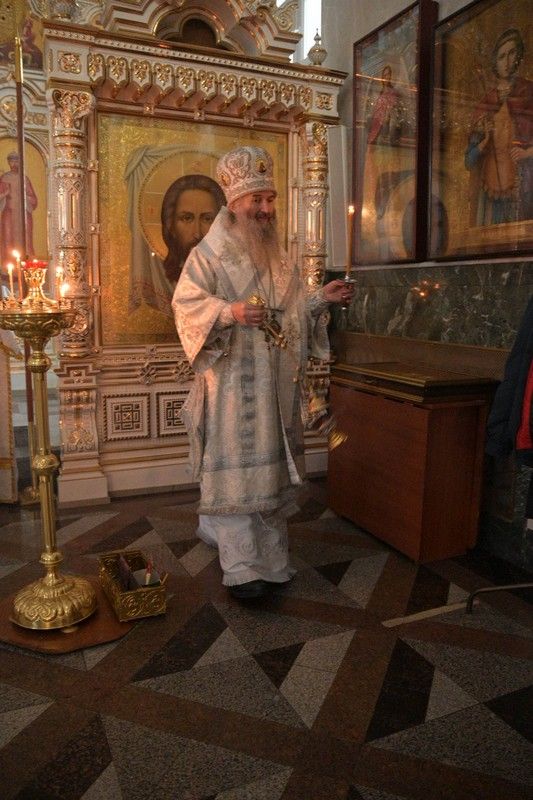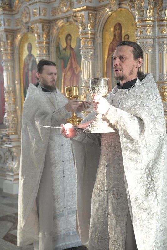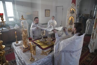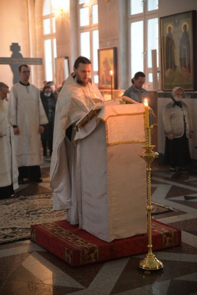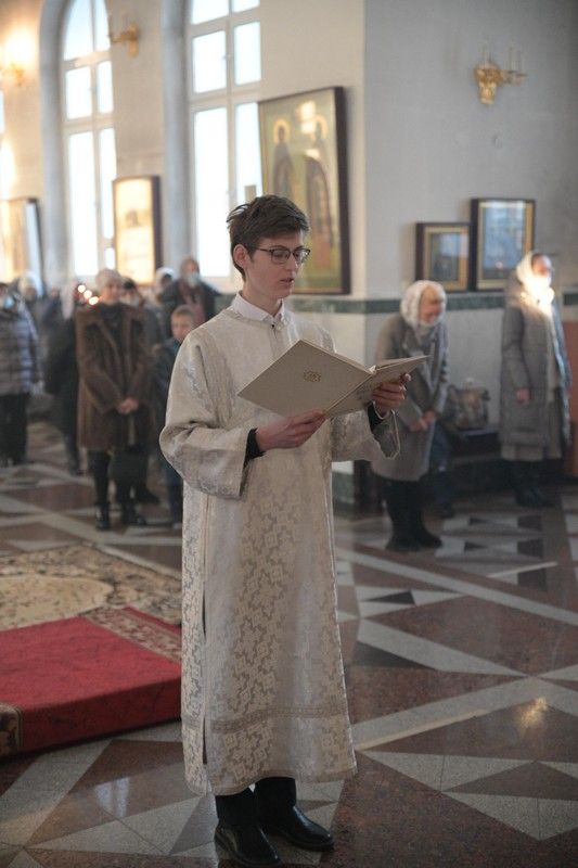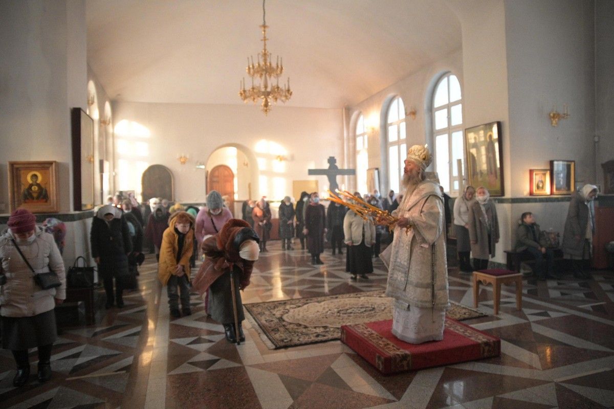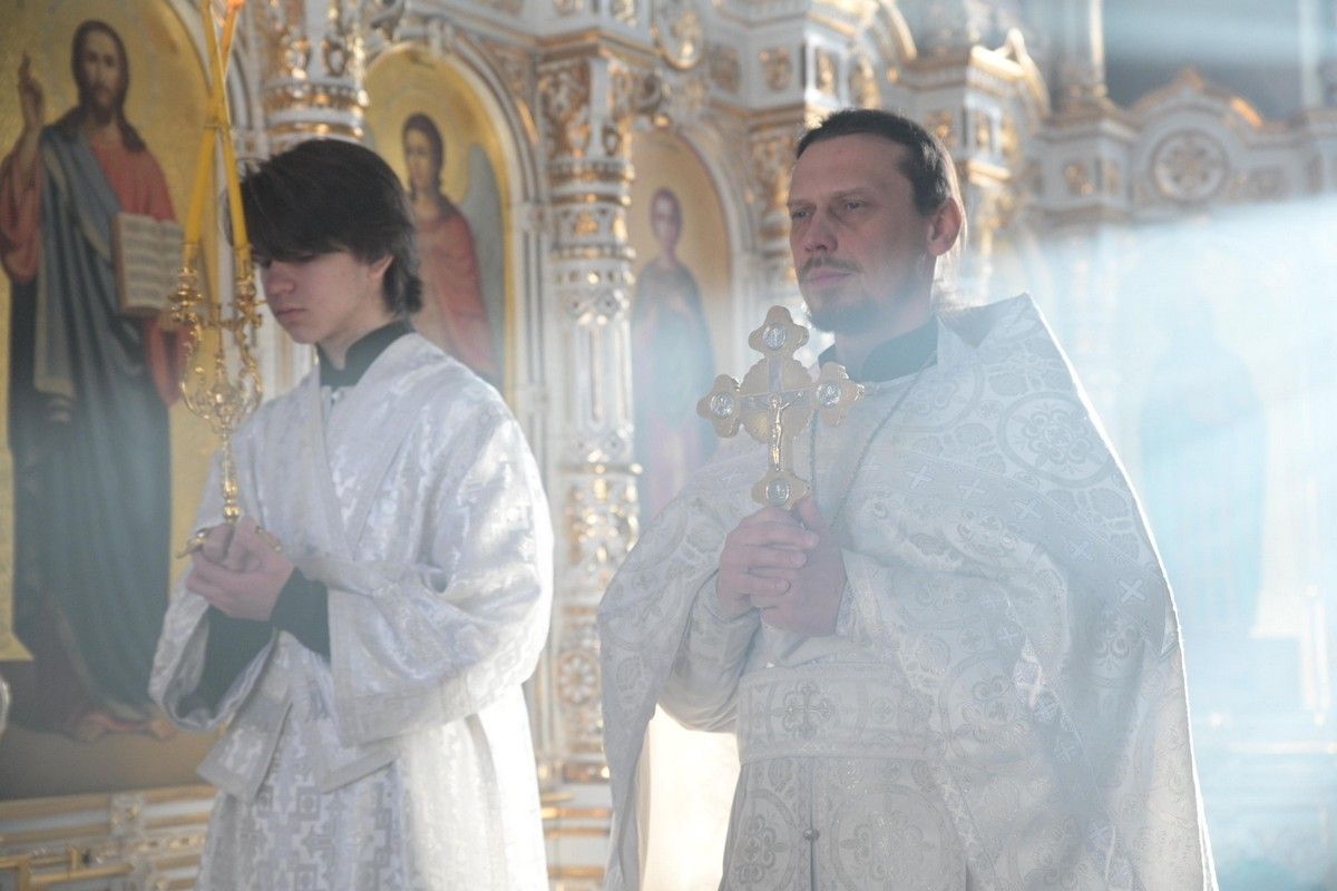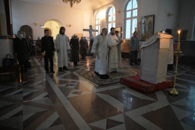 Владыке сослужили клирики собора иерей Андрей Кочаков, иерей Димитрий Лукьянов, диакон Алексий Кузнецов и клирик храма Рождества Пресвятой Богородицы с. Семеновка протодиакон Михаил Козловский. Песнопения исполнял хор собора под управлением регента Алисы Вылегжаниной.