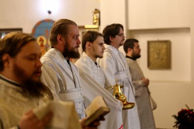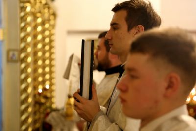 Его Преосвященству сослужили клирики кафедрального собора. Богослужебные песнопения исполнил архиерейский хор. В Литургии участвовал детско-юношеский хор.
