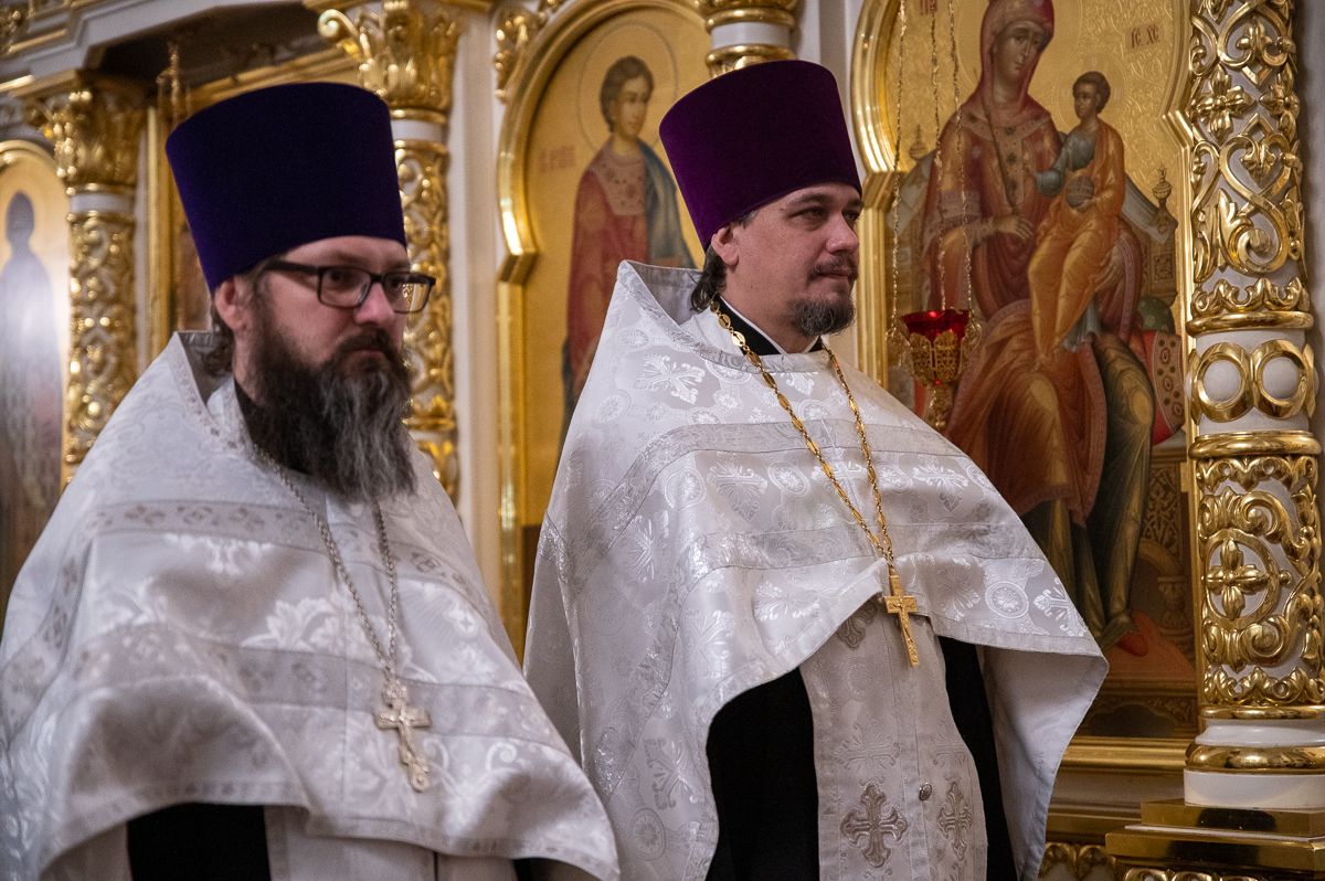 Архипастырю сослужили секретарь Йошкар-Олинского епархиального управления иеромонах Серафим (Пасанаев), настоятель храма иерей Александр Лоскутов, клирики храма иереи Никита Смирнов, Димитрий Дьяков, Евгений Симаков, диакон Артемий Бобоч и клирик храма Рождества Пресвятой Богородицы с. Семеновка протодиакон Михаил Козловский. Песнопения исполняли два хора под руководством регентов Наталии Поповой и Любови Торощиной.