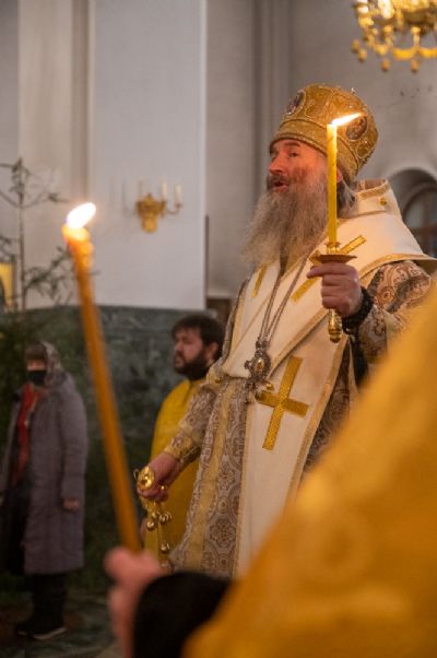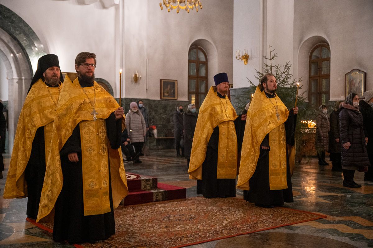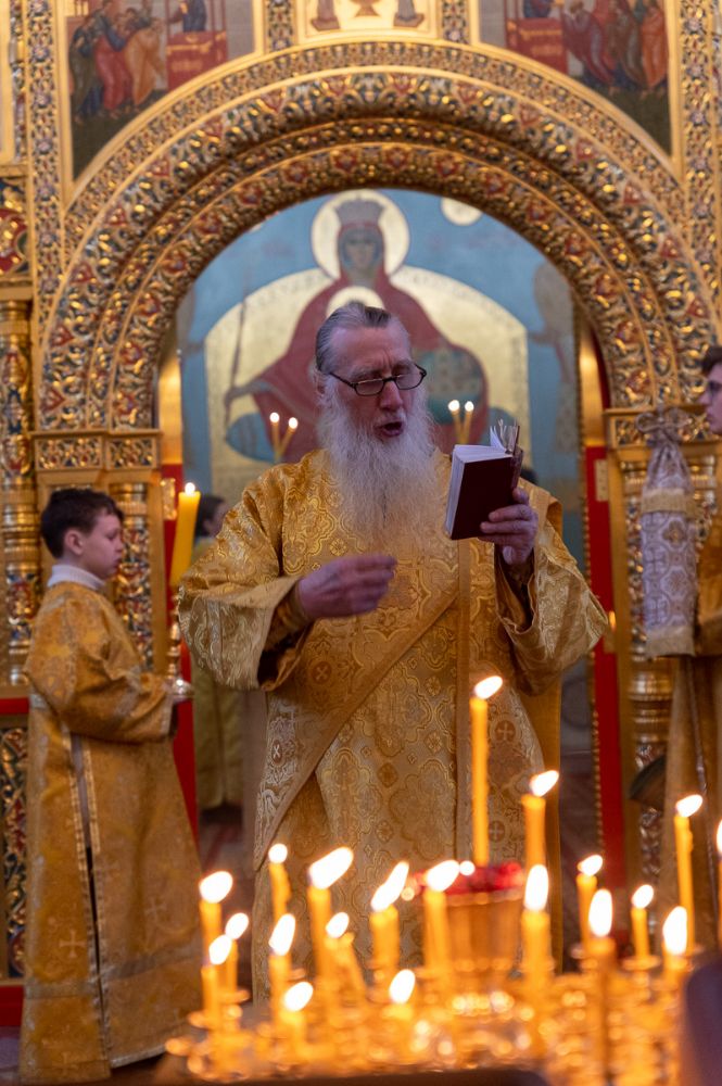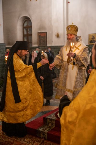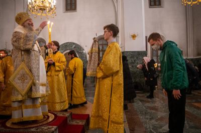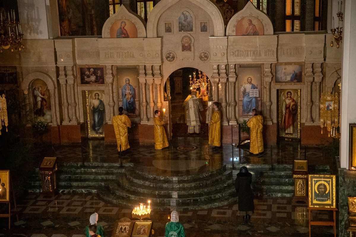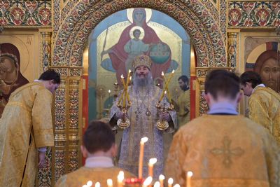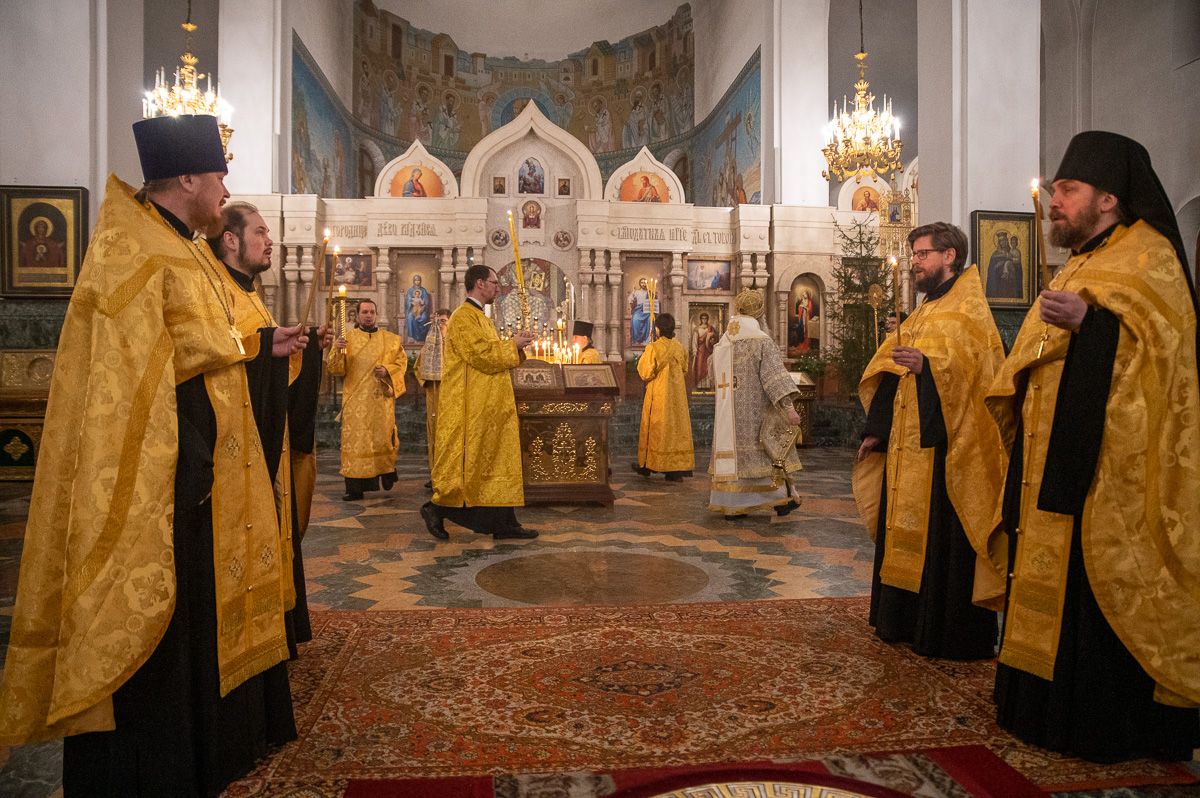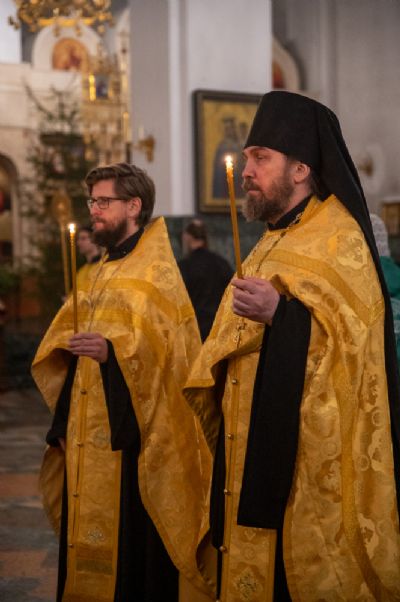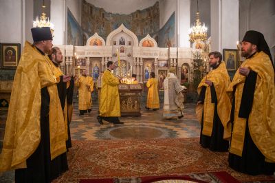 Вечером Его Высокопреосвященству сослужили секретарь Йошкар-Олинского епархиального управления иеромонах Серафим (Пасанаев), ключарь собора протоиерей Сергий Поглазов, клирики собора иереи Евгений Самойлов, Александр Староверов, диакон Игорь Коваль и клирик храма Рождества Пресвятой Богородицы с. Семеновка протодиакон Михаил Козловский. Песнопения исполнял детско-юношеский хор «Благовест» под руководством регента Надежды Поздеевой.
