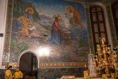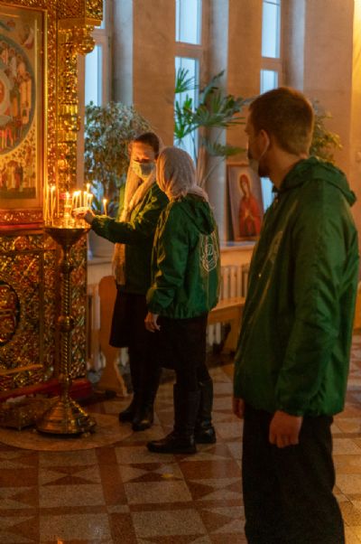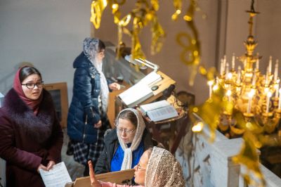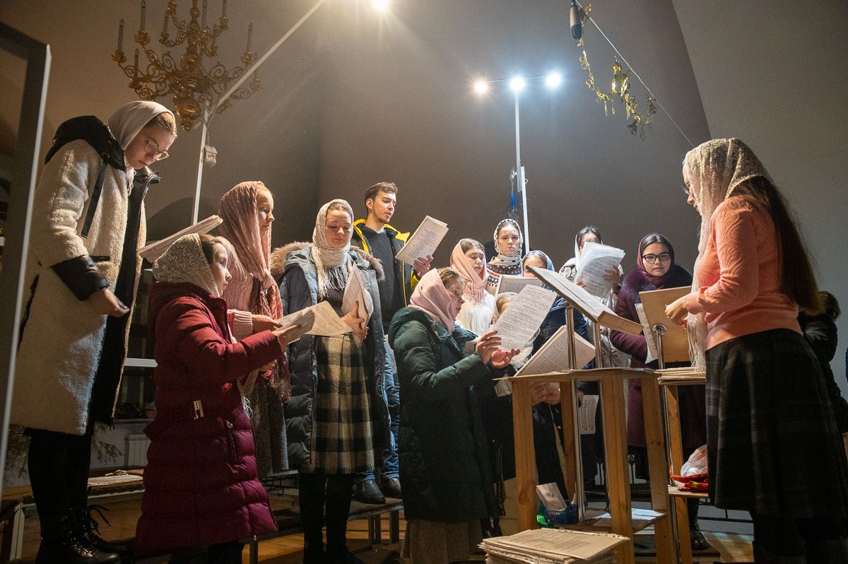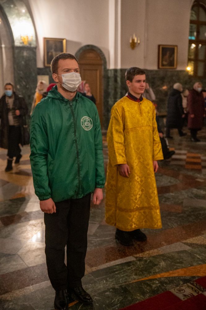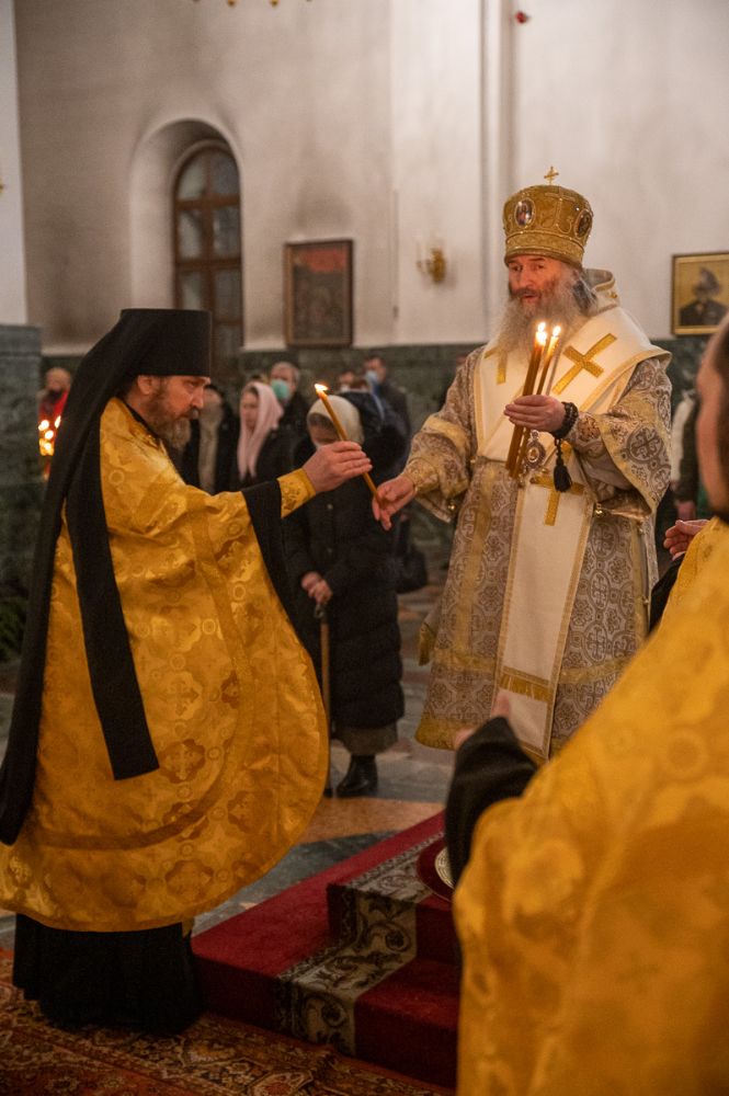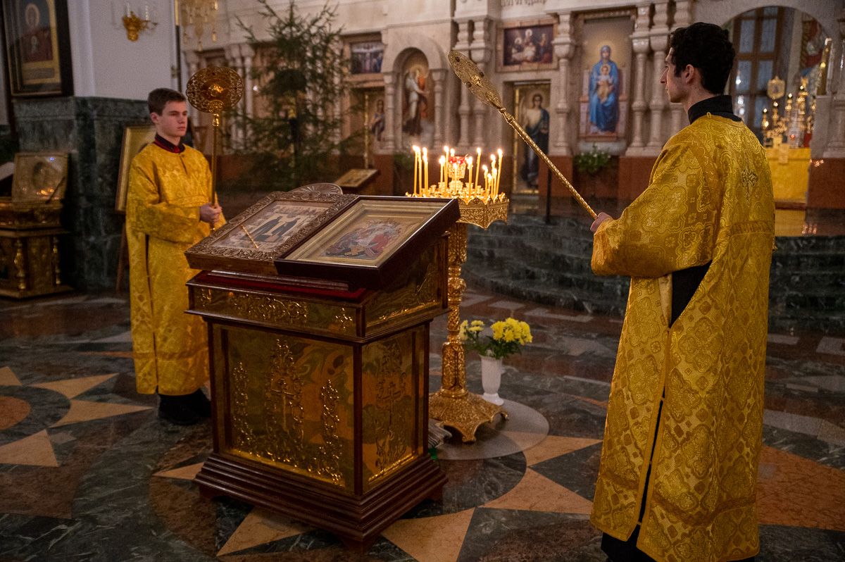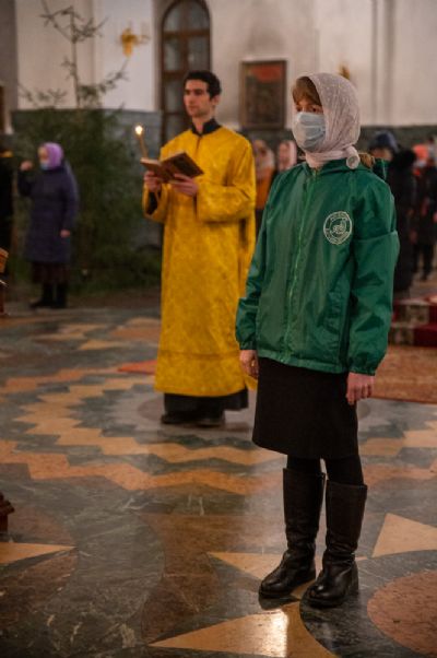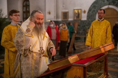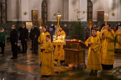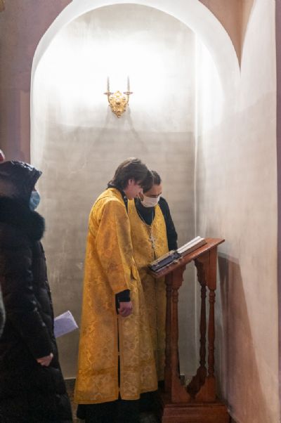 Вечером Его Высокопреосвященству сослужили секретарь Йошкар-Олинского епархиального управления иеромонах Серафим (Пасанаев), ключарь собора протоиерей Сергий Поглазов, клирики собора иереи Евгений Самойлов, Александр Староверов, диакон Игорь Коваль и клирик храма Рождества Пресвятой Богородицы с. Семеновка протодиакон Михаил Козловский. Песнопения исполнял детско-юношеский хор «Благовест» под руководством регента Надежды Поздеевой.