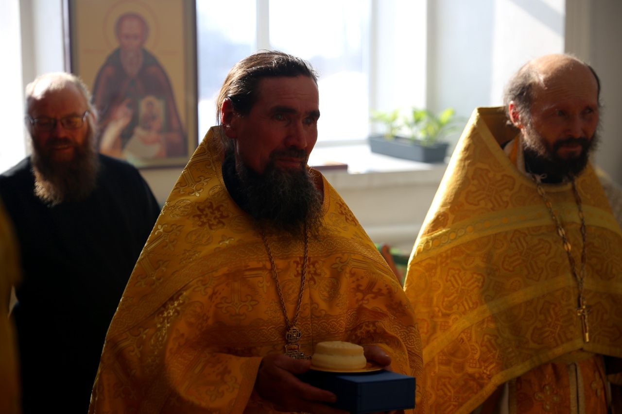 В завершение владыка Феофан поздравил настоятеля Никольского храма протоиерея Александра Милютина с днем рождения и с 25-летием священнической хиротонии и подарил ему наперсный крест с украшениями.