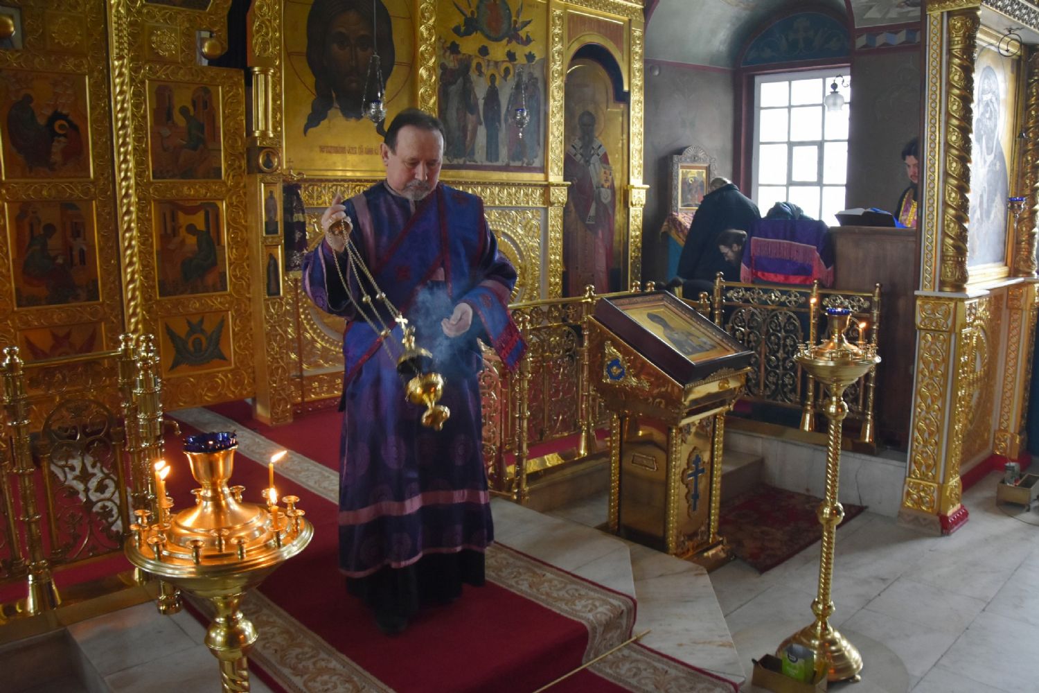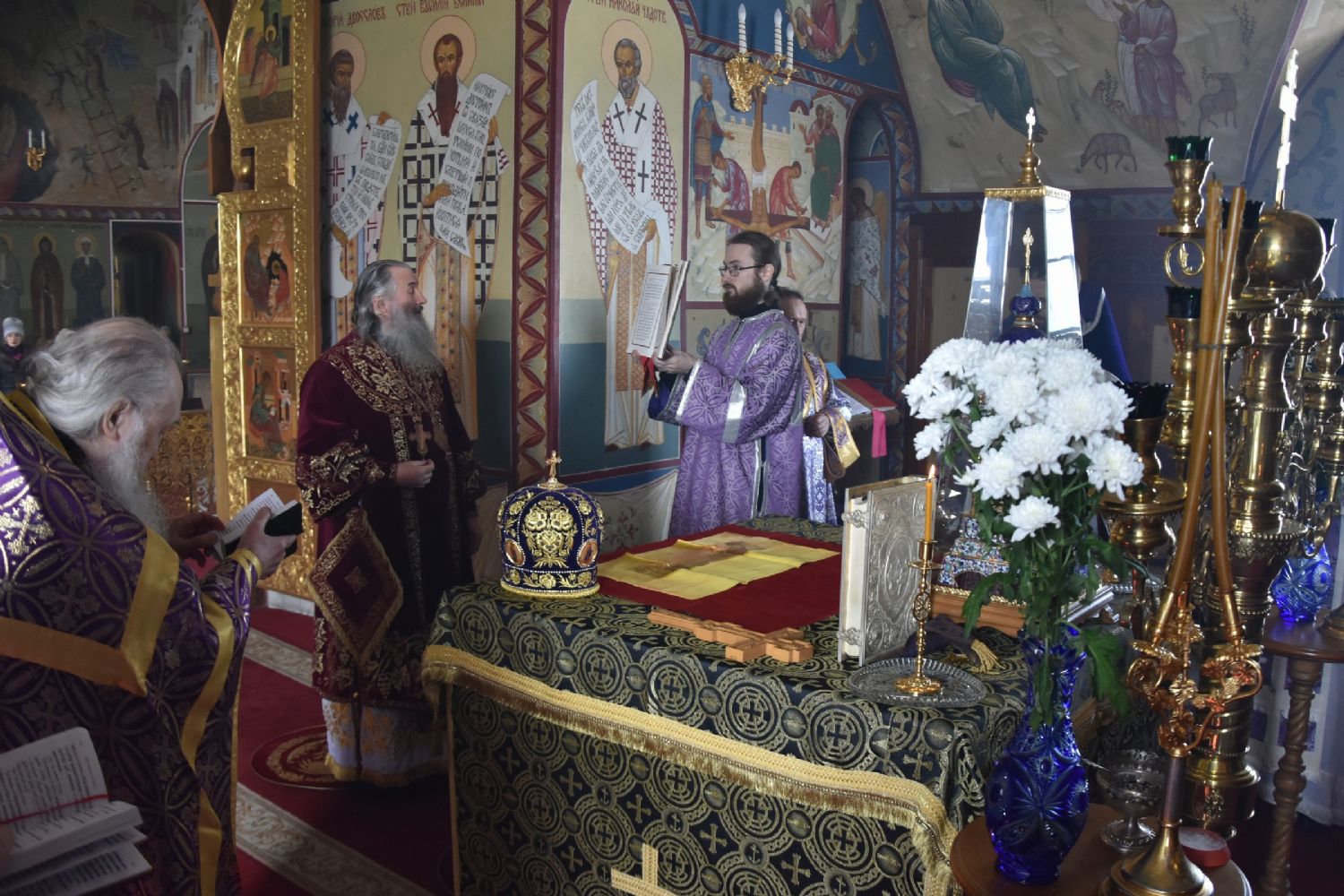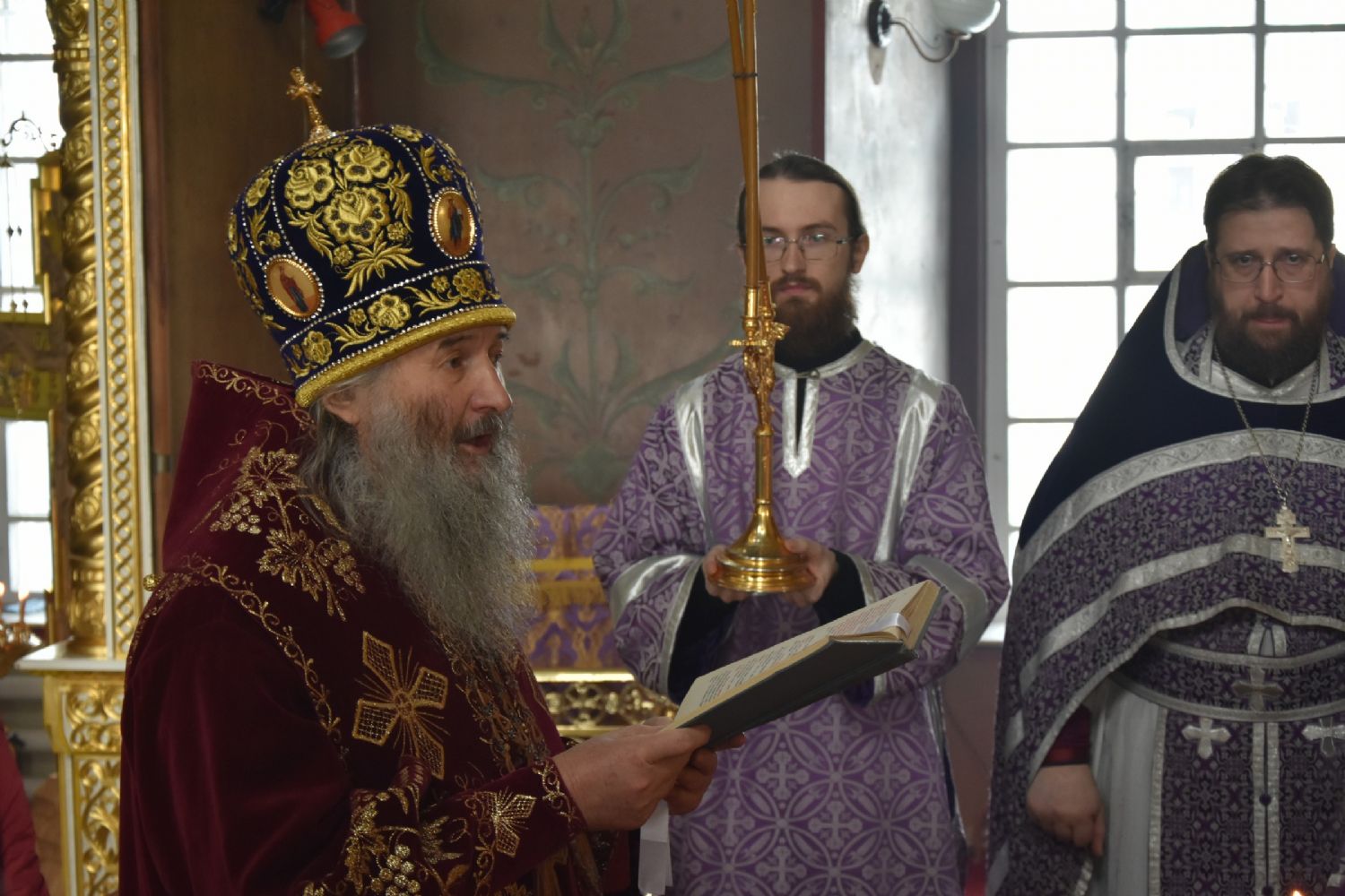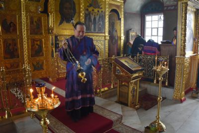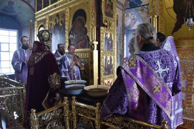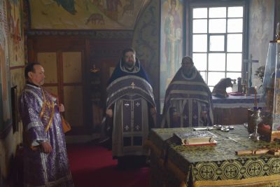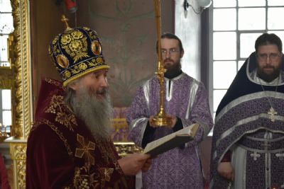 Его Высокопреосвященству сослужили настоятель собора митрофорный протоиерей Евгений Кутырев, клирики храма Владимир Камышев, Александр Деревяшкин, Димитрий Копылов, протодиакон Александр Конокпаев и клирик храма Рождества Пресвятой Богородицы с. Семеновка протодиакон Михаил Козловский.