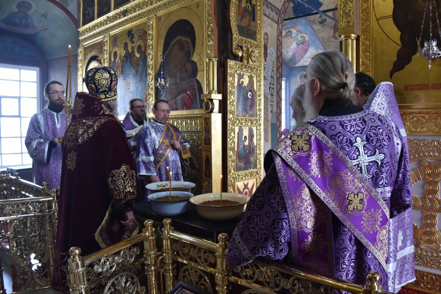 По заамвонной молитве перед Царскими вратами духовенство совершило молебный канон великомученику Феодору Тирону, и Владыка освятил коливо.