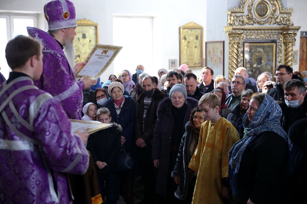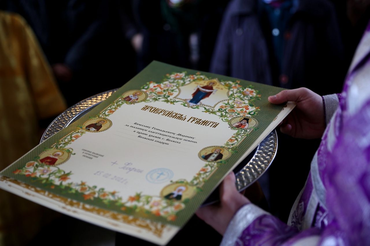 В завершение владыка Феофан наградил Архиерейскими и Благодарственными грамотами благотворителей и работников собора за труды на благо и укрепление духовной жизни как Волжской епархии, так и прихода Никольского собора.